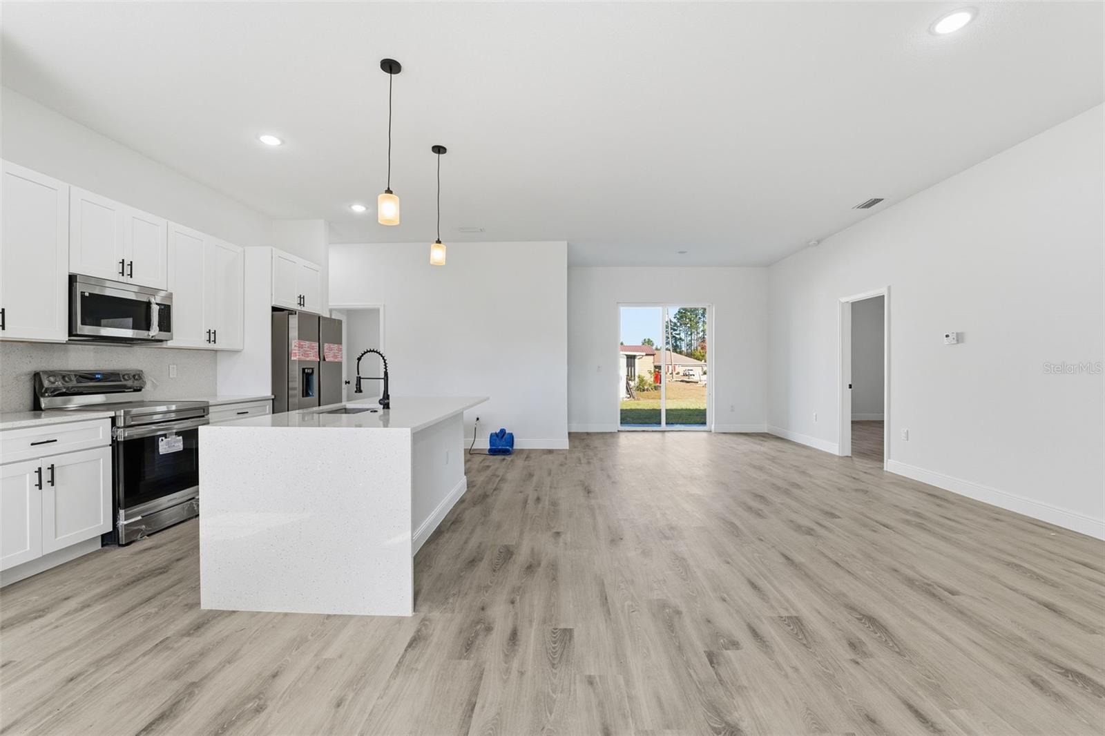 Brand-new 2026 single-level home in Ocala, FL 34473 on a spacious corner lot with no HOA, ideal for buyers searching for new construction homes in Ocala with open floor plans. This modern, move-in-ready residence features an open-concept kitchen with quartz countertops, full quartz backsplash, stainless steel appliances, soft-close cabinetry, and a large center island, flowing seamlessly into bright living and dining areas. Wide-plank flooring, recessed LED lighting, and contemporary finishes enhance everyday comfort and style. The primary bedroom on the main level offers a walk-in closet and a spa-inspired bath with dual sinks, quartz surfaces, sleek black fixtures, and a glass-enclosed shower. Secondary bedrooms provide flexible space for guests, home office, or family needs. A covered rear lanai overlooks a generous backyard with no fence or pool restrictions, perfect for creating outdoor living in Florida’s year-round climate. Located in Southwest Ocala near SW 76th Ct, this home offers convenient access to SR 200, I-75, shopping centers, grocery stores, medical offices, dining, and daily conveniences, making it ideal for buyers seeking single-story homes near Marion Oaks and Southwest Ocala. Combining new-build efficiency, no HOA freedom, and a large corner lot, this Ocala new construction delivers long-term value and modern Florida living.