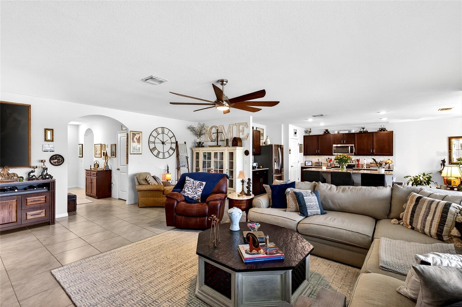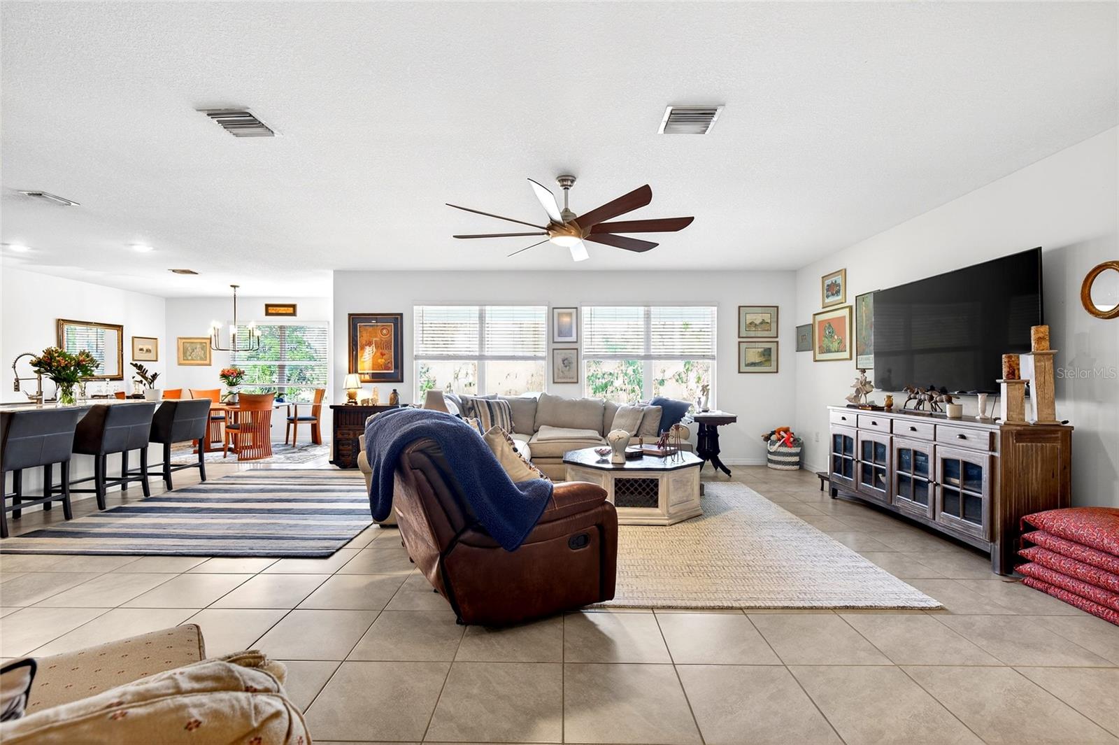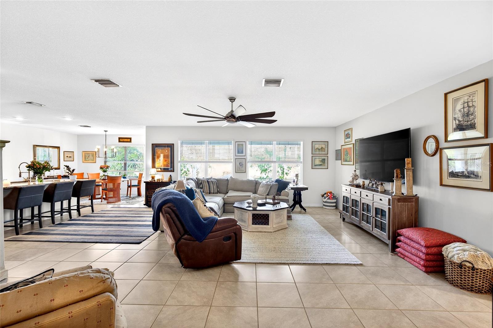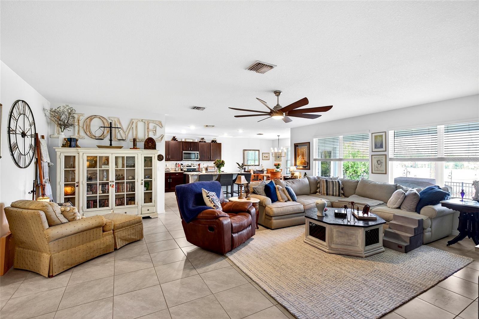 One or more photo(s) has been virtually staged. DR HORTON DENTON MODEL ON THE LAKE DIAMOND GOLF COURSE WITH FENCED IN BACKYARD AND 50 AMP RV HOOK UP! LOADS OF UPGRADES IN THIS HOME SEPARATING IT FROM THE COMPETITION SUCH AS WHOLE HOME ALL NEW CEILING FANS AND LIGHTING, HYBRID HOT WATER HEATER, SOLAR PANELS ON THE ROOF, EXPANDABLE WALL ELECTRIC TESLA CAR CHARGING STATION, CUSTOM BACKSPLASH IN KITCHEN AND FRENCH DOORS LEADING TO COVERED LANAI. THIS 4 BEDROOM PLAN HAS IT ALL AND IS ON THE GOLF COURSE! STEP INSIDE THE HOME AND TO LEFT IS 3 SPACIOUS BEDROOMS, INSIDE LAUNDRY ROOM WITH STORAGE SHELVING AND THE 2ND BATH WITH GRANITE TOP VANITY AND COMBO TUB/SHOWER. ACROSS FROM THIS AREA IS THE CAR GARAGE HOME TO THE CHARGING STATION. WALKING TOWARDS FOCAL POINT OF THIS OPEN FLOOR PLAN IS LARGE LIVING ROOM WITH MOUNTED TV THAT STAYS WITH THE HOME. POSITIONED BEHIND THE LIVING ROOM IS THE PRIVATE AND SPACIOUS PRIMARY BEDROOM WITH CUSTOM WALK IN CLOSET AND PRIMARY FEATURING WALK IN SHOWER WITH GLASS DOOR AND DOUBLE GRANITE TOP VANITY. THE LIVING ROOM OVERLOOKS THE INVITING KITCHEN WITH SOFT CLOSE CABINET DOORS, PULL OUTS FOR EASY ACCESS AND DRAWERS, COFFEE BUTLER AREA, ISLAND WITH UPGRADED SINK AND FAUCET AND STAINLESS STEEL APPLIANCES, GRANITE COUNTERTOPS AND BACKSPLASH. DINING AREA CURRENTLY A READING AREA. KITCHEN HAS AN ADDITIONAL AREA FOR DINING SET UP AS A BREAKFAST AREA LEADING TO UPGRADED FRENCH DOORS TO COVERED LANAI WITH ANOTHER MOUNTED TV THAT STAYS. THE LANAI OVERLOOKS THE FENCED IN YARD, GREEN SPACE AND GOLF COURSE. LOW HOA OF $56/MONTH. SOLAR PANELS ALLOW NO POWER BILLS AND ALLOW YOU TO SELL POWER BACK TO DUKE. 4 ADDITIONAL PANELS WERE ADDED FOR GOLF CART AND ELECTRIC CAR FOR PLENTY OF CHARGE! ASK FOR DETAILS!