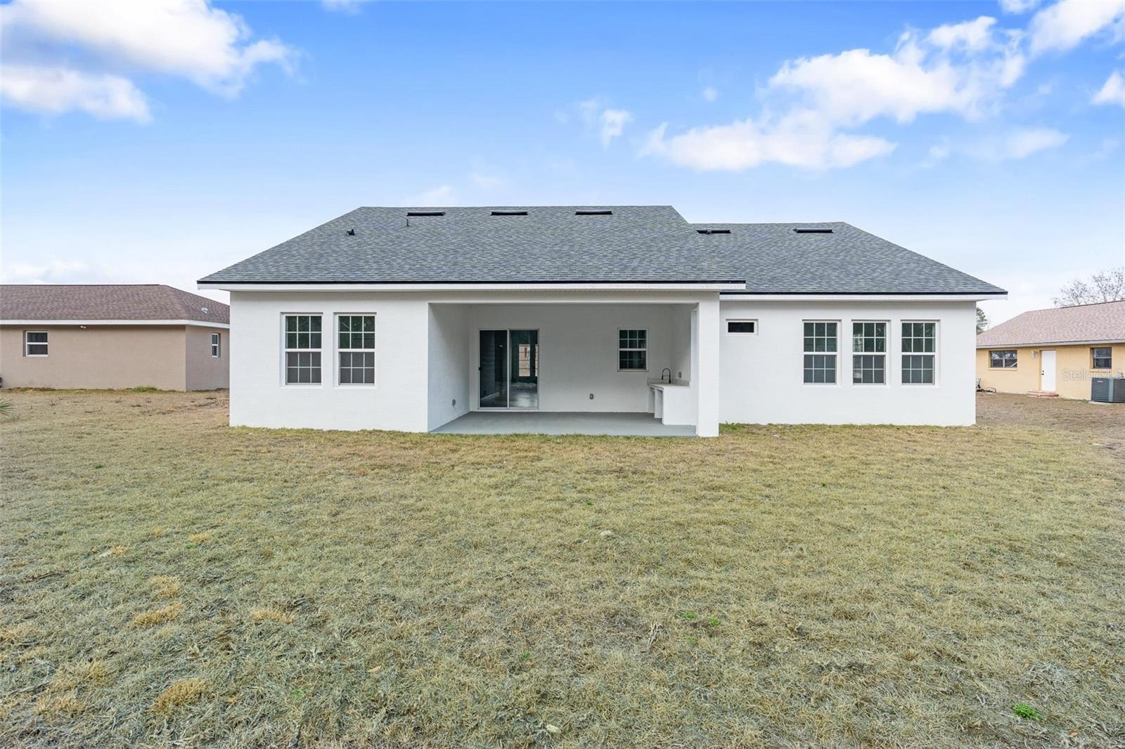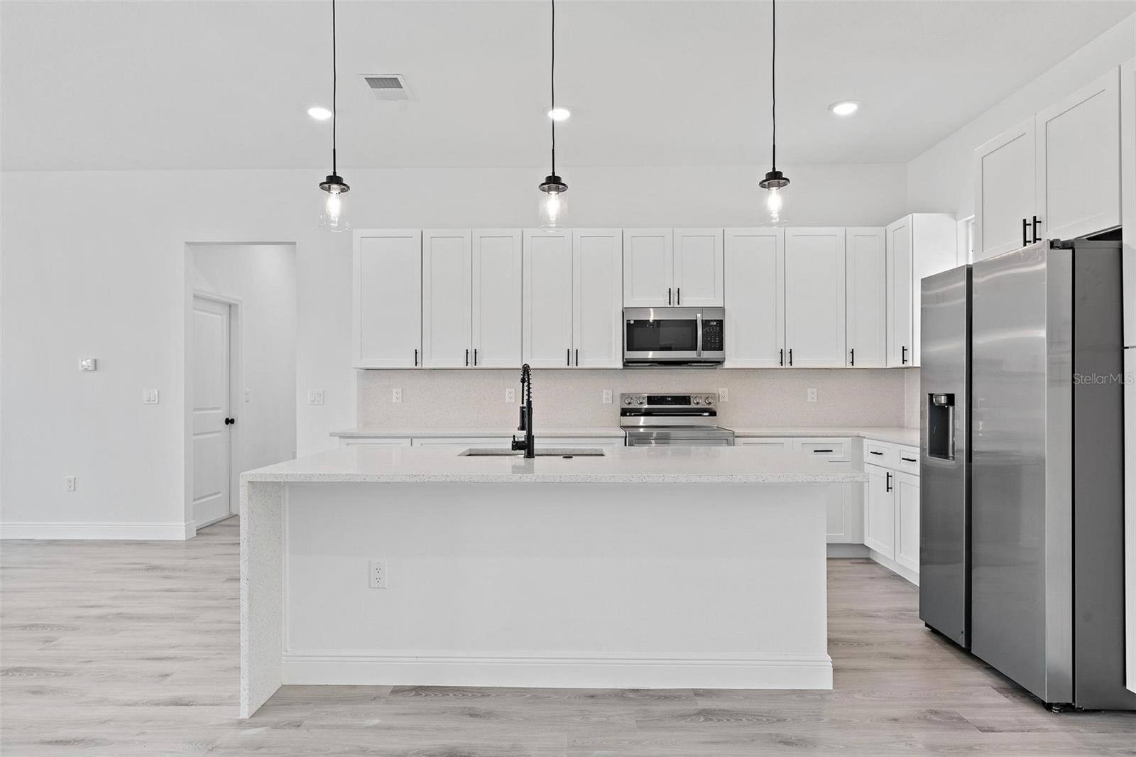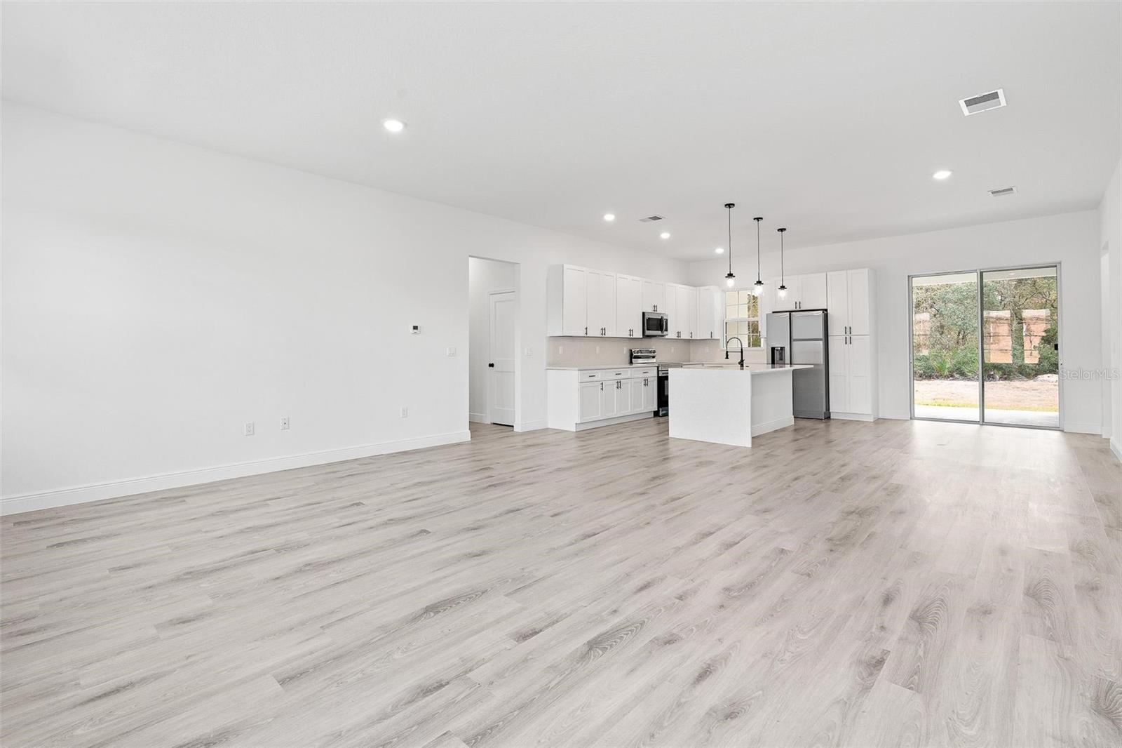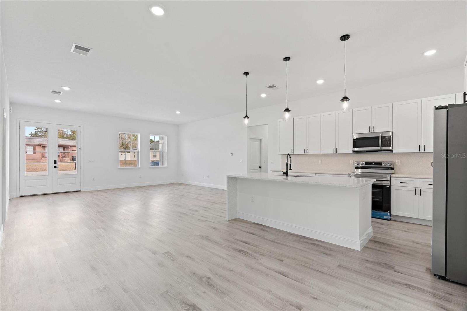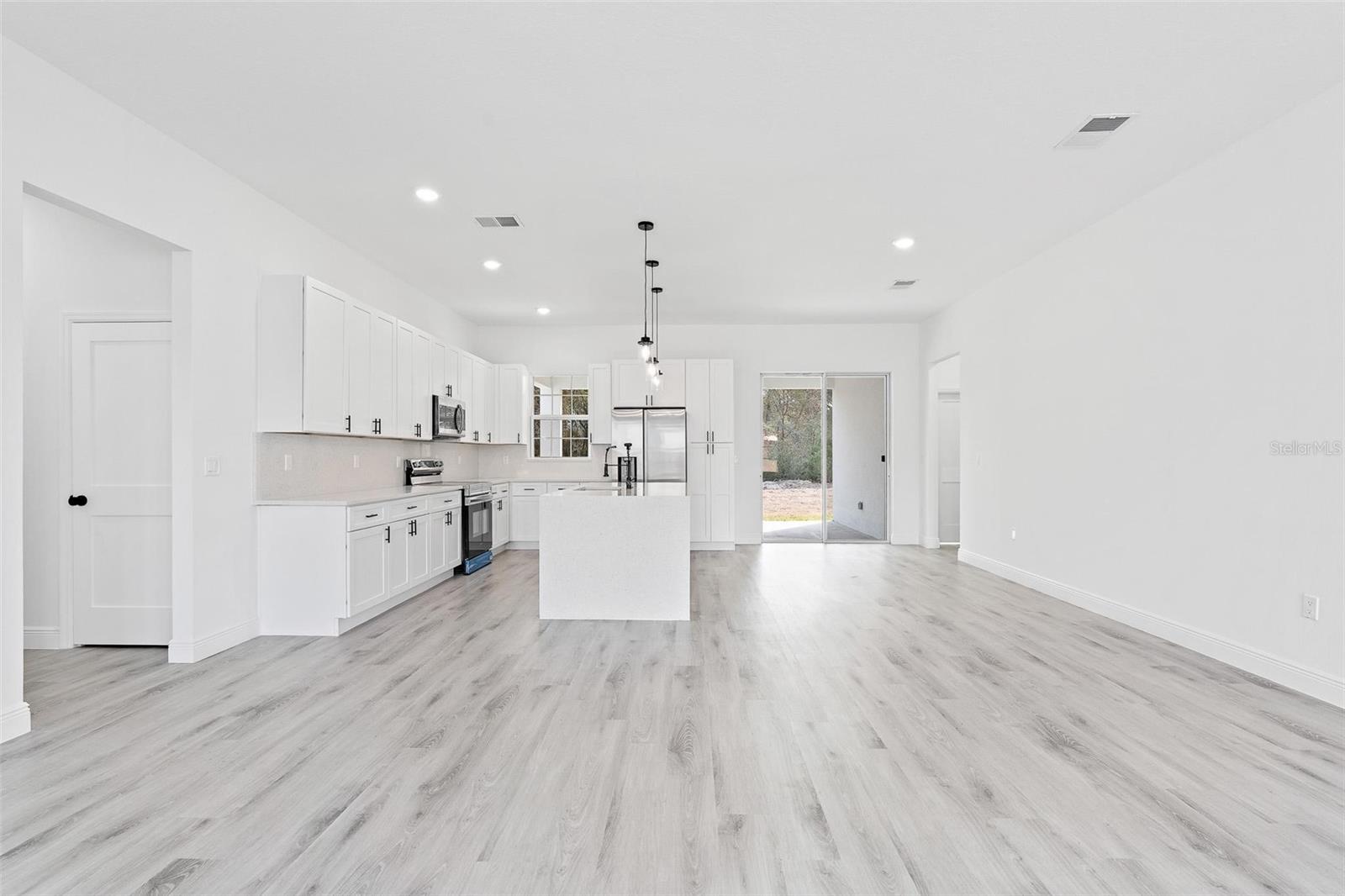 This stunning home, located on a spacious lot has 4 bedrooms and 2 full bathrooms and 1 half-bathroom, large living room with open concept kitchen, equipped with stainless steel appliances including a range, refrigerator, garbage disposal, dishwasher, and microwave, as well as an island and ample cabinet space, perfect for hosting large family gatherings. Rooms are spacious and comfortable, which allows for seamless flow and natural light throughout the home. The house has several upgrades, such as vinyl flooring, floor to ceilings tiles on bathrooms and huge lanai with countertop and sink, plenty of space for outdoor kitchen. With a two-car garage, in addition to being more spacious, has a greater height than standard. It is a perfect place to live or invest.