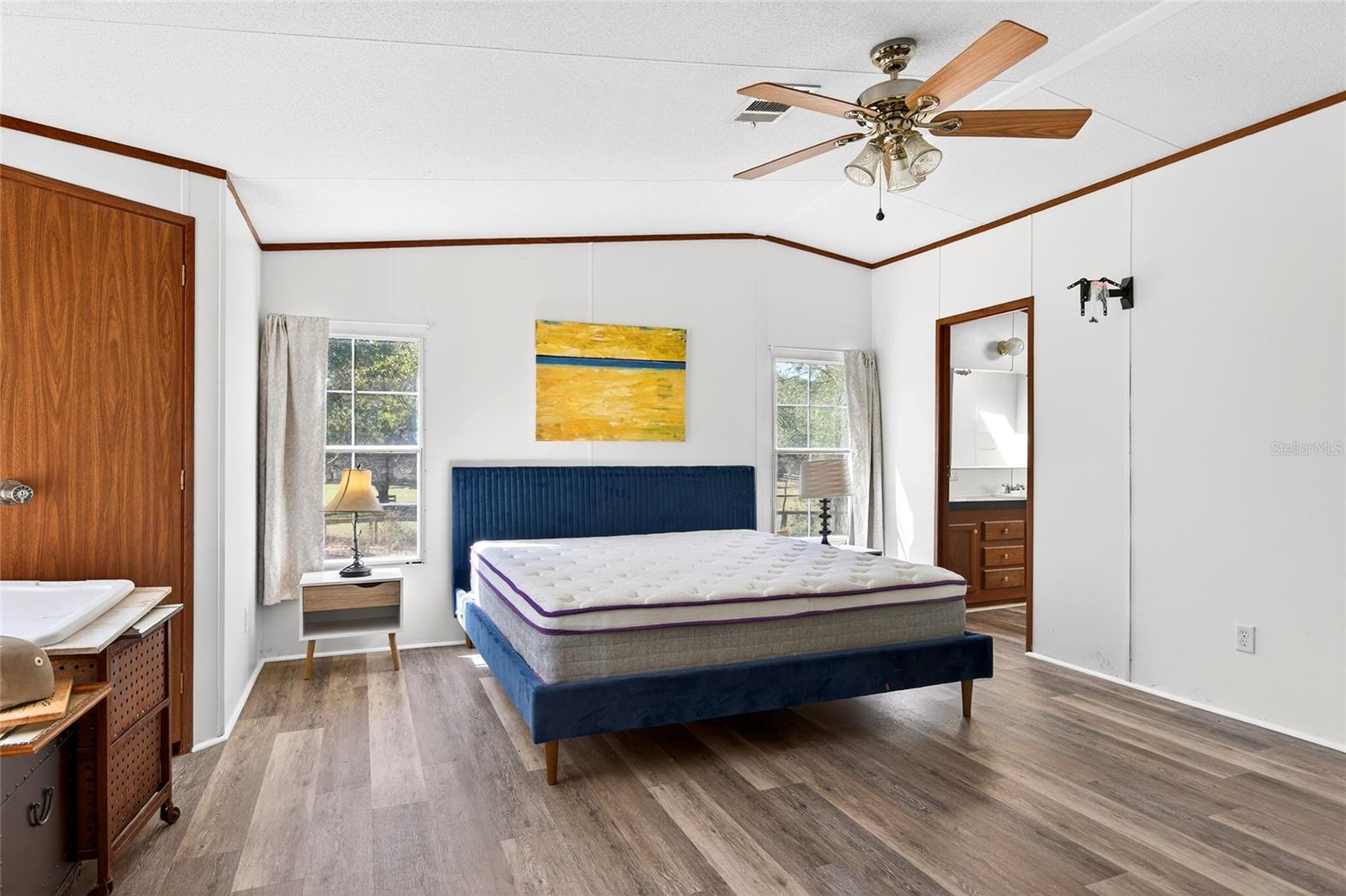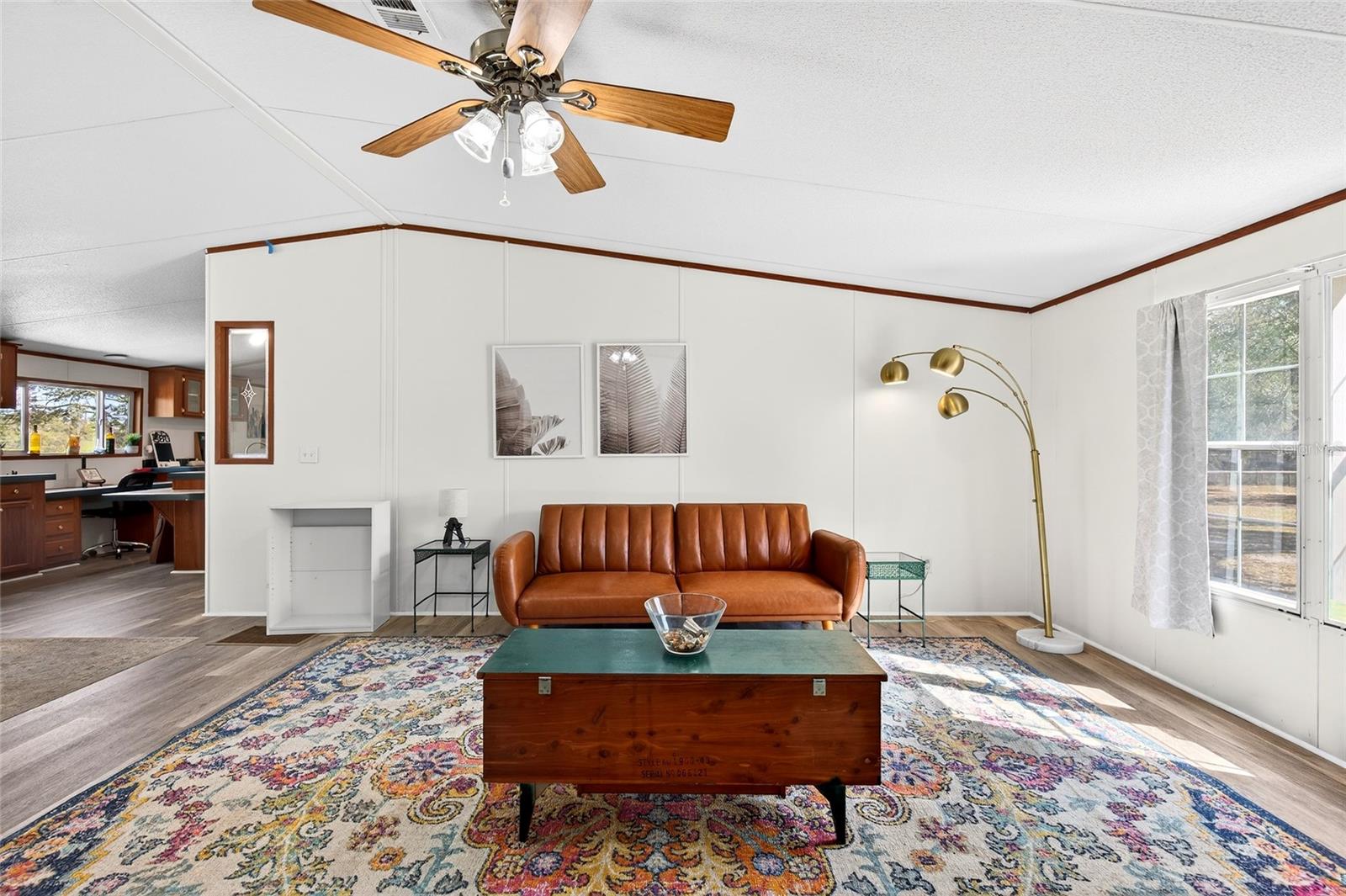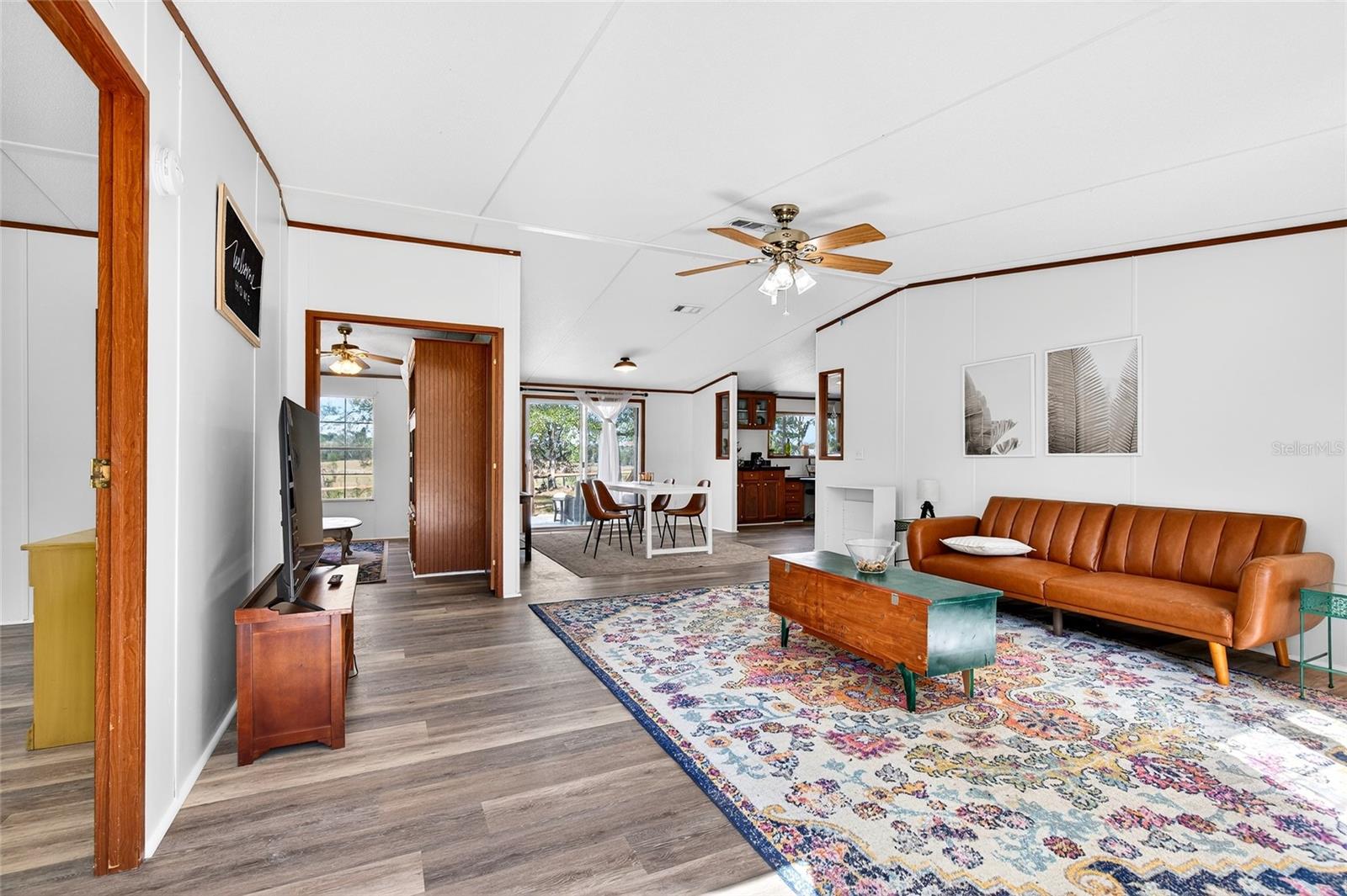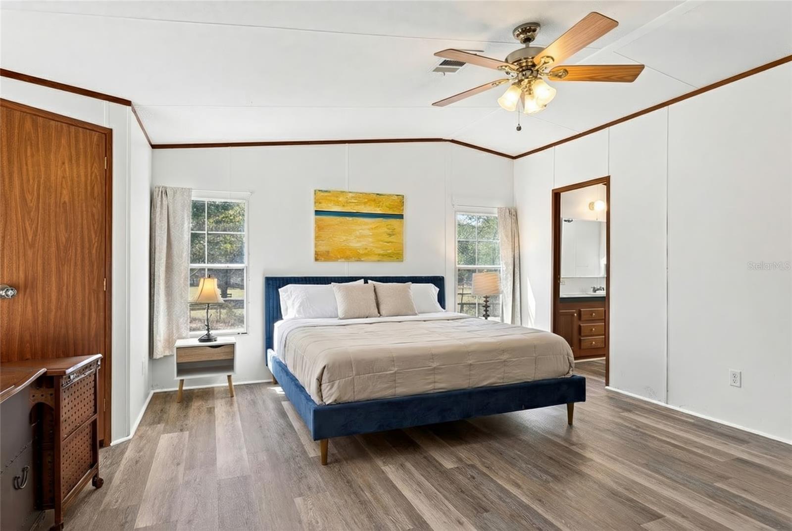 A rock stones throw from the World Equestrian Center! This 4.83 acre, gated and perimeter fenced property is priced to sell and ready for your barn and additional paddocks. This renovated triple wide home boasts over 2200 square feet of open floor plan splendor with 5 bedrooms and 3 full bathrooms with 2 living rooms, 2 dining areas and breakfast area with massive kitchen with large island overlooking living space with fireplace. Split bedroom plan has its own bathrooms and indoor laundry room. Dining leads to double sliding doors out to wood deck overlooking back pasture. Bring the horses and all the animals to this super cute mini farm ready for you!