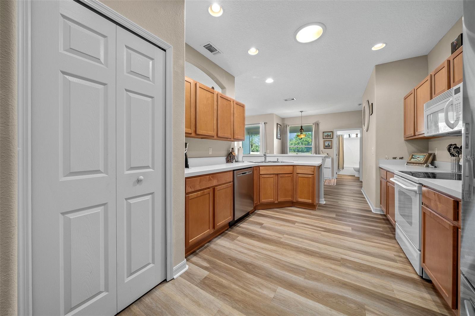 Here is the perfect home for you to retire to the beautiful and warm sunshine State! Toward the end of a cul-de-sac and backing up to holes 13/14 it doesn’t get any better than this, especially for Golf aficionados! Turn key with newer roof installed December 2023, AC/Water Heater in 2020, freshly painted inside and out just and tremendous curb appeal! Upon entrance you will find the dining area with laminate flooring all throughout the main living space of the home with newer carpet in the den. As you make your away around you’ll notice 9ft ceilings all through the living area with sliding doors that open up to the screened in lanai perfect for relaxing. Master suite is massive with an equally big bathroom and even bigger walk in closet! On other side of home past the kitchen and nook area are two rooms with decent size and the second bathroom. Kitchen area has the breakfast bar and nook right alongside with refrigerator and dishwasher only a few years old. If that wasn’t enough there is an extra room on one corner of the home currently being used as an office which could easily be converted into a 4th bedroom. Laundry room inside the home which leads out into the oversized 2 car garage. House is equipped with sprinkler system and gas line (heats up the AC and water heater) and just for you, lawn maintenance fully transferable upon sale. Community amenities: Wifi, cable, mowing, Pool, Tennis courts, Softball, Gardening, dog park and best of all includes RV/Trailer parking.