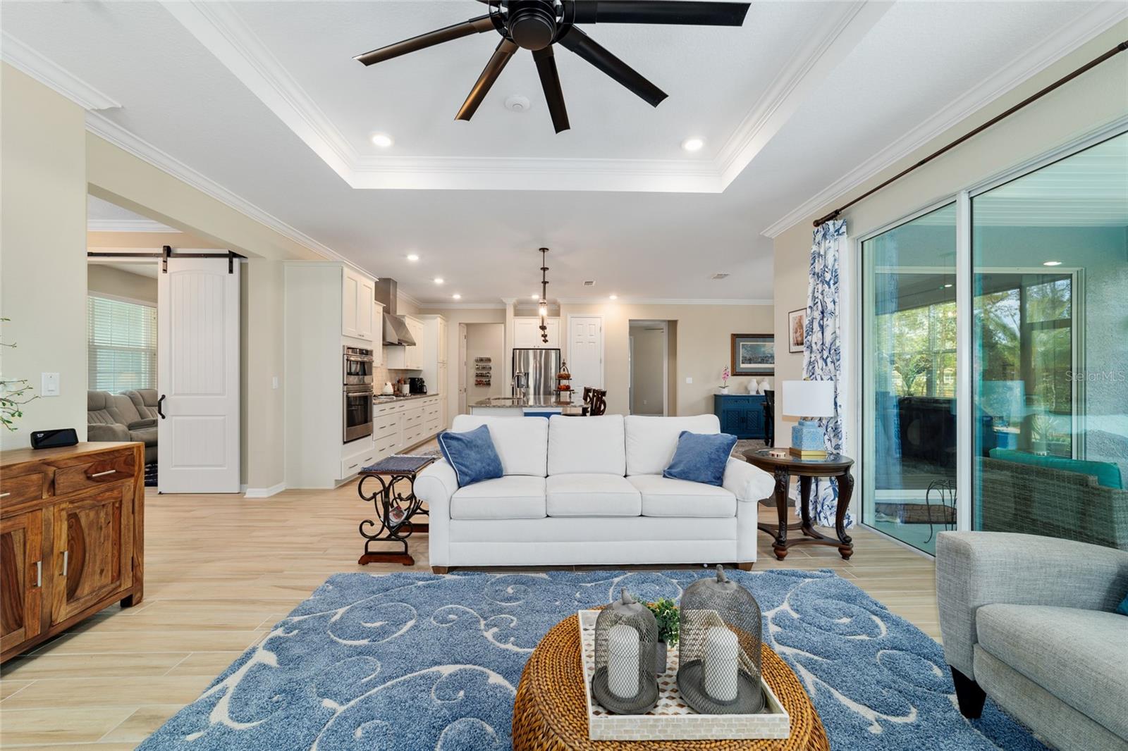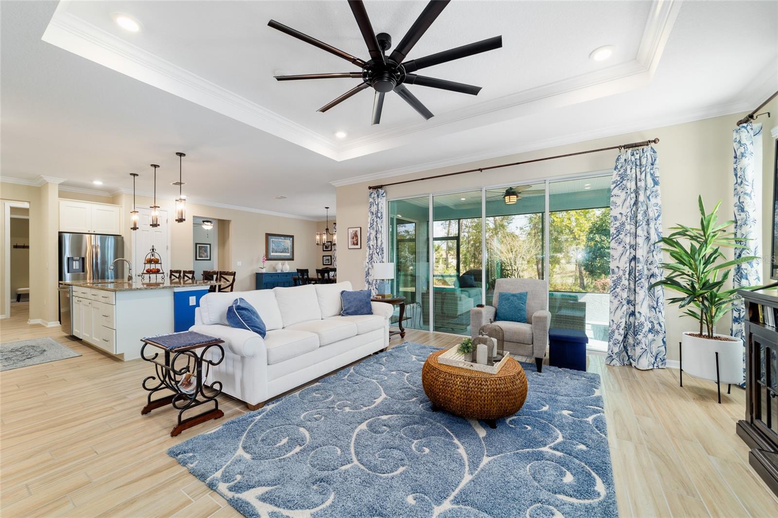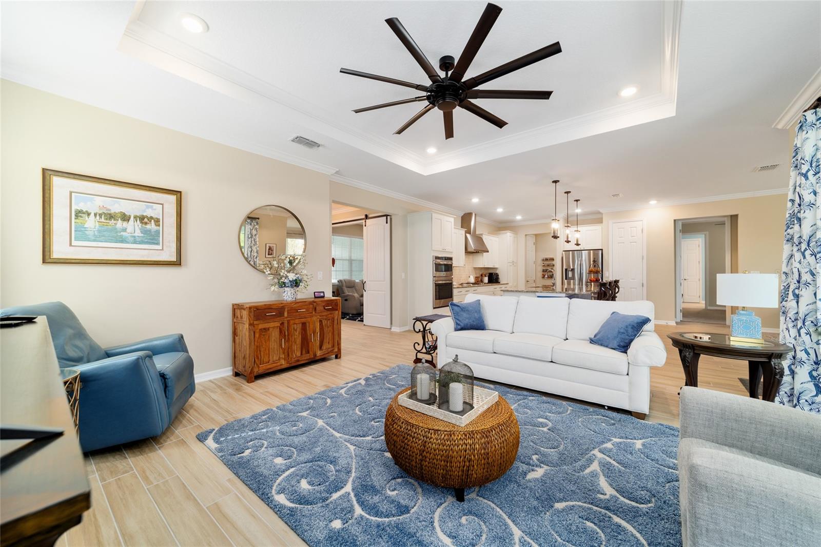 NEW PRICE REDUCTION! Luxury Living on a Private Lot – Stunning Beatrix Model in Avalon 7 Take advantage of a significant price reduction on this beautifully upgraded Beatrix model, ideally located on a private lot with no rear neighbors in the sought-after Avalon 7 neighborhood of On Top of the World! This 2-bedroom + flex room, 2-bath home blends elegant design with everyday comfort. The chef’s kitchen is a true centerpiece—featuring an oversized island, sleek vent hood, wall oven, built-in microwave, dual pantries, abundant cabinetry, and plenty of drawers for organized storage. Whether you're prepping meals or entertaining guests, this kitchen is as functional as it is stylish. The open layout includes ceramic tile throughout the main living areas, plush carpet in the bedrooms, tray ceilings, crown molding, and triple sliders that open up to the peaceful backyard. Retreat to the spacious owner’s suite complete with a spa-like bath, no-step walk-in shower, dual vanities, private water closet, and an oversized walk-through closet with direct access to the laundry room. The flex room with custom barn doors adds versatility—ideal for a home office, creative space, or guest room. Additional features include a whole-house water filtration system, upgraded front entry door, and an epoxy-coated 3-bay garage—perfect for cars, golf carts, storage, or a workshop. Enjoy resort-style living in Ocala’s premier 55+ golf cart community, offering golf, fitness centers, swimming pools, pickleball, tennis, restaurants, clubs, and endless activities. Don’t wait—this luxury home is now available at an even better price! Schedule your private showing today and experience the best of On Top of the World living.