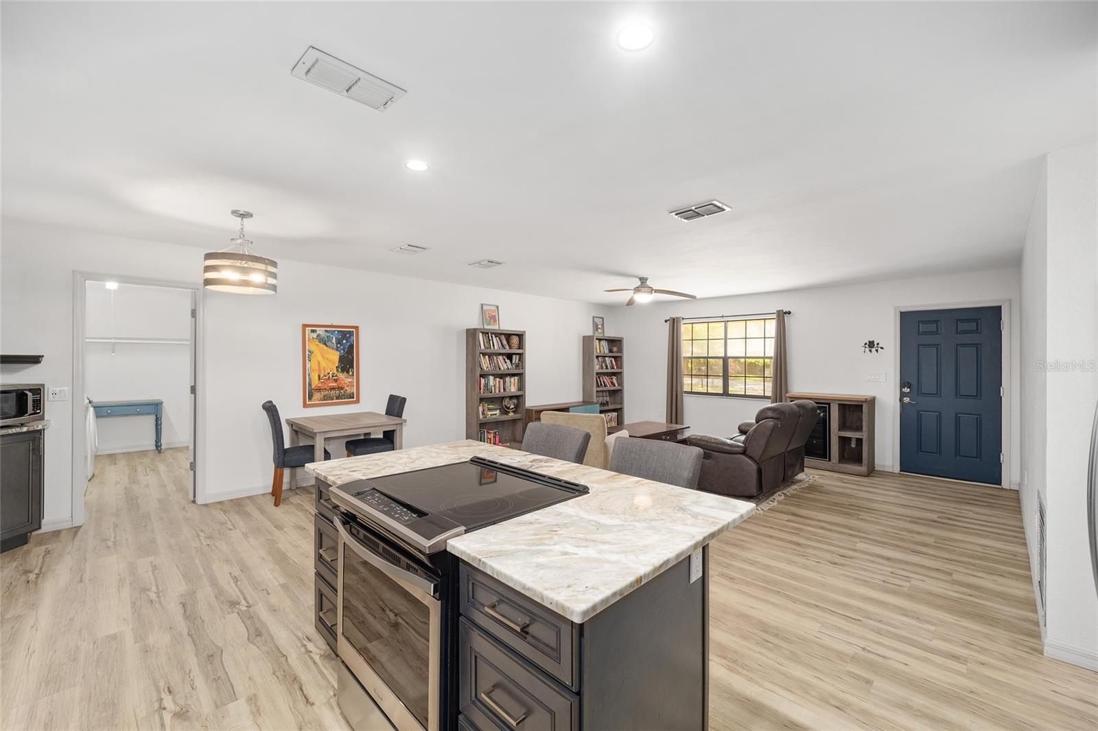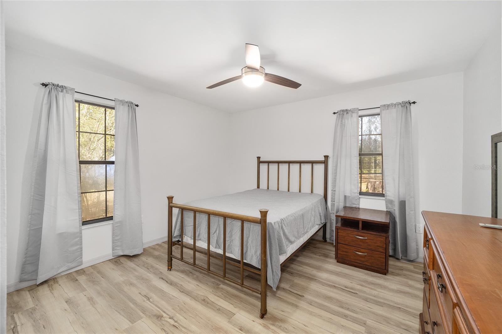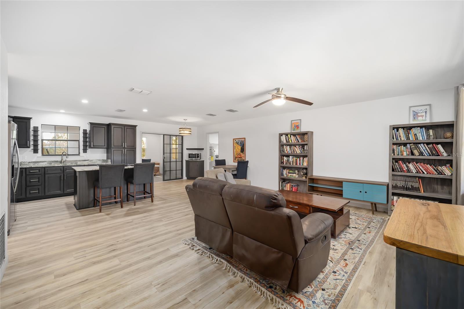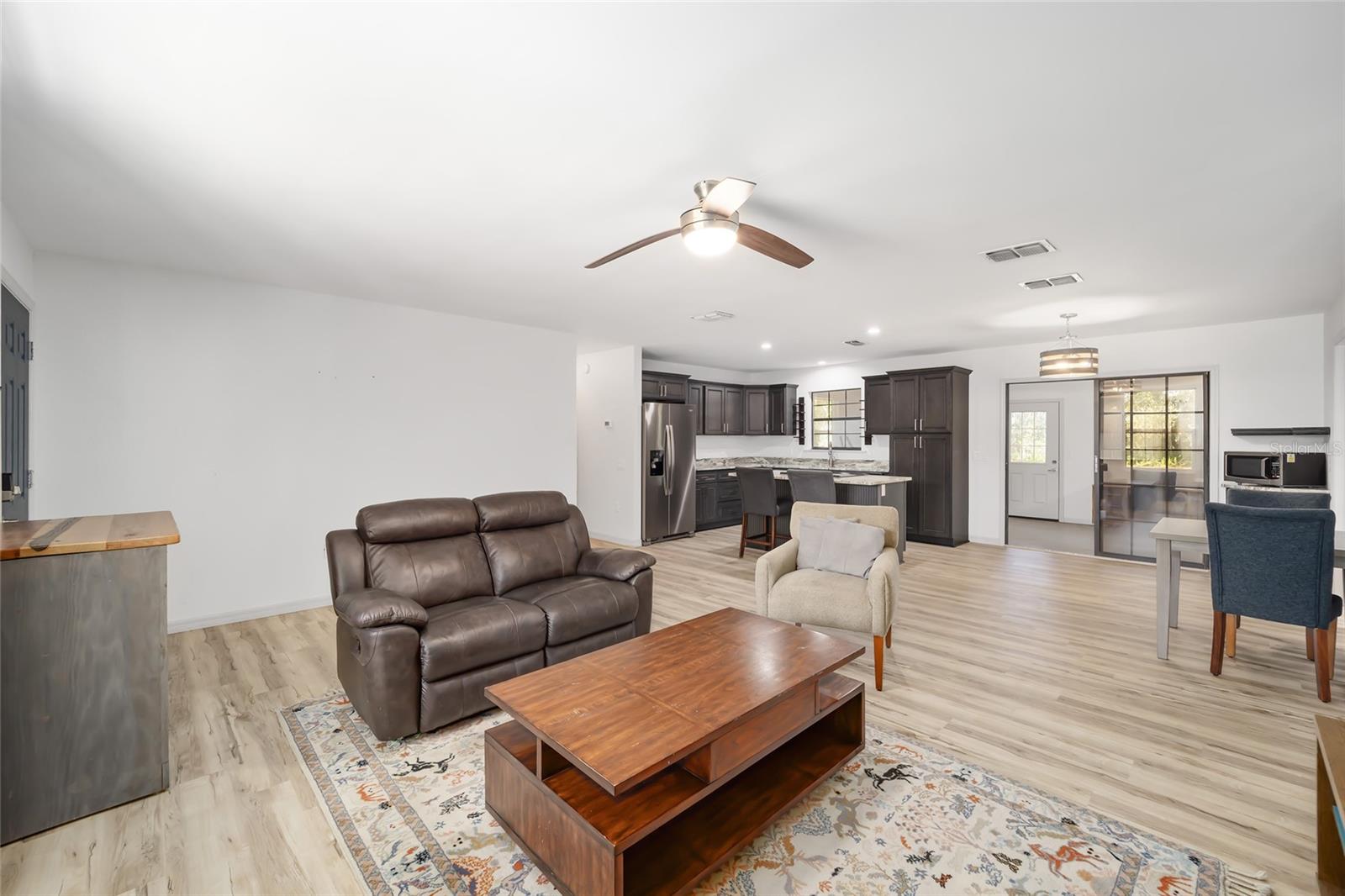 Situated in the buzzing Ocala NW horse country, just off 225a and only minutes to the renowned World Equestrian Center is this adorably renovated home in Ocala Park Estates. In 2021 there was all new paint (ceilings too, no more popcorn), fixtures, LVP flooring throughout, kitchen cabinets, island with seating, stainless steel appliances and granite countertops. As well as a new guest vanity and tiled shower, new primary vanity, water heater, enclosed lanai under air with new windows and fenced in backyard that backs up to a 60 acre farm. The roof was done with new architectural shingles in 2022 and water softener and a new electrical panel in 2023. This is the perfect spot for season, year round, rental investment or starter home! With an open floor plan, large inside laundry, extra enclosed florida room that could be turned into any type of flex room, 2 bedrooms and 2 bathrooms you are sure to be pleasantly satisfied with it's appeal! Welcome to the Horse Capital of The World!