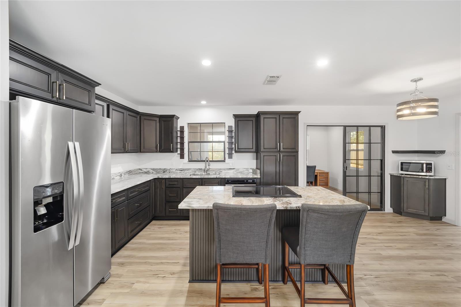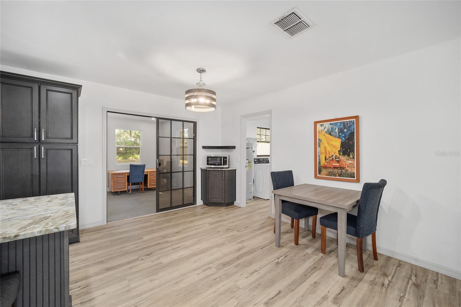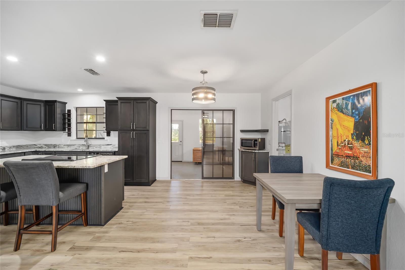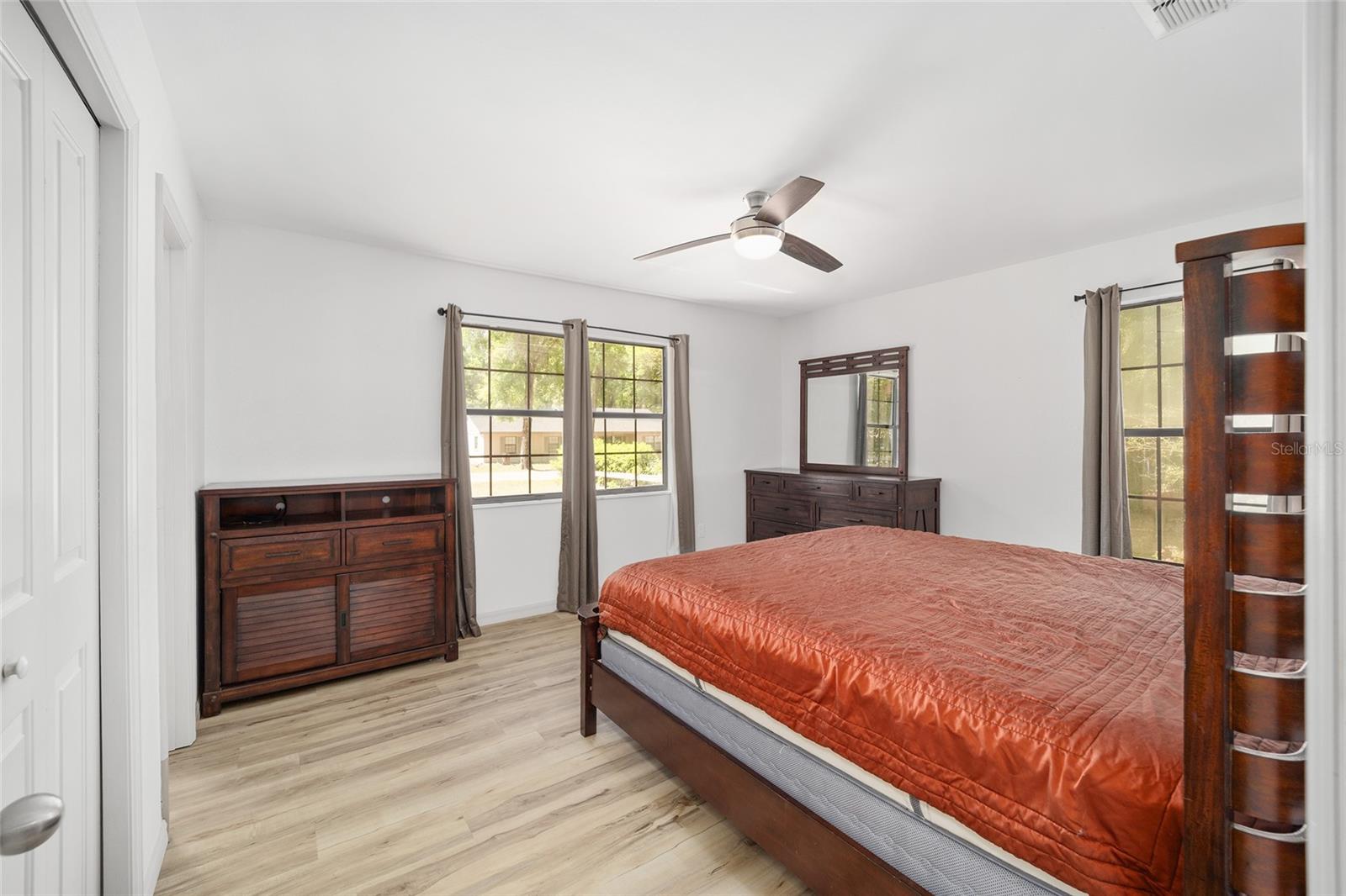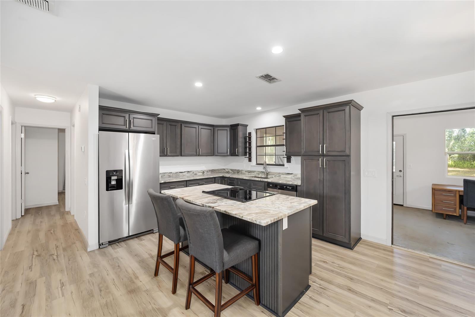 Situated in the buzzing Ocala NW horse country, just off 225a and only minutes to the renowned World Equestrian Center is this adorably renovated home in Ocala Park Estates. In 2021 there was all new paint (ceilings too, no more popcorn), fixtures, LVP flooring throughout, kitchen cabinets, island with seating, stainless steel appliances and granite countertops. As well as a new guest vanity and tiled shower, new primary vanity, water heater, enclosed lanai under air with new windows and fenced in backyard that backs up to a 60 acre farm. The roof was done with new architectural shingles in 2022 and water softener and a new electrical panel in 2023. This is the perfect spot for season, year round, rental investment or starter home! With an open floor plan, large inside laundry, extra enclosed florida room that could be turned into any type of flex room, 2 bedrooms and 2 bathrooms you are sure to be pleasantly satisfied with it's appeal! Welcome to the Horse Capital of The World!