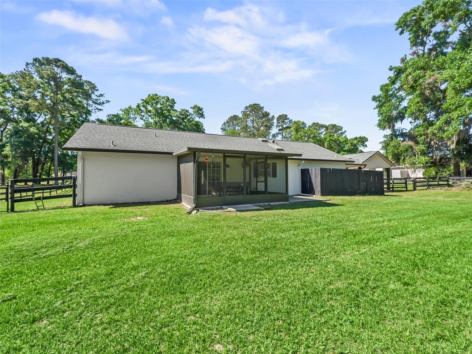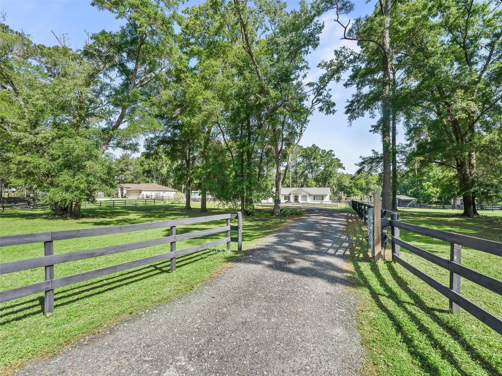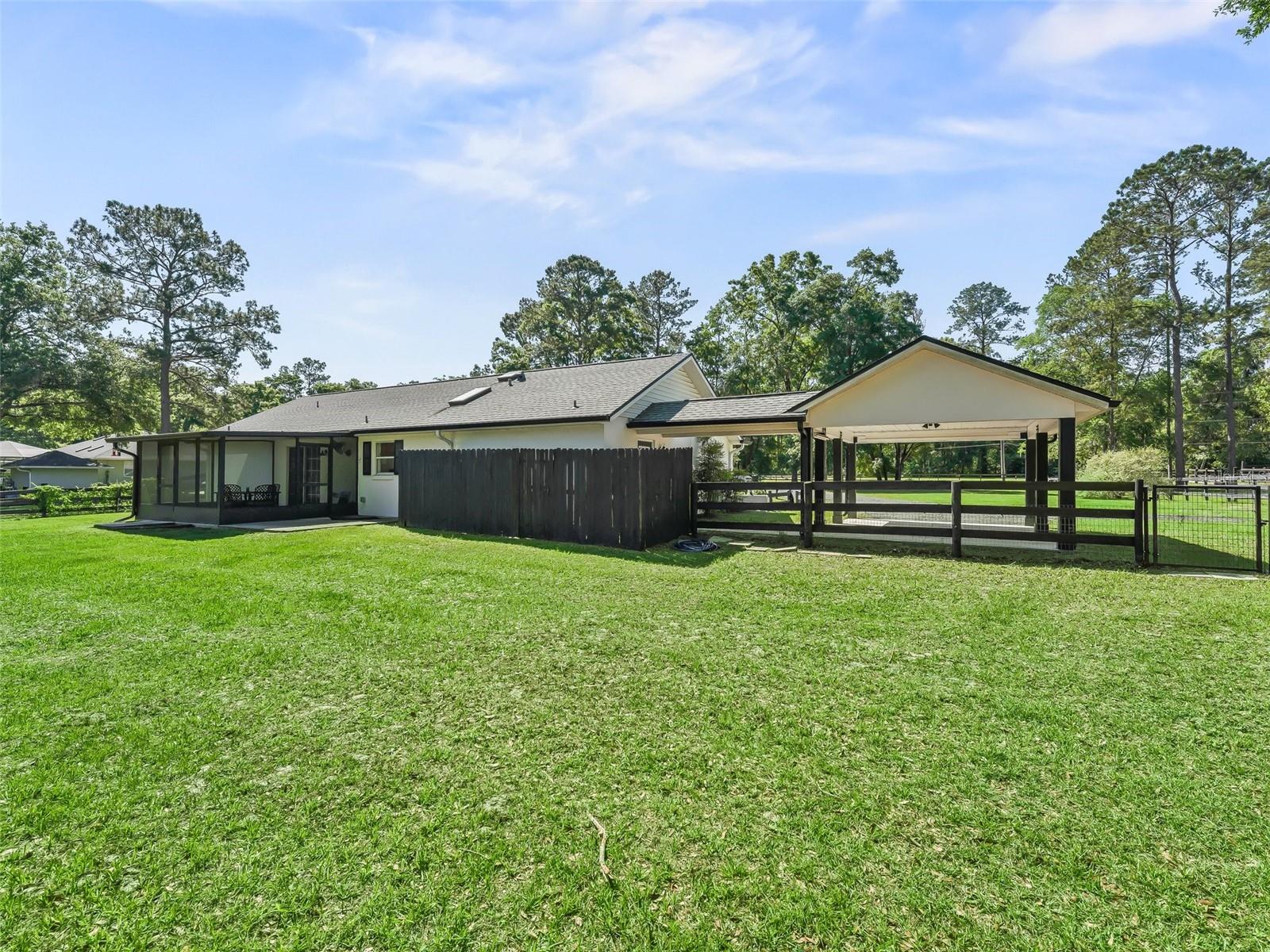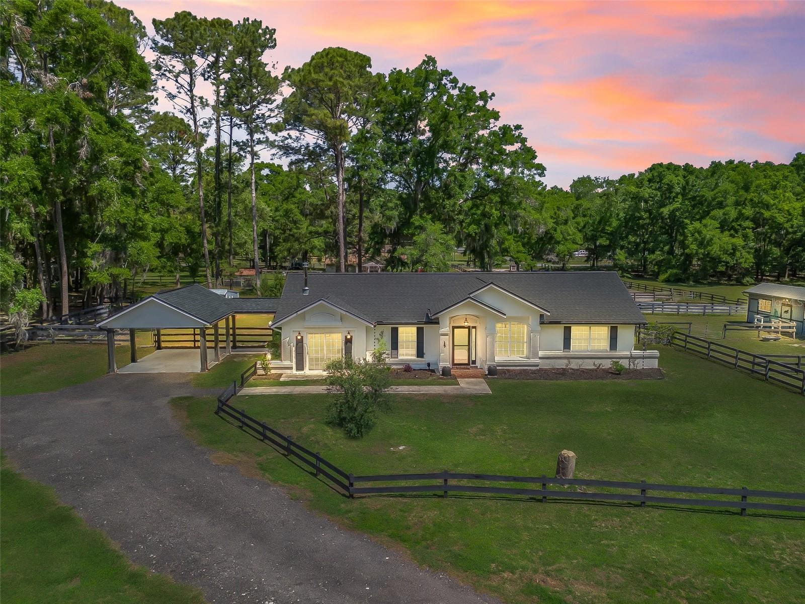 Don't let the size of this property fool you! Thoughtfully designed 1.4 acre lot in Meadow Wood Farms - just minutes from The WEC! The gated entryway leads to the fully fenced property with updated home and two-stall barn. Inside the home, the open, split bedroom floor plan features vaulted ceilings and wood laminate floors that carry throughout most of the home. The kitchen boasts newer cabinetry with soft-close drawers, roll outs, corian countertops, cast-iron porcelain sink, glass tile backsplash and stainless steel appliances including French door fridge. The primary suite offers dual-closets and an ensuite bathroom with dual sink vanity plus sit-down vanity, a walk-in shower with frameless glass door and linen closet. The opposite side of the home has two additional bedrooms and guest bathroom with access from the living space or 2nd bedroom. The guest bathroom features a shower/tub combo with glass door and newer vanity. The 3rd bedroom offers a sliding glass door to the yard and wood burning stove. There is also a spacious interior laundry room and covered breezeway leading to the carport. The back of the home offers a covered and screened porch and open patio leading to the backyard which is fully fenced with 3 board plus no-climb wire and includes a storage shed with electric and adjacent chicken coop. On the opposite side of the backyard is the two-stall barn complete with tack room and a fenced pasture along the east side of the property. A rear gate leads you into the neighborhood with miles of quiet, paved, tree lined streets. Updates include: new roof with skylights 2017, HVAC 2019, and well upgrade in 2024. This home could also be sold fully furnished! Please enjoy the attached video & 3D tours.