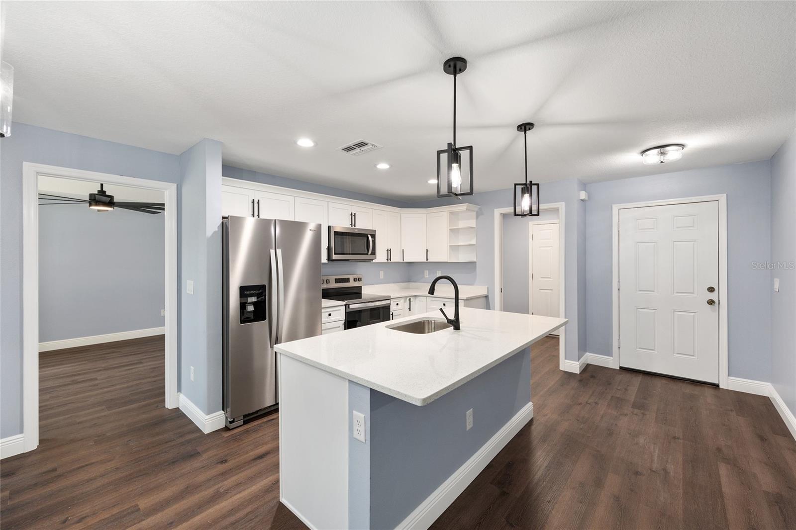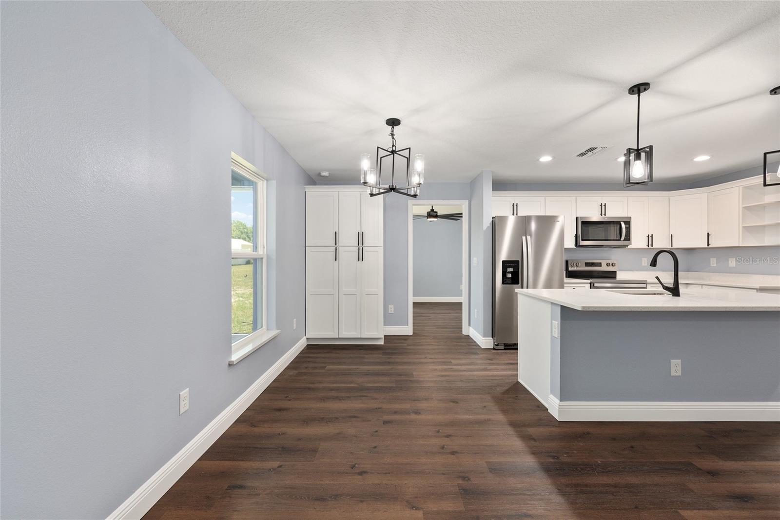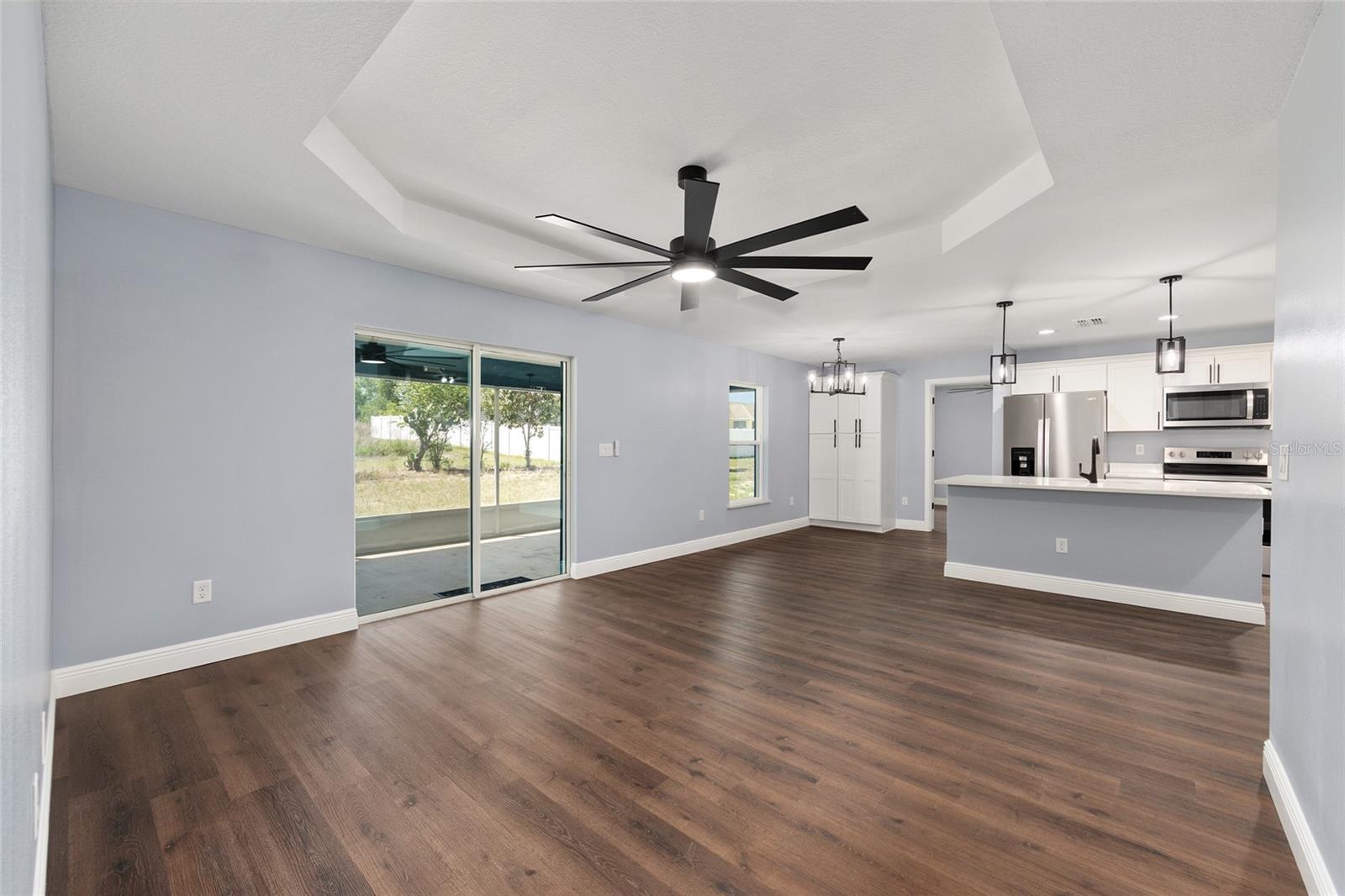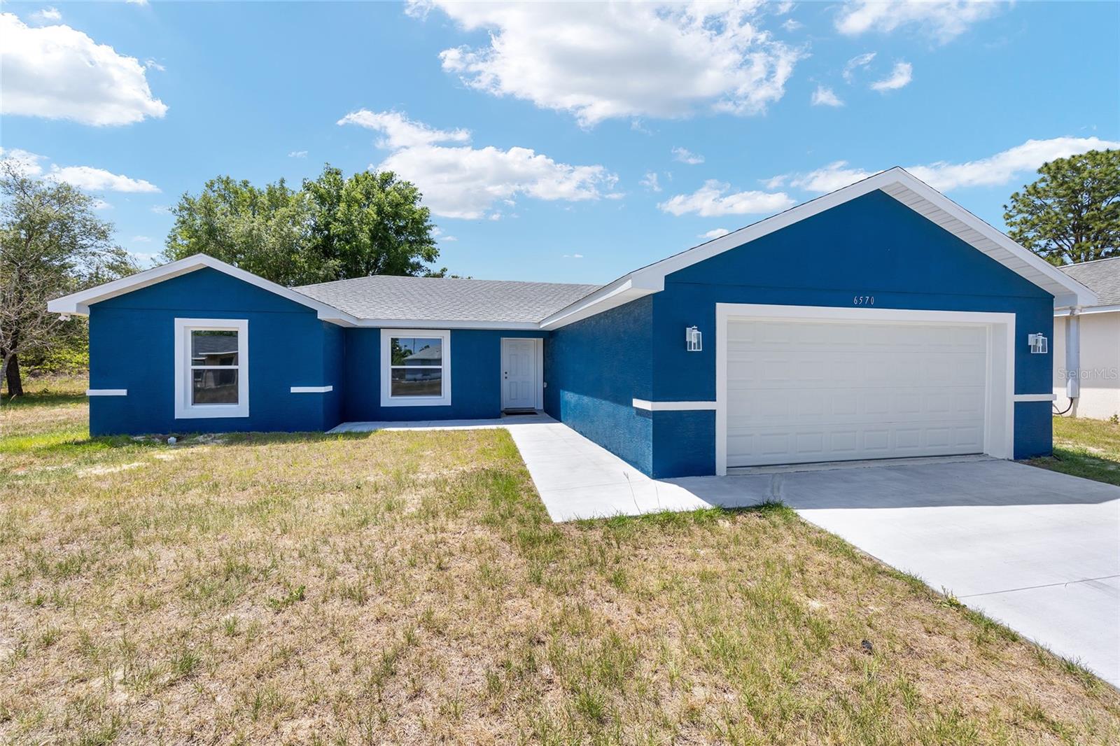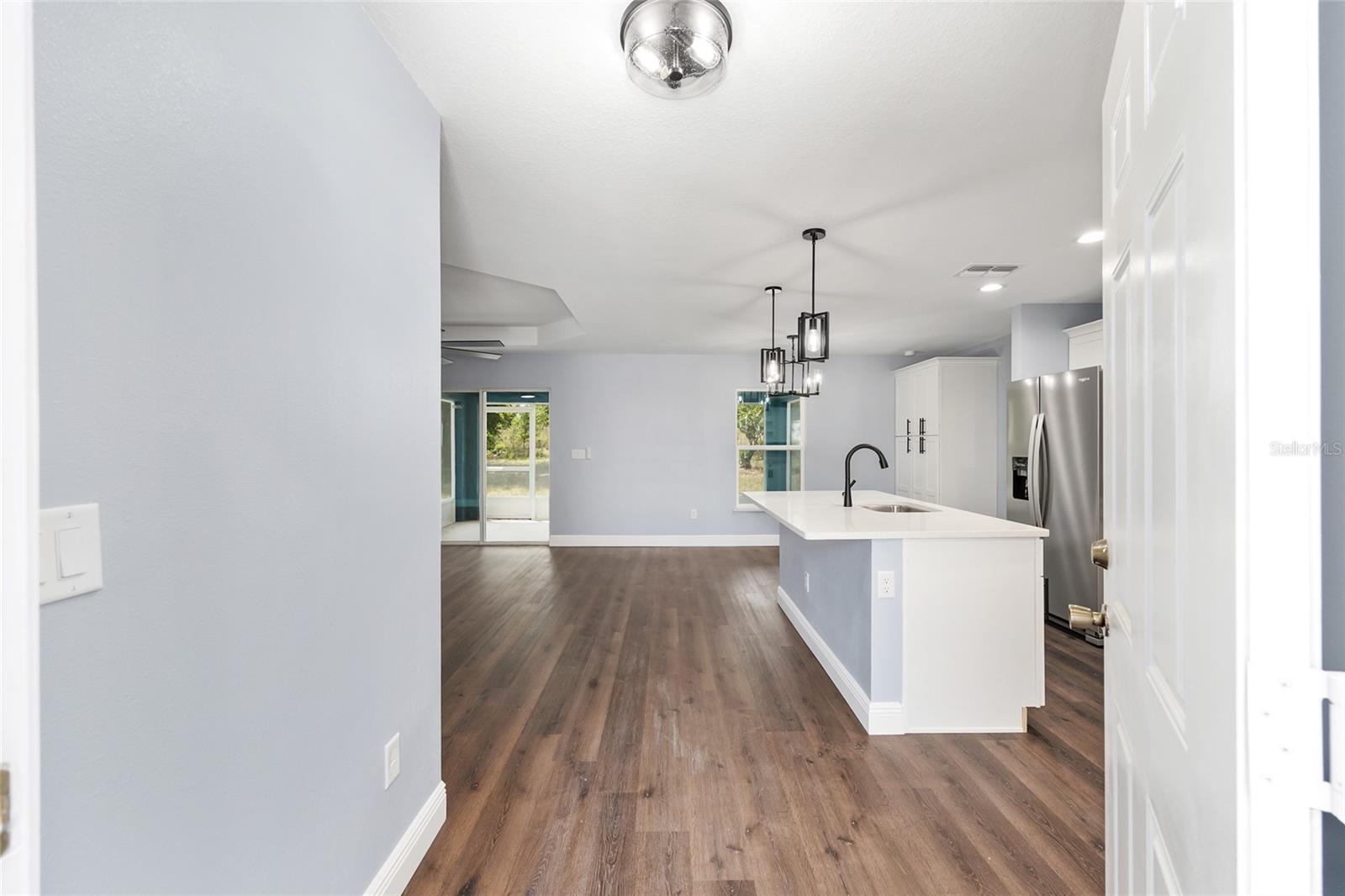 Be the first to live in this beautifully crafted, brand-new home offering the perfect blend of modern style and comfort. Located on a PRIVATE LOT with NO HOA restrictions, this 4-bedroom, 2-bathroom property features an open-concept layout ideal for both relaxing and entertaining. Step inside to find luxury vinyl plank (LVP) flooring throughout, complemented by neutral paint tones that create a warm, inviting atmosphere. The kitchen boasts white soft-closed cabinets, brand-new stainless-steel appliances, a large-scale pantry cabinet and a spacious island that flows seamlessly into the living and dining areas—all under a stylish tray ceiling. Retreat to the primary suite with its tiled walk-in shower and generous closet space. Both bathrooms feature tile to the ceiling-shower and bathtub-with modern finishes. The 3 guest bedrooms are on the left side of the house, equipped with lighted fans and sizable closets. Enjoy the outdoors year-round in the enclosed, screened lanai, perfect for quiet mornings or evening gatherings. Additional highlights include a 2-car garage with epoxy flooring, a smart garage door opener, and an in-house laundry room. This move-in-ready home on a PRIVATE LOT offers low-maintenance living with top-tier features—without the restrictions of an HOA and is the perfect place to raise your family.