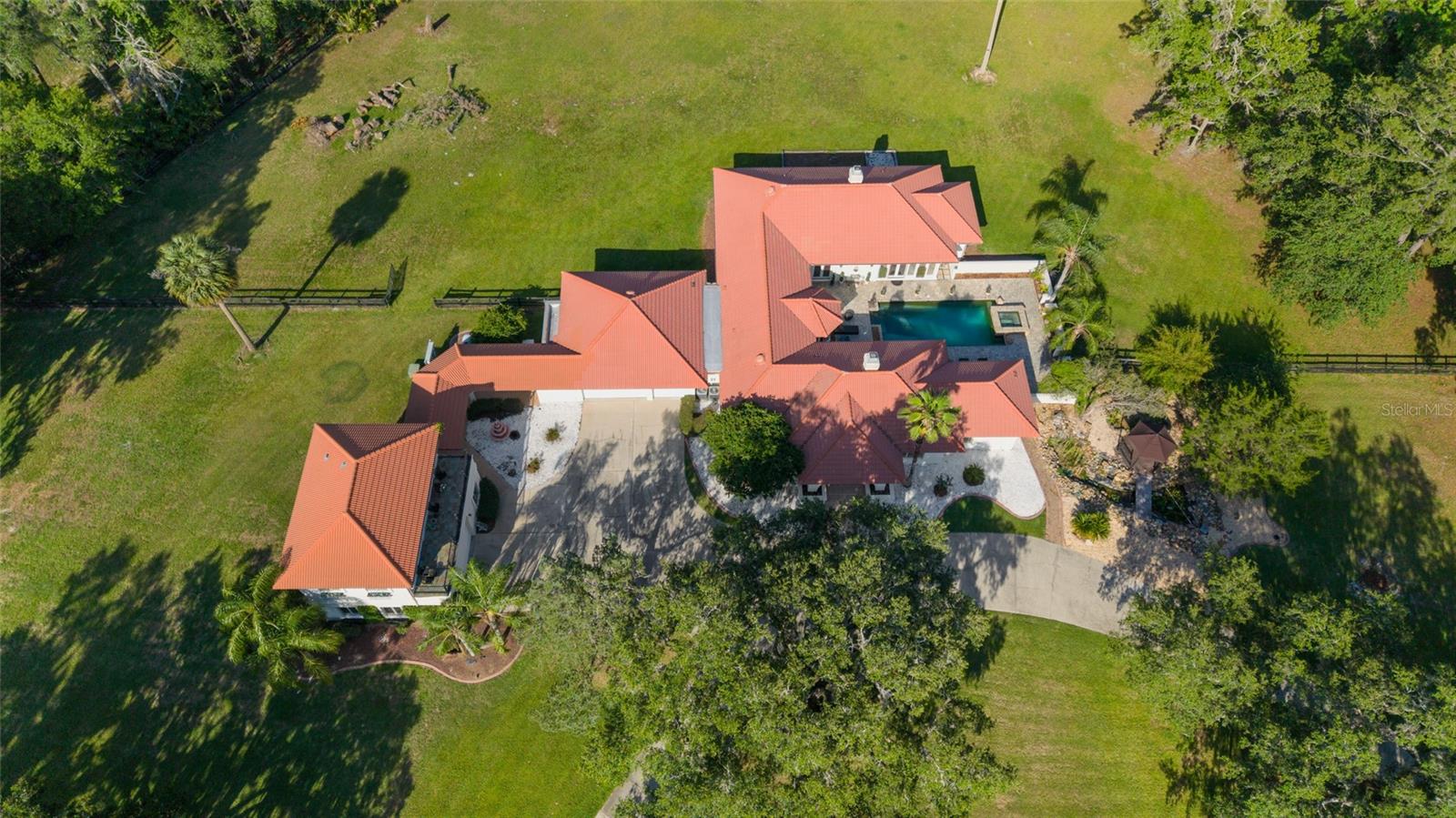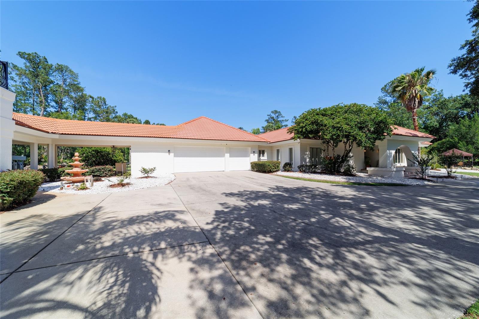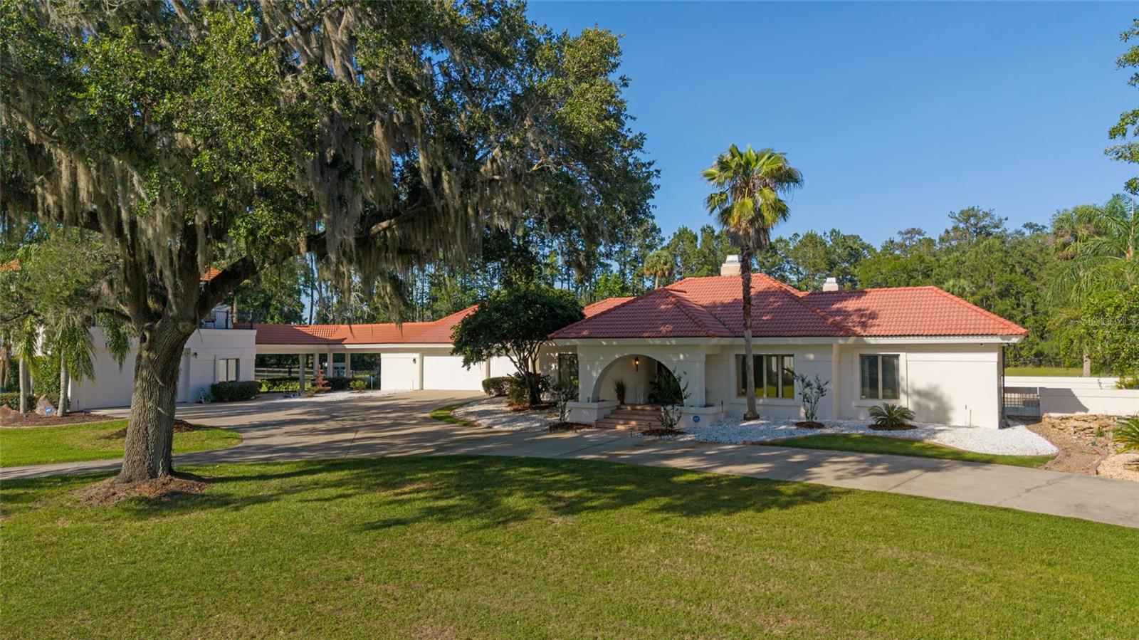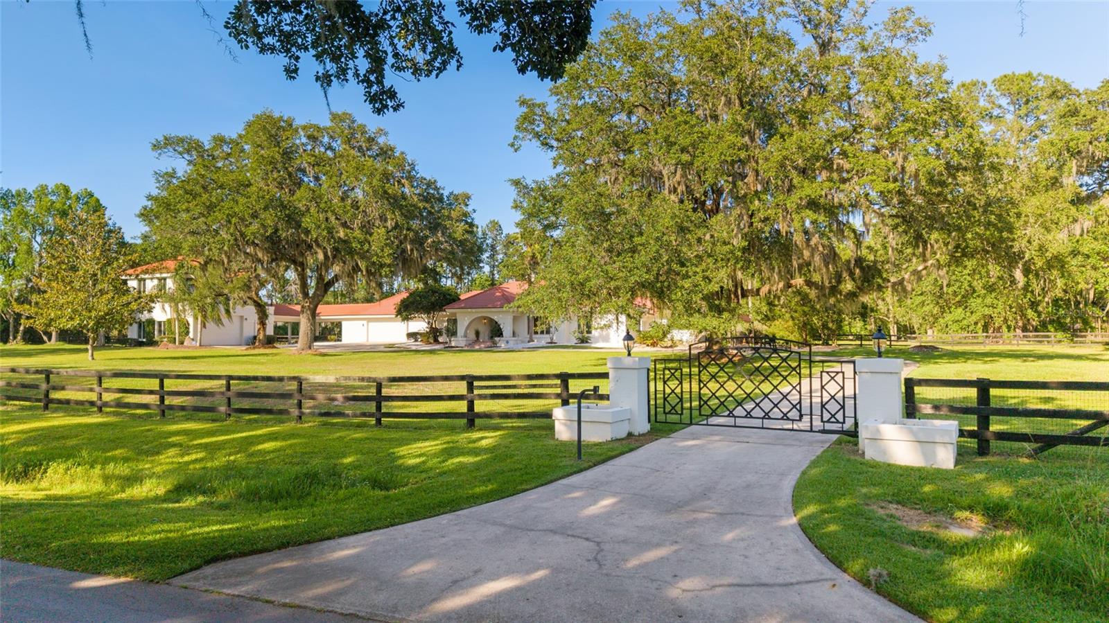 Seller to Install Brand New Roof with Acceptable Offer – Peace of Mind Included! Mediterranean Masterpiece on Nearly 6 Private Acres & almost 5k living square footage in Ocala’s Prestigious Summit II. Step through your personal private viking 2023 gate as your entrance with into a palm-lined drive. Designed in a graceful U-shape around a courtyard pool and spa, the estate blends resort-style living with elegant Old-World craftsmanship—arched columns, French doors, and PeachTree wood-encased windows flood every room with natural light and seamless indoor-outdoor flow. Inside the main residence, featuring 4 bedrooms 3 full bathrooms and powder bathroom- admiring these soaring ceilings multiple living and entertaining areas anchored by a chef’s kitchen with stone countertops, 2024 Bosch Fridge & kitchen aid, expansive island, and full entertaining bar, while a fireside library crowned with custom cabinetry offers the perfect flex space or 5th bedroom. The lavish primary wing pampers with a gas fireplace, boutique-sized closet, sunken jetted tub, and spa shower; three additional guest suites ensure comfort for family and friends, and an attached 4 car garage keeps prized vehicles secure. A covered breezeway links the main home to a private 1052 living square footage 1-bedroom, 1-bath guest house perched above its own two-car garage/ 32 Ft Height RV capable garage- complete with dual balconies that capture tranquil views of manicured grounds and fenced pasture. Car collectors and adventurers will appreciate, while outdoor enthusiasts can unwind beneath the gazebo overlooking a serene water garden framed by lush, mature landscaping. Zoned agricultural! Imagine the possibilities—our virtual renderings reveal how a full-size tennis court nestles seamlessly on these six private acres, still leaving ample space for a custom barn and any other amenities you desire. Minutes from Ocala’s world-class equestrian venues, boutique shopping, fine dining, and private aviation, this gated Mediterranean estate delivers the privacy, acreage, and luxury finishes. Discover lower taxes, a thriving equestrian scene, and an elevated lifestyle in Ocala; schedule your confidential tour today and experience a residence where sophistication meets serenity. Location is 7 miles to Ocala's airport, 10 Miles to Downtown Ocala, 12 Miles to WEC and more! Attached is a feature sheet with upgrades galore!