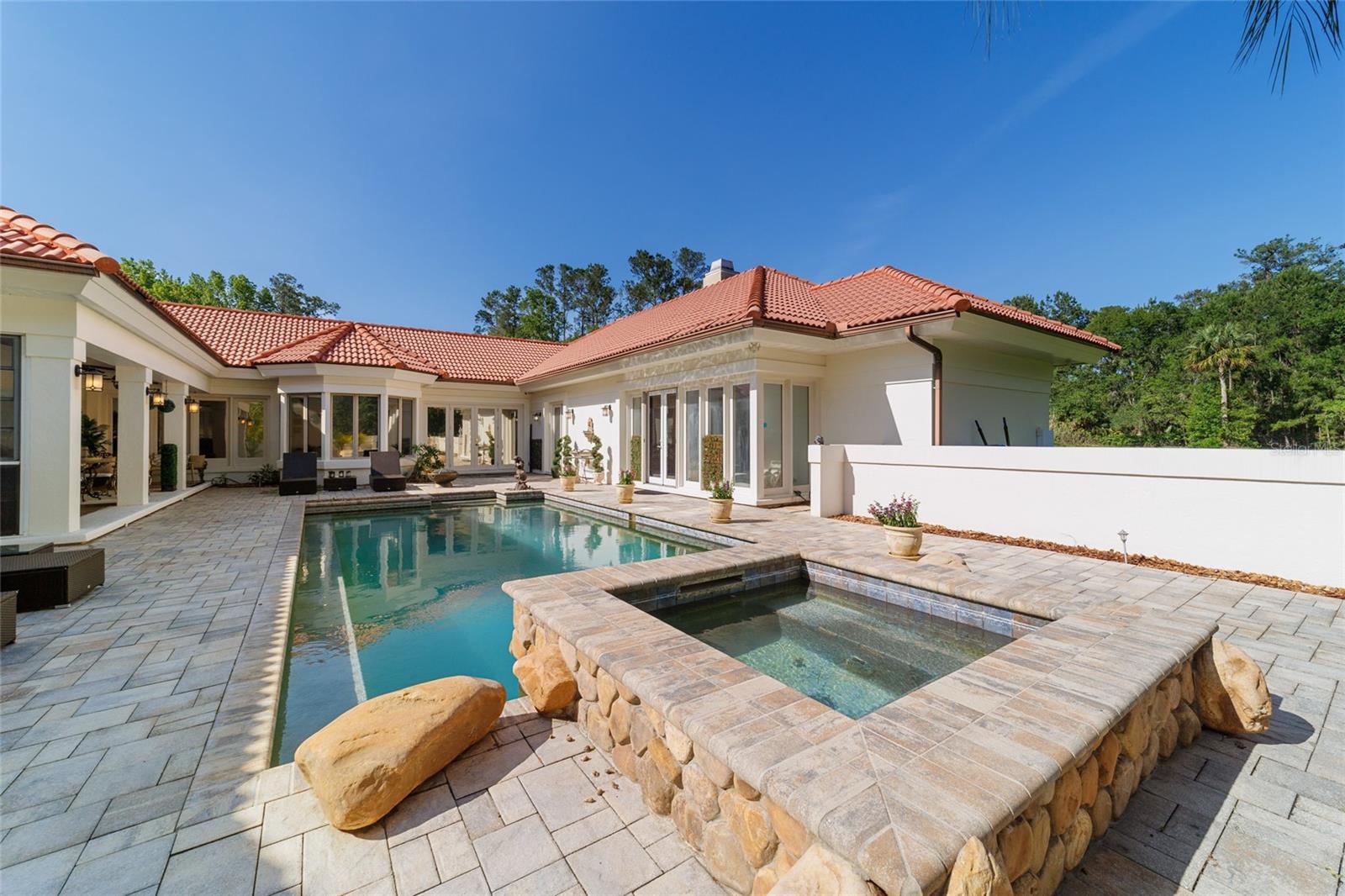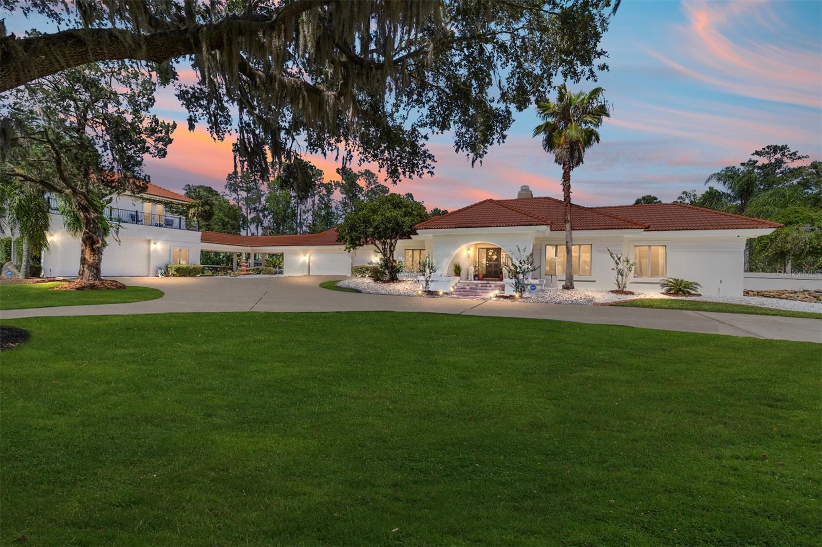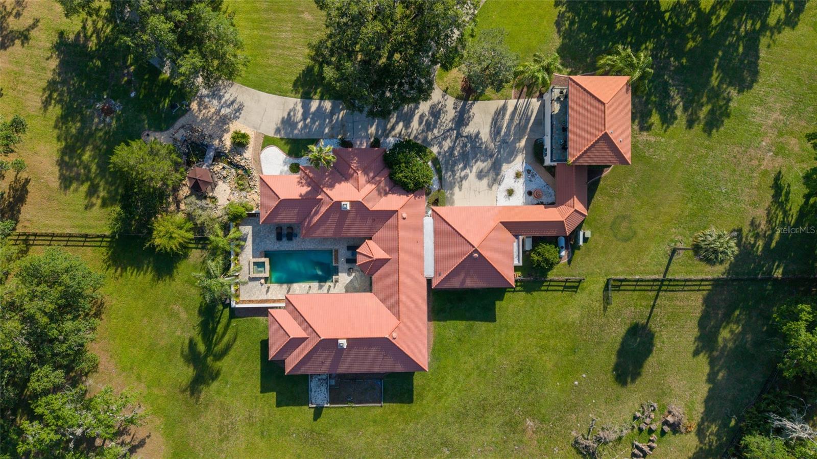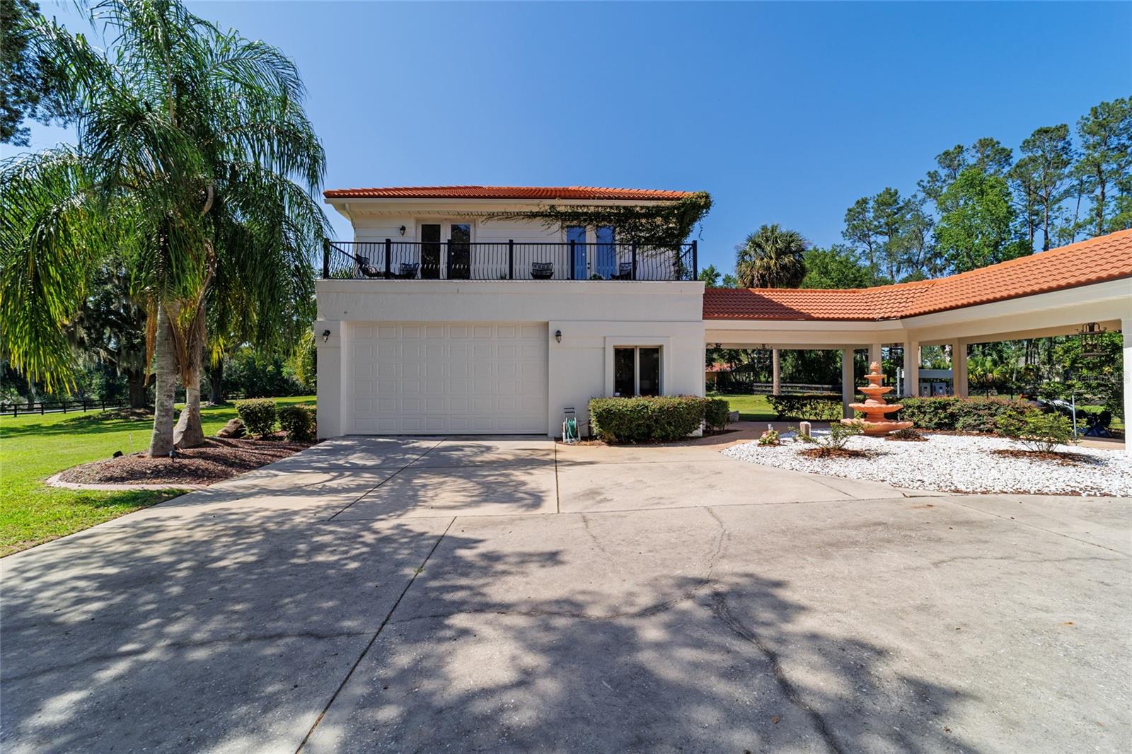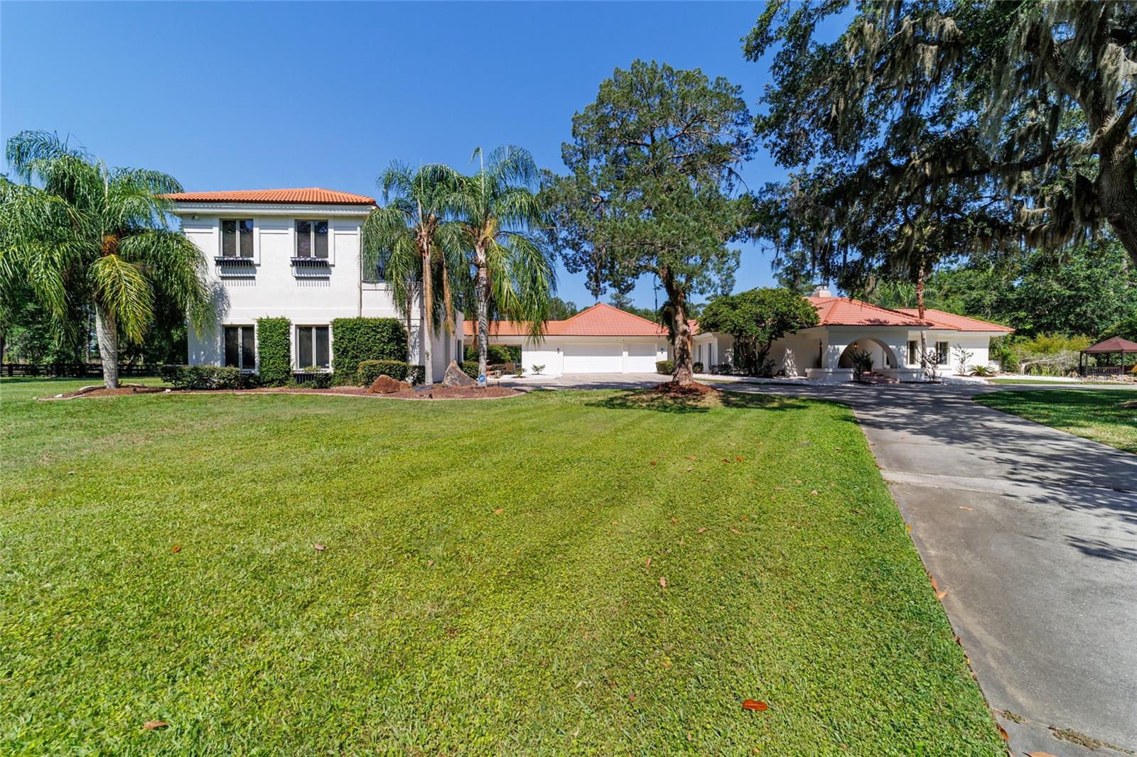 Seller to Install Brand New Roof with Acceptable Offer – Peace of Mind Included! Mediterranean Masterpiece on Nearly 6 Private Acres & almost 5k living square footage in Ocala’s Prestigious Summit II. Step through your personal private viking 2023 gate as your entrance with into a palm-lined drive. Designed in a graceful U-shape around a courtyard pool and spa, the estate blends resort-style living with elegant Old-World craftsmanship—arched columns, French doors, and PeachTree wood-encased windows flood every room with natural light and seamless indoor-outdoor flow. Inside the main residence, featuring 4 bedrooms 3 full bathrooms and powder bathroom- admiring these soaring ceilings multiple living and entertaining areas anchored by a chef’s kitchen with stone countertops, 2024 Bosch Fridge & kitchen aid, expansive island, and full entertaining bar, while a fireside library crowned with custom cabinetry offers the perfect flex space or 5th bedroom. The lavish primary wing pampers with a gas fireplace, boutique-sized closet, sunken jetted tub, and spa shower; three additional guest suites ensure comfort for family and friends, and an attached 4 car garage keeps prized vehicles secure. A covered breezeway links the main home to a private 1052 living square footage 1-bedroom, 1-bath guest house perched above its own two-car garage/ 32 Ft Height RV capable garage- complete with dual balconies that capture tranquil views of manicured grounds and fenced pasture. Car collectors and adventurers will appreciate, while outdoor enthusiasts can unwind beneath the gazebo overlooking a serene water garden framed by lush, mature landscaping. Zoned agricultural! Imagine the possibilities—our virtual renderings reveal how a full-size tennis court nestles seamlessly on these six private acres, still leaving ample space for a custom barn and any other amenities you desire. Minutes from Ocala’s world-class equestrian venues, boutique shopping, fine dining, and private aviation, this gated Mediterranean estate delivers the privacy, acreage, and luxury finishes. Discover lower taxes, a thriving equestrian scene, and an elevated lifestyle in Ocala; schedule your confidential tour today and experience a residence where sophistication meets serenity. Location is 7 miles to Ocala's airport, 10 Miles to Downtown Ocala, 12 Miles to WEC and more! Attached is a feature sheet with upgrades galore!