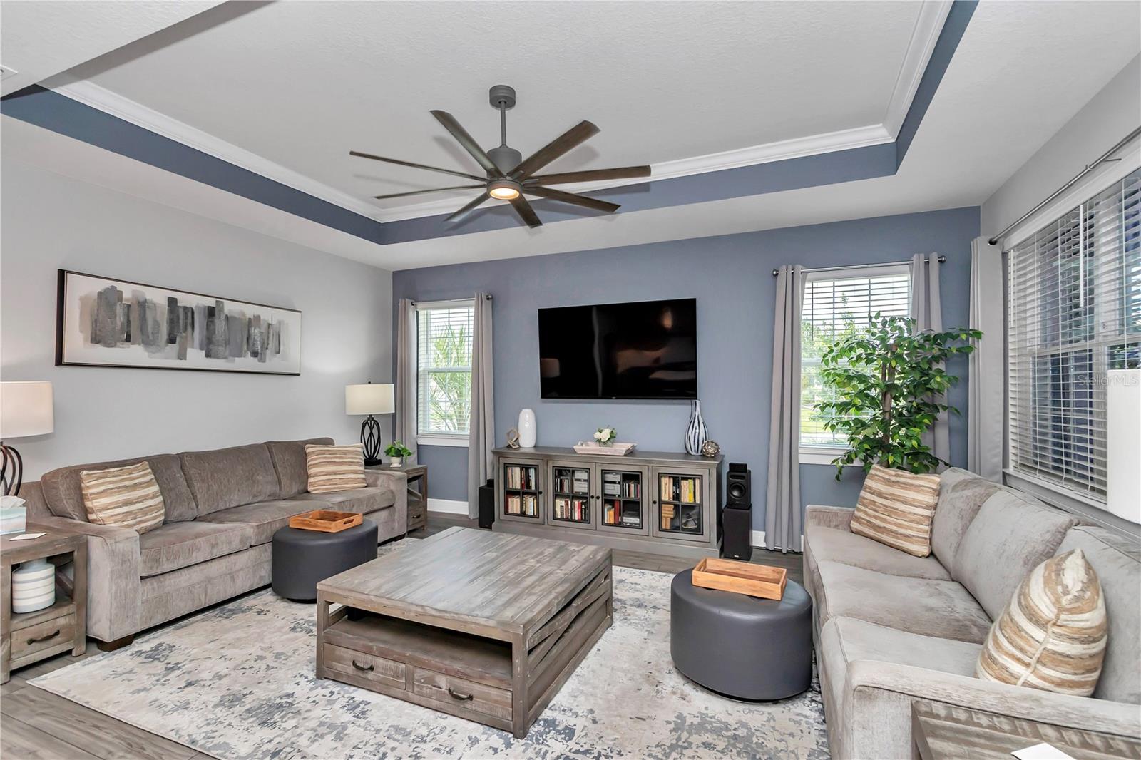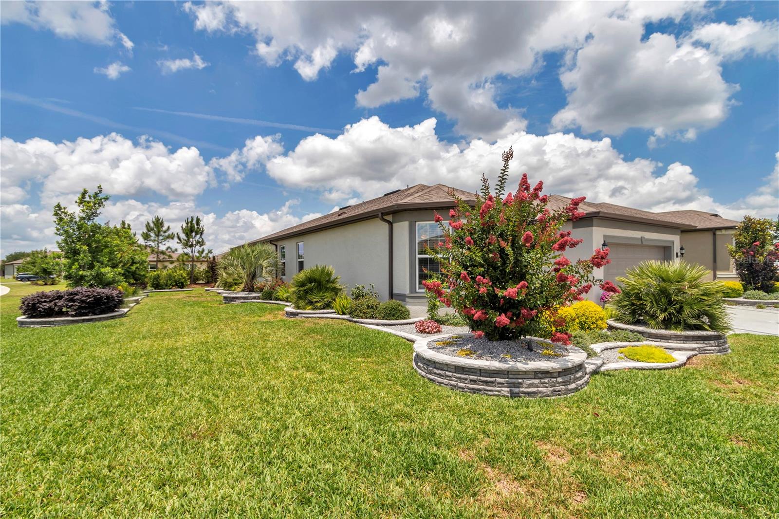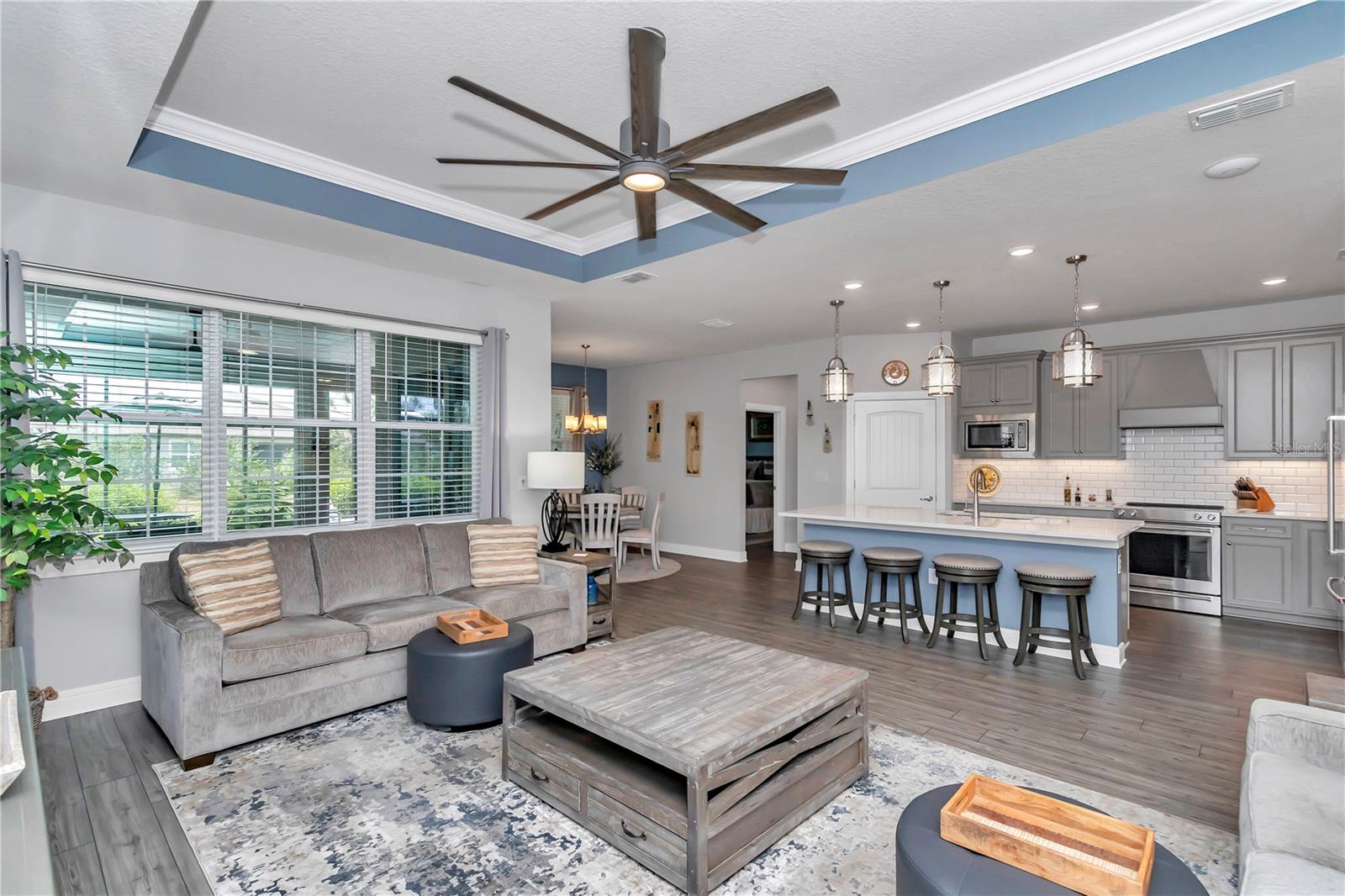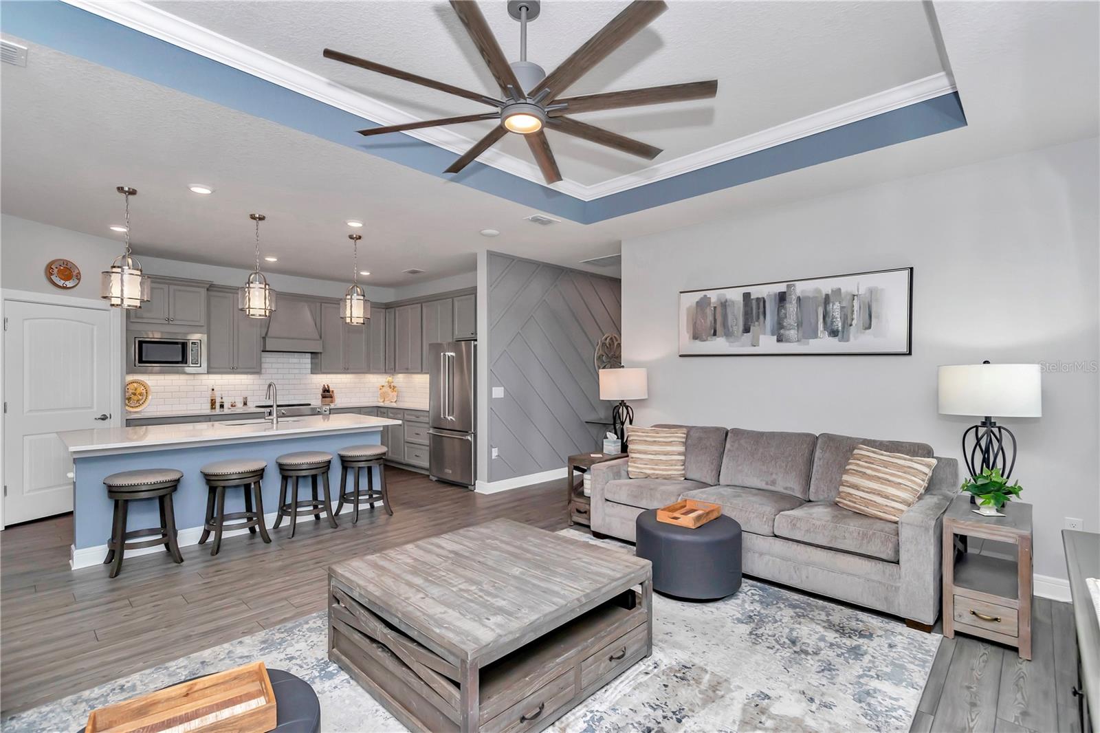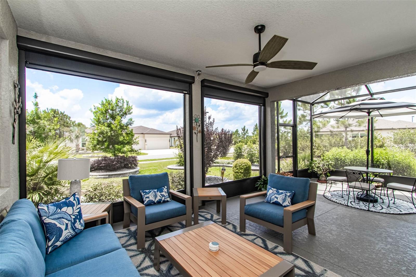 This beautifully maintained 1,923 sq. ft. home sits on a gorgeous landscaped corner lot, offering both privacy and amazing curb appeal. Inside, you'll find 2 spacious bedrooms, 2 full bathrooms, and a versatile flex room with an elegant tray ceiling—perfect for a home office, hobby space, or guest area. The home showcases luxury vinyl plank (LVP) flooring throughout, ceiling fans, and custom window coverings, all complemented by two-tone custom paint and a designer feature wall for a sophisticated touch. The kitchen features; KitchenAid appliances, under-cabinet lighting, pull-out cabinetry, a stylish backsplash, and eye-catching designer pendant lighting. Step outside to the large extended lanai, complete with privacy power screens—ideal for relaxing, enjoying the beautiful landscape or entertaining year-round. Additional highlights include a tandem garage, soft water system, and thoughtfully designed living spaces that combine function with style. Welcome to resort-style living in the highly sought-after 55+ Stone Creek by Del Webb and don't miss your chance to enjoy active adult living at its finest in this thoughtfully designed and upgraded home!
