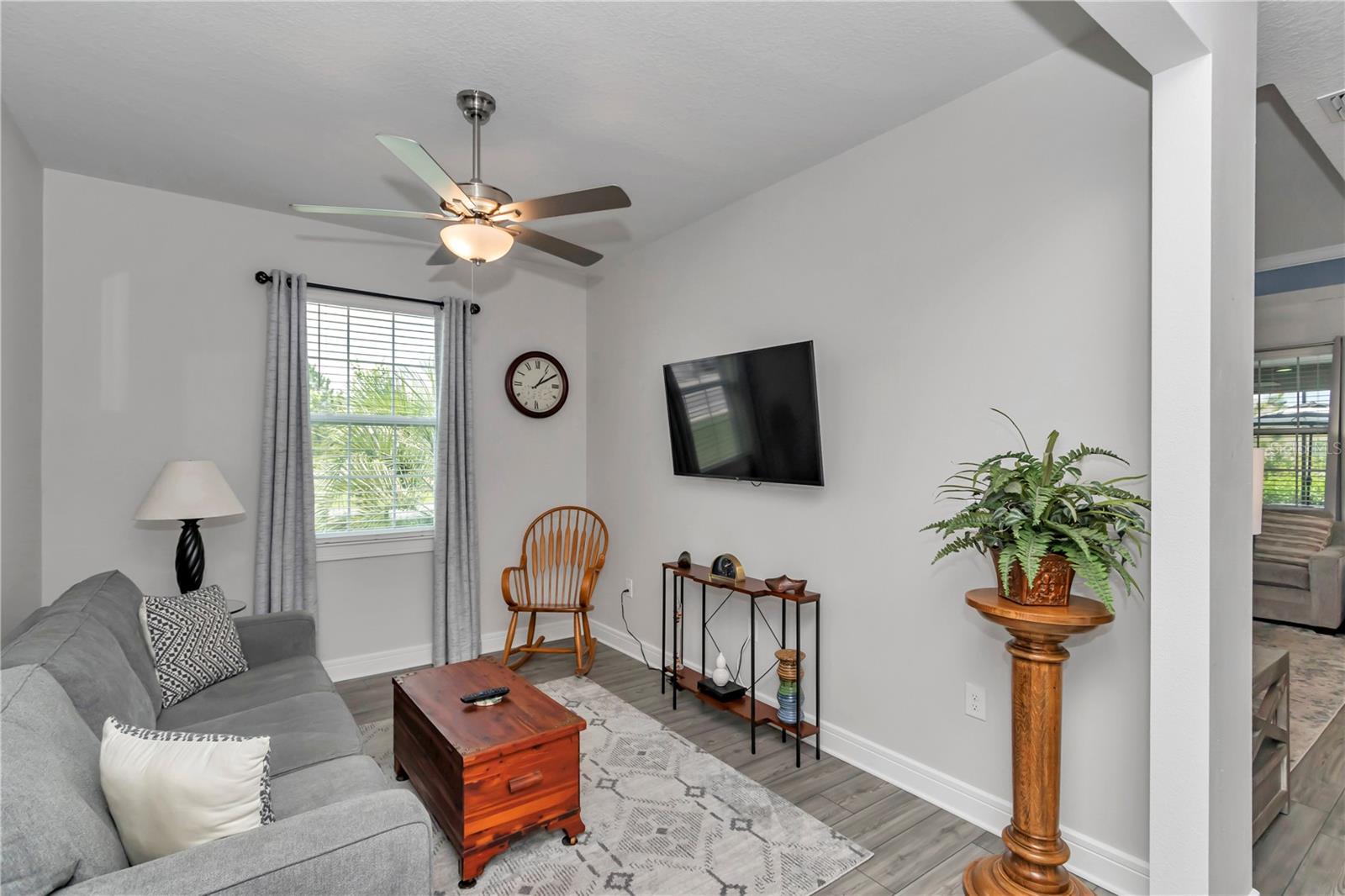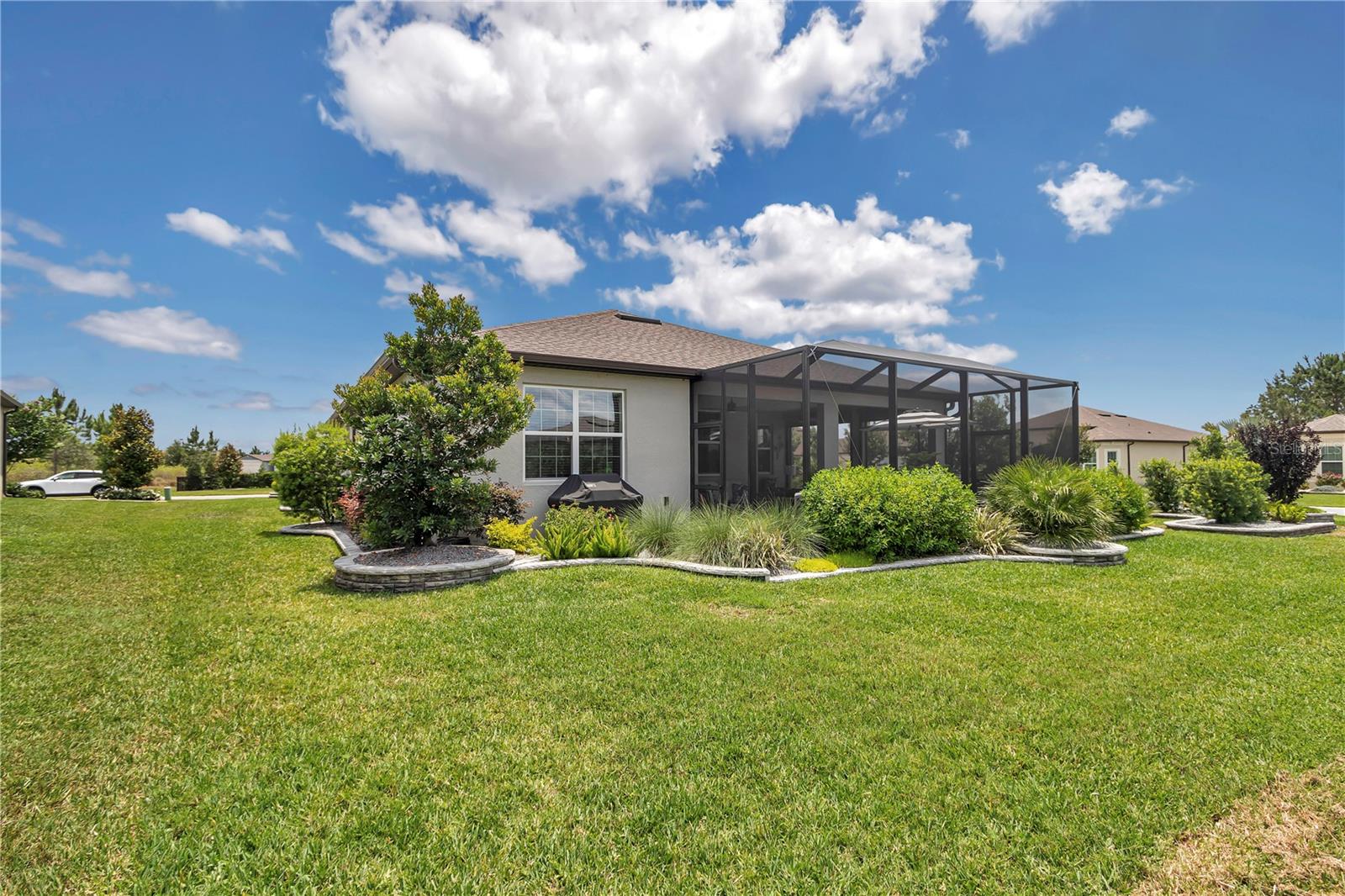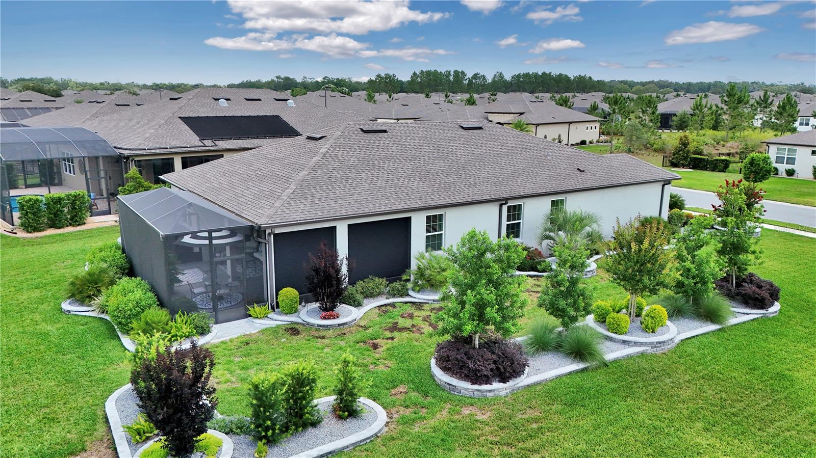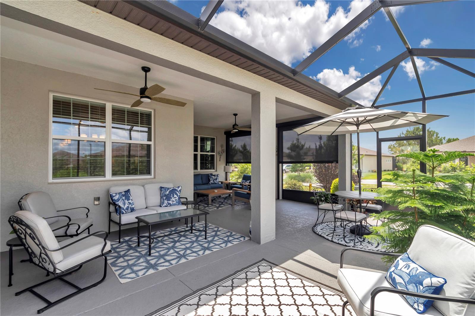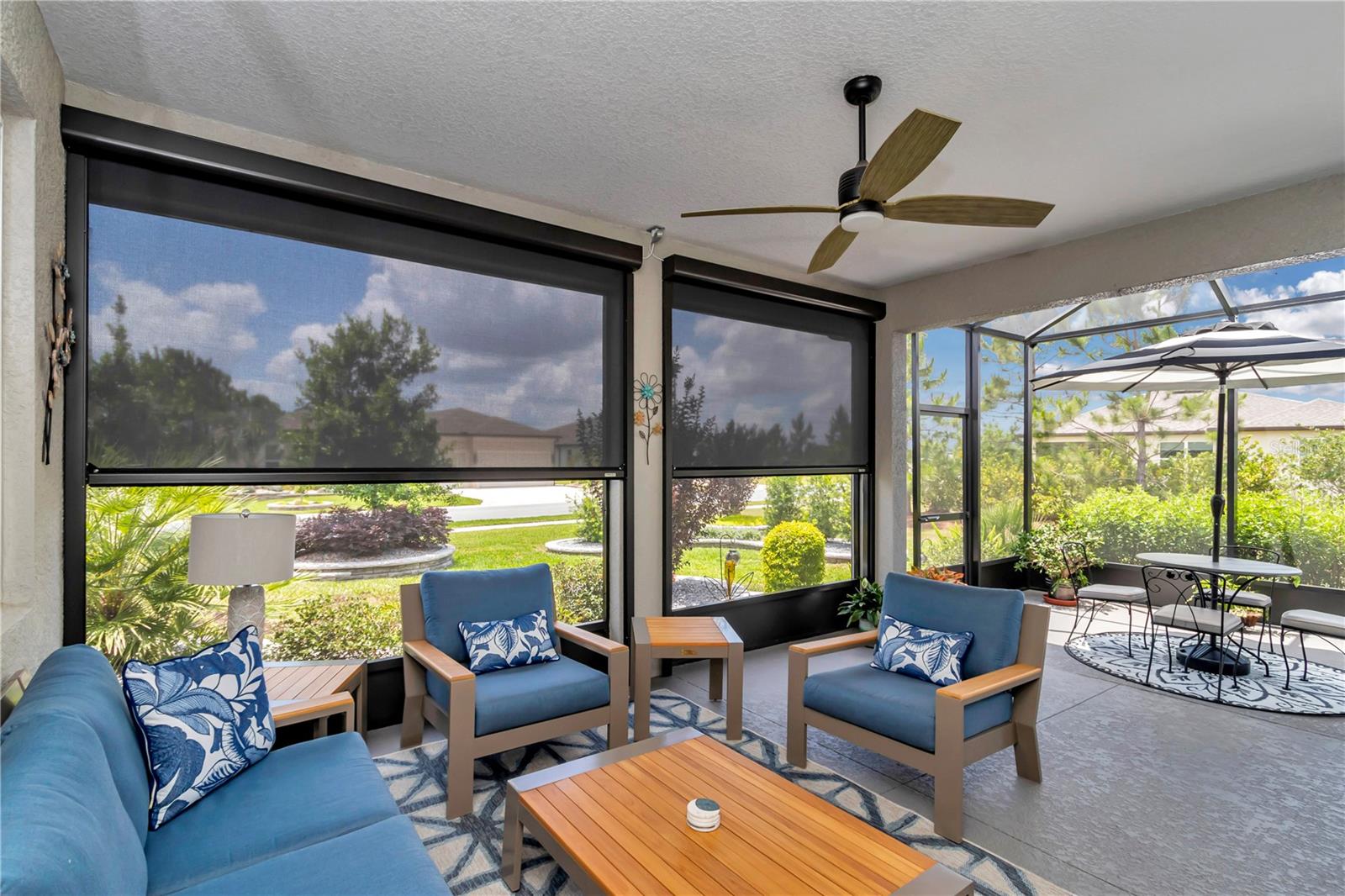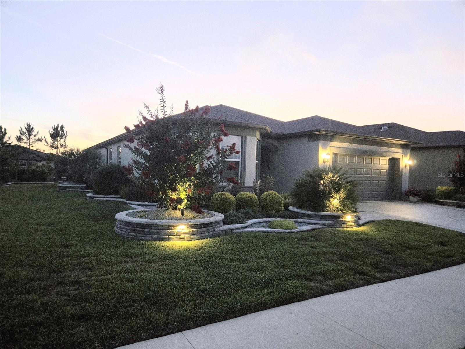 This beautifully maintained 1,923 sq. ft. home sits on a gorgeous landscaped corner lot, offering both privacy and amazing curb appeal. Inside, you'll find 2 spacious bedrooms, 2 full bathrooms, and a versatile flex room with an elegant tray ceiling—perfect for a home office, hobby space, or guest area. The home showcases luxury vinyl plank (LVP) flooring throughout, ceiling fans, and custom window coverings, all complemented by two-tone custom paint and a designer feature wall for a sophisticated touch. The kitchen features; KitchenAid appliances, under-cabinet lighting, pull-out cabinetry, a stylish backsplash, and eye-catching designer pendant lighting. Step outside to the large extended lanai, complete with privacy power screens—ideal for relaxing, enjoying the beautiful landscape or entertaining year-round. Additional highlights include a tandem garage, soft water system, and thoughtfully designed living spaces that combine function with style. Welcome to resort-style living in the highly sought-after 55+ Stone Creek by Del Webb and don't miss your chance to enjoy active adult living at its finest in this thoughtfully designed and upgraded home!
