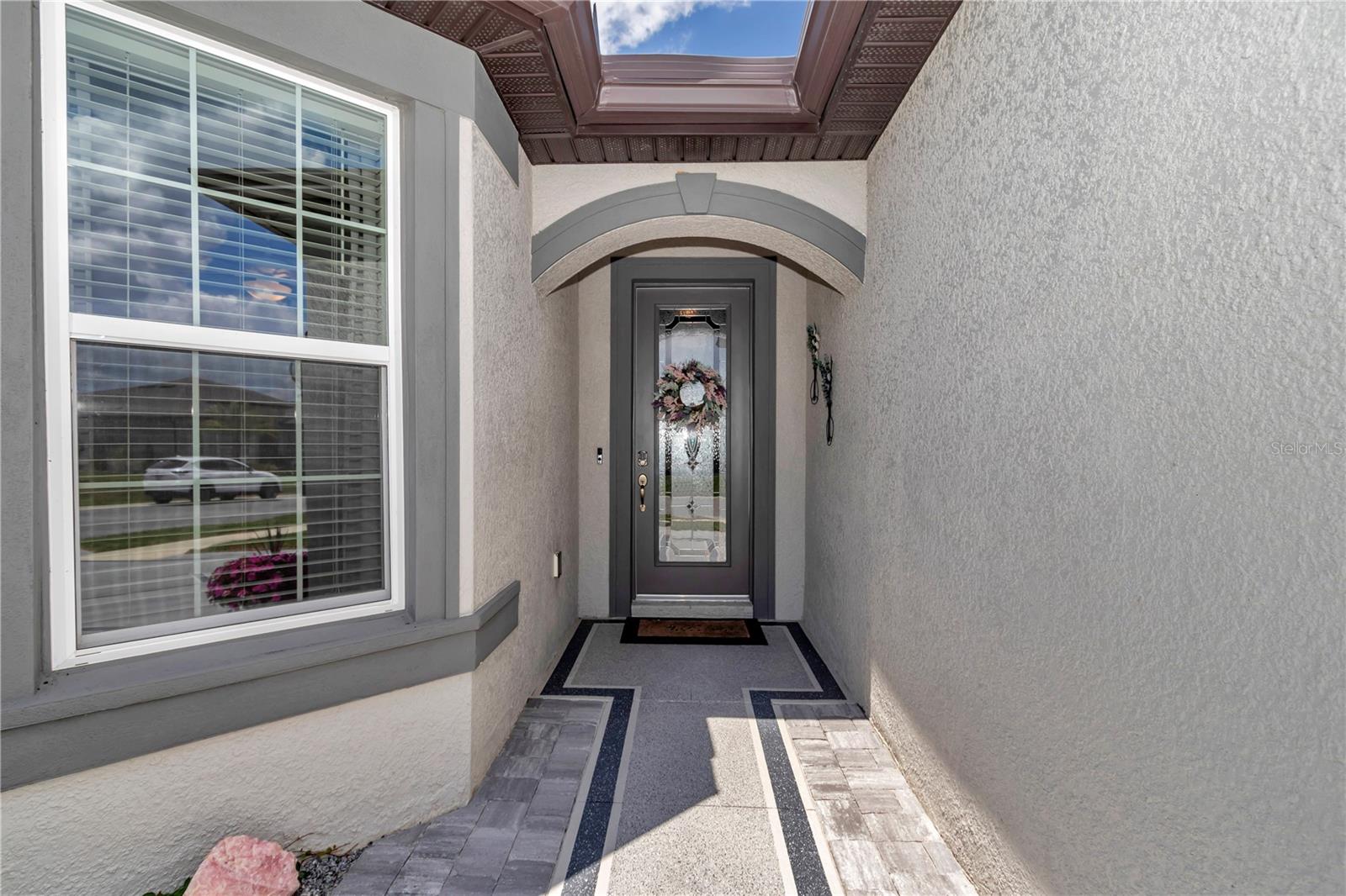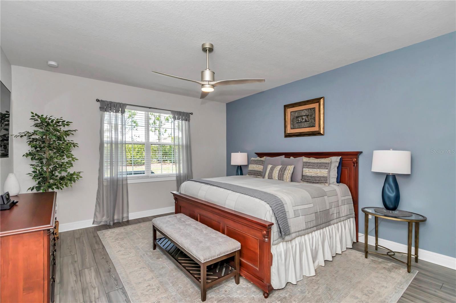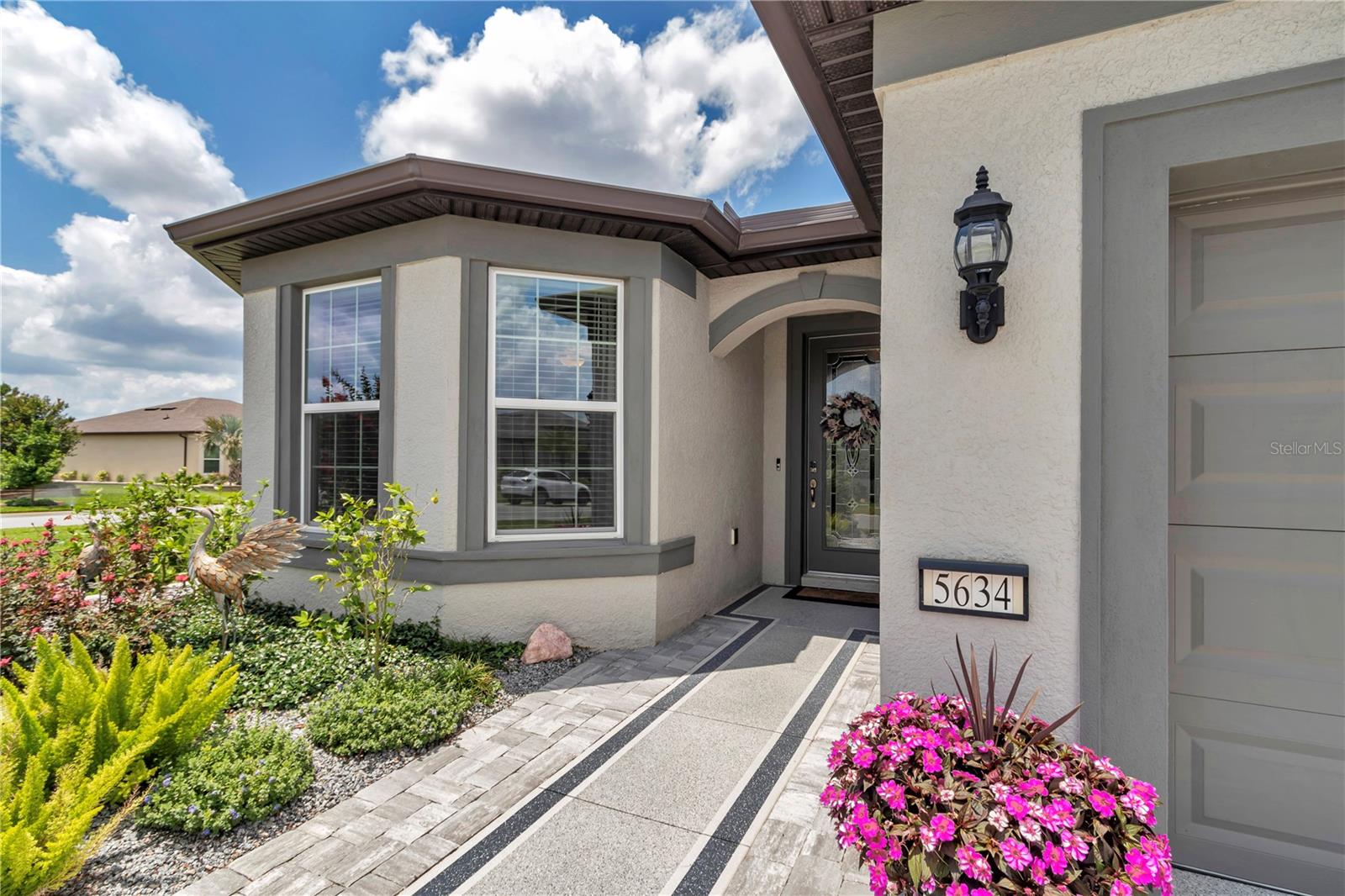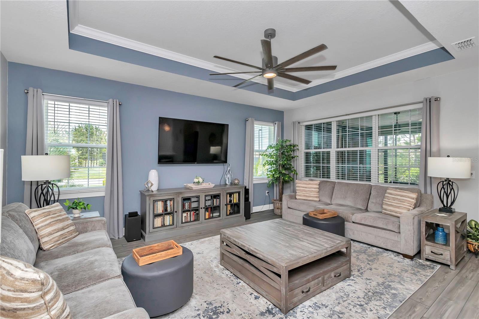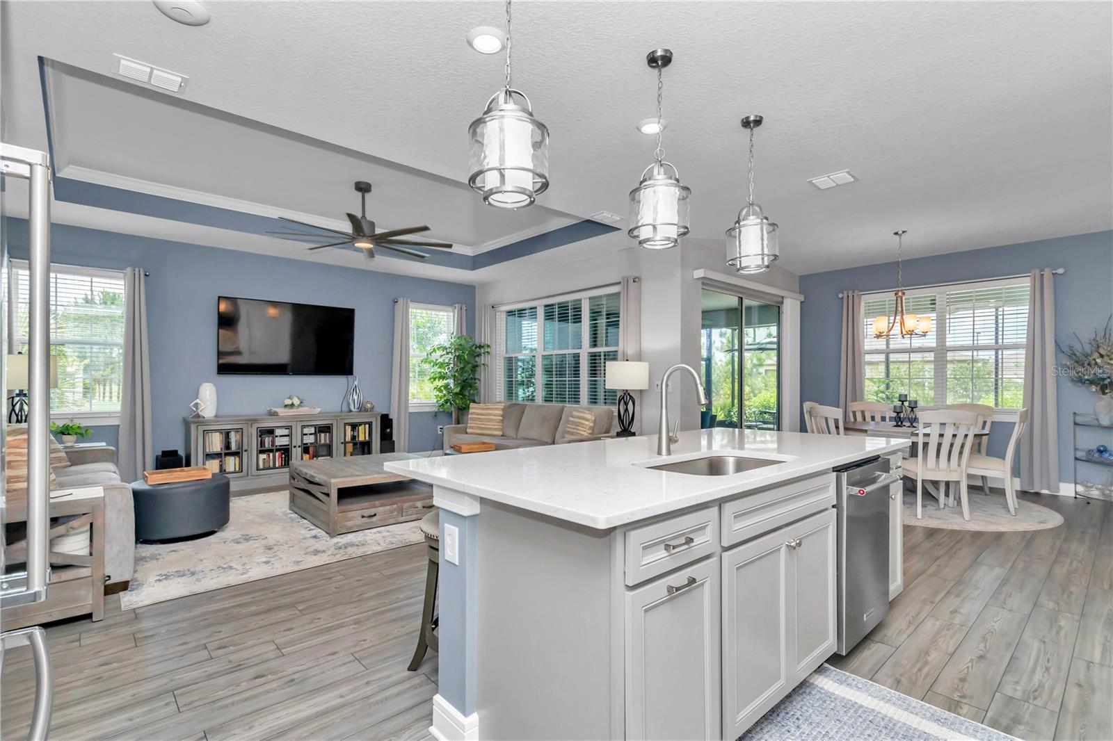 This beautifully maintained 1,923 sq. ft. home sits on a gorgeous landscaped corner lot, offering both privacy and amazing curb appeal. Inside, you'll find 2 spacious bedrooms, 2 full bathrooms, and a versatile flex room with an elegant tray ceiling—perfect for a home office, hobby space, or guest area. The home showcases luxury vinyl plank (LVP) flooring throughout, ceiling fans, and custom window coverings, all complemented by two-tone custom paint and a designer feature wall for a sophisticated touch. The kitchen features; KitchenAid appliances, under-cabinet lighting, pull-out cabinetry, a stylish backsplash, and eye-catching designer pendant lighting. Step outside to the large extended lanai, complete with privacy power screens—ideal for relaxing, enjoying the beautiful landscape or entertaining year-round. Additional highlights include a tandem garage, soft water system, and thoughtfully designed living spaces that combine function with style. Welcome to resort-style living in the highly sought-after 55+ Stone Creek by Del Webb and don't miss your chance to enjoy active adult living at its finest in this thoughtfully designed and upgraded home!