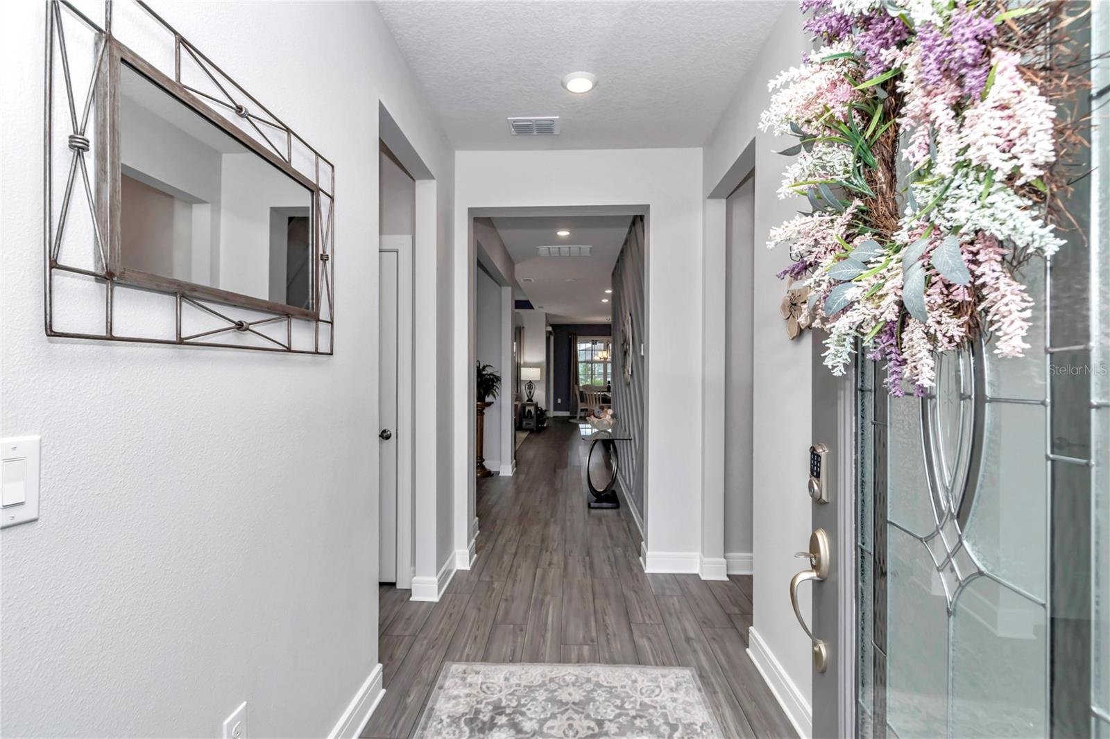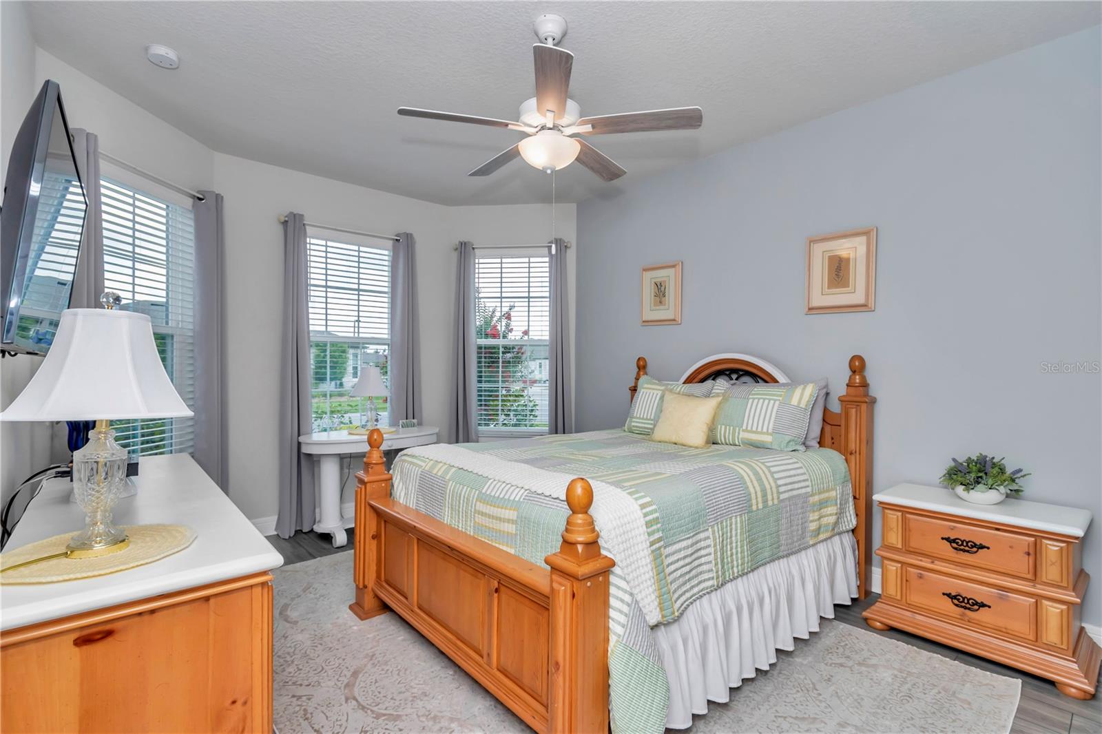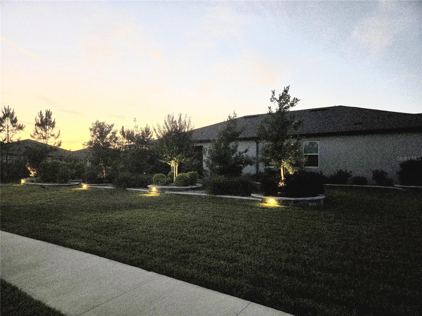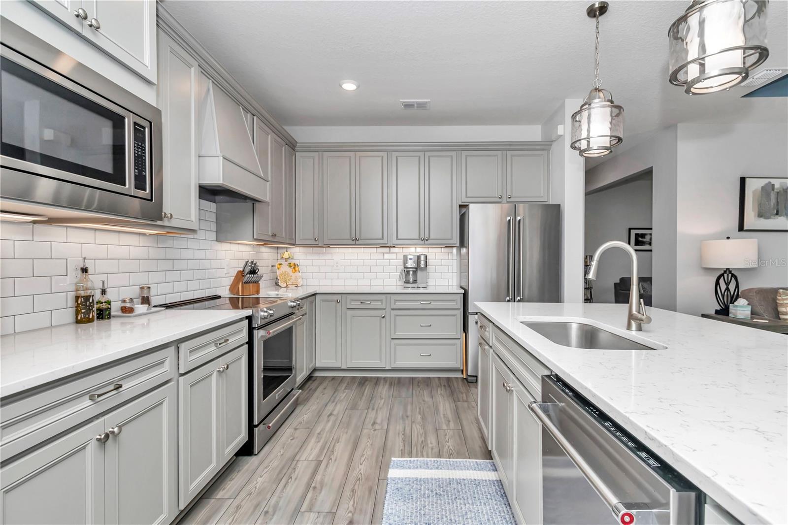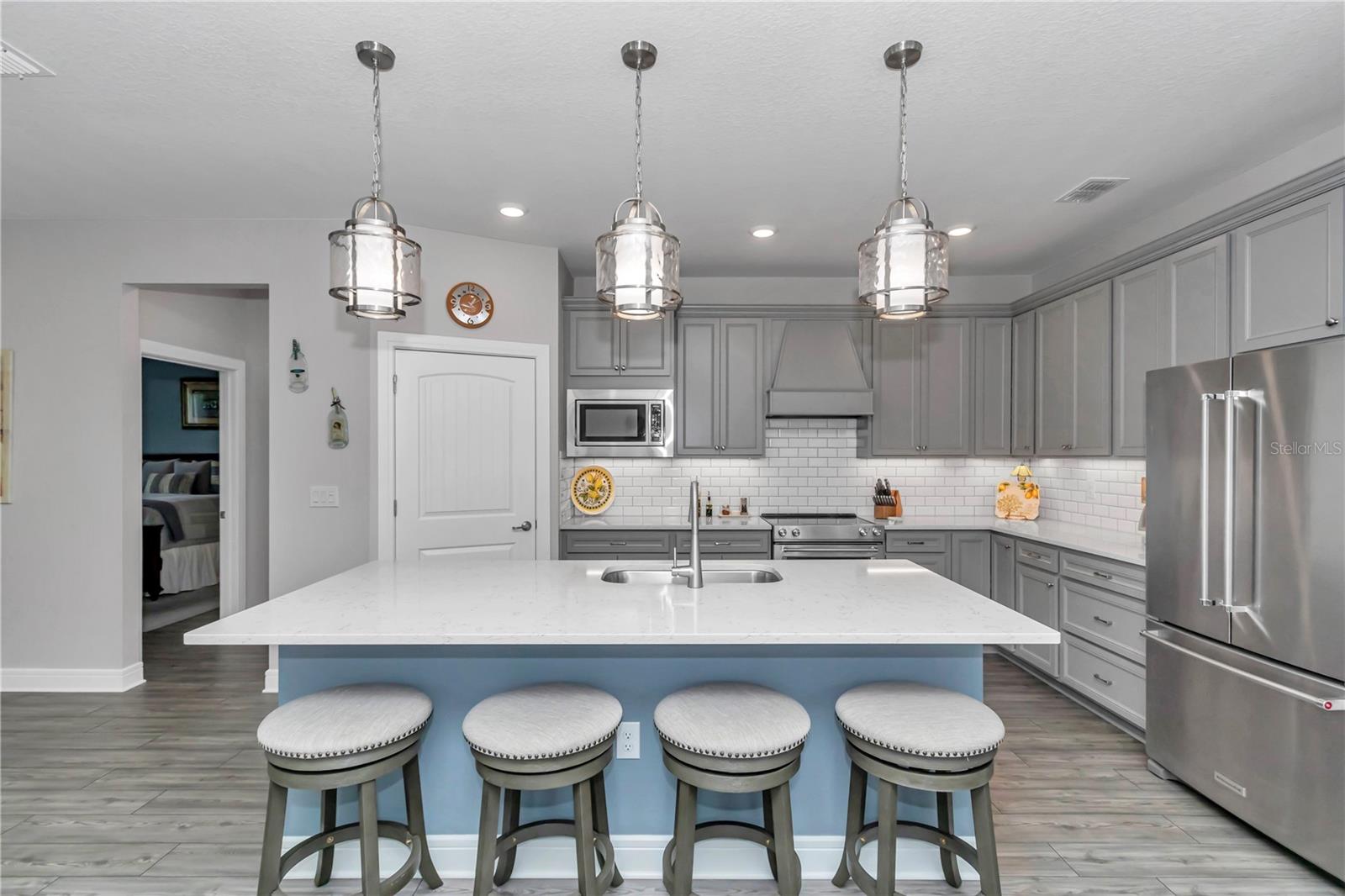 This beautifully maintained 1,923 sq. ft. home sits on a gorgeous landscaped corner lot, offering both privacy and amazing curb appeal. Inside, you'll find 2 spacious bedrooms, 2 full bathrooms, and a versatile flex room with an elegant tray ceiling—perfect for a home office, hobby space, or guest area. The home showcases luxury vinyl plank (LVP) flooring throughout, ceiling fans, and custom window coverings, all complemented by two-tone custom paint and a designer feature wall for a sophisticated touch. The kitchen features; KitchenAid appliances, under-cabinet lighting, pull-out cabinetry, a stylish backsplash, and eye-catching designer pendant lighting. Step outside to the large extended lanai, complete with privacy power screens—ideal for relaxing, enjoying the beautiful landscape or entertaining year-round. Additional highlights include a tandem garage, soft water system, and thoughtfully designed living spaces that combine function with style. Welcome to resort-style living in the highly sought-after 55+ Stone Creek by Del Webb and don't miss your chance to enjoy active adult living at its finest in this thoughtfully designed and upgraded home!