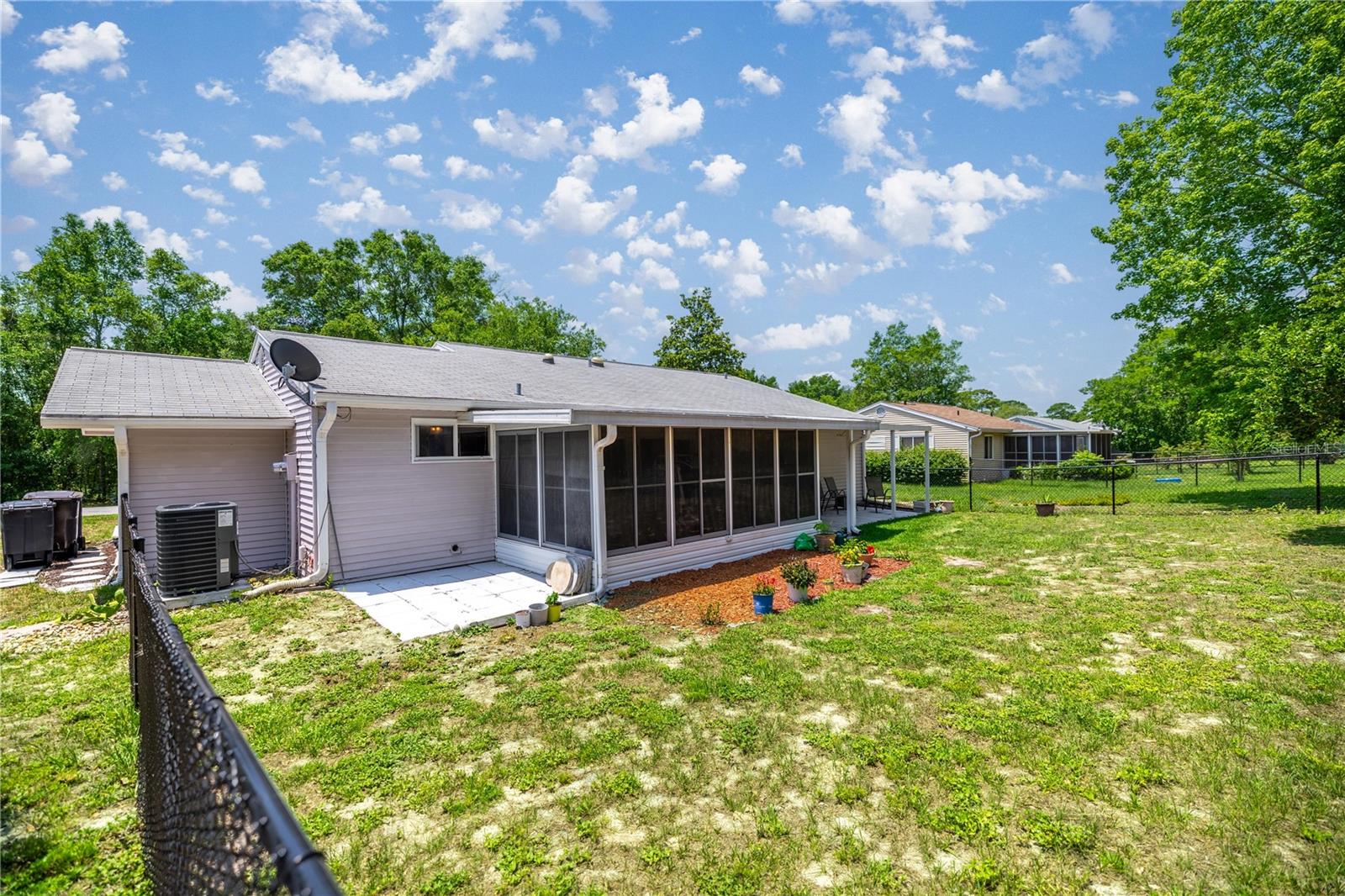 Price reduced-Motivated seller! If you enjoy privacy you will love the private back yard with no rear neighbors! Expanded Hickory model home with 2 Bd 2 BA in the popular Oak Run 55 Plus community. Enjoy a low HOA fee that covers basic cable trash pickup, 24-hour security, and access to all community amenities. Oak Run offers an unbeatable lifestyle with three clubhouses, 5 pools (including one indoor), five hot tubs, two fitness centers, restaurant, a golf course, and over 150 clubs to join. Stay active with shuffleboard, bocce ball, horseshoes, four tennis courts, two pickleball courts, and a billiards room. Additional amenities include a ceramics studio, library, and a dedicated dog park. Large master suite with sitting area, walk-in closet, along with a large living room for entertaining. Kitchen with lots of cabinets space, and a pass-off from kitchen into dining area. The large lanai backs up to nature allowing a nice peaceful Florida evening. The roof is only 8 years old. New AC and ductwork in 2024. Garage features workshop/storage area and laundry room. New floors installed 2023. Backyard newly fenced and Patio expanded in 2023 in addition to: new kitchen sink, stove, and dryer. Come see this charming and affordable beauty before it's gone!