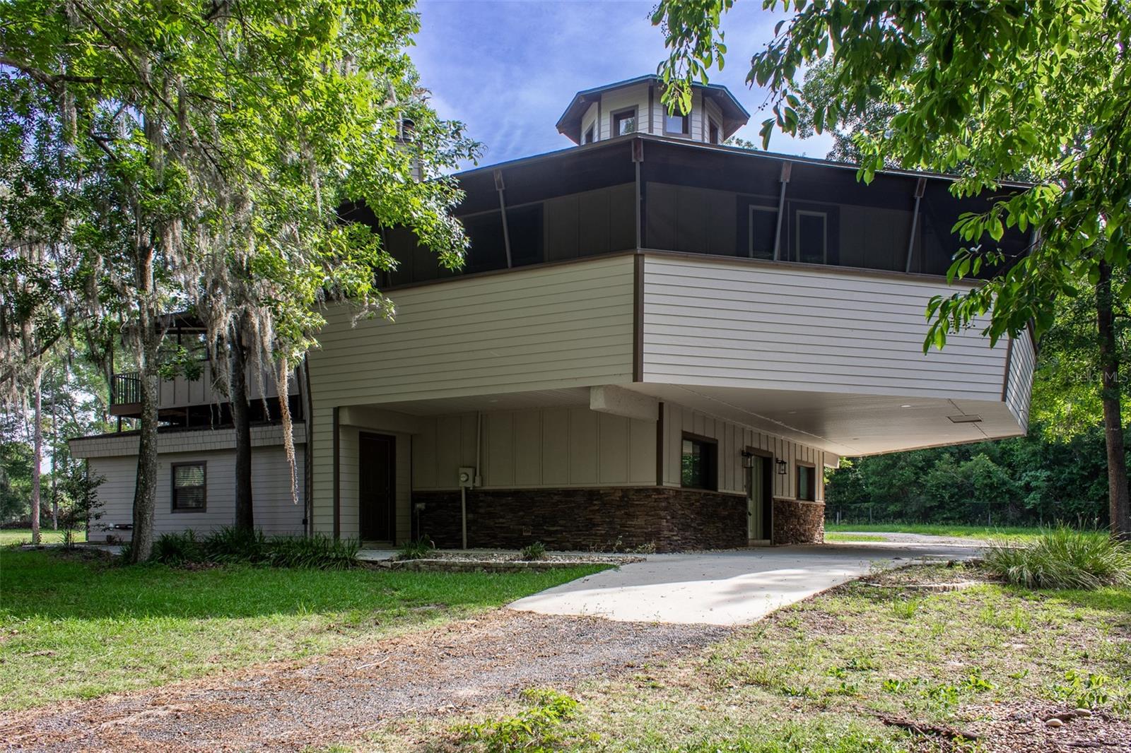 One or more photo(s) has been virtually staged. Adjacent to Ocala Breeder Supply OBS - Nestled beneath mature oak trees on 11.86 acres of cleared land in SW Ocala— adjacent to Ocala Breeders’ Sales—this unique octagonal-designed home blends craftsmanship with country living. A 2020 roof and HVAC system ensure comfort year-round, while the metal-framed workshop can stay a turnkey workspace or be retooled into a barn. Inside, soaring cedar ceilings exposed beams and a spiral staircase guide you into a bright living room anchored by a stone fireplace and custom built-ins. Stained glass windows cast colorful light, hinting at the artistry throughout. Additionally the second story features a full wraparound porch that is screened yet open to gentle breezes - offering panoramic views of pasture and oaks. The kitchen features granite counters, a central island cooktop, farmhouse sink, and vaulted cedar ceiling with pendant lighting. The master suite enjoys its own vaulted ceiling, porch access, and an en-suite bath with a freestanding tub, walk-in shower, and dual vanities atop natural stone floors. Wrap around Balcony and upper deck gives amazing tranquil view of the grounds. The main floor includes three additional bedrooms, a bathroom, a multipurpose room, laundry, and plentiful storage. Outside, ~11.8 acres of prime pasture with oak-shaded area’s invite equestrian pursuits or future agricultural ventures. 40 x 52 Foot out building with bath and 2 overhead doors great for equipment, hobbies, convert to Barn, auto enthusiast. From its octagonal layout and handcrafted details to the wraparound porch and immediate equestrian proximity to Ocala Breeder Sales and minutes from the World Equestrian Center, this home offers a rare combination of form and function. Come experience a property where every element, inside and out, reflects thoughtful design and endless possibility. No HOA or restrictions. Zoned A1. Would be an ideal place near airport and OBS and World Equestrian Center for Horse Enthusiast or short term rental property. Ideal to use now and hold for future investment. Great Central Ocala Location. Priced to sell. Poised for future appreciation. Come and see this one of kind property with so many positive attributes. Imagine the possiblities.