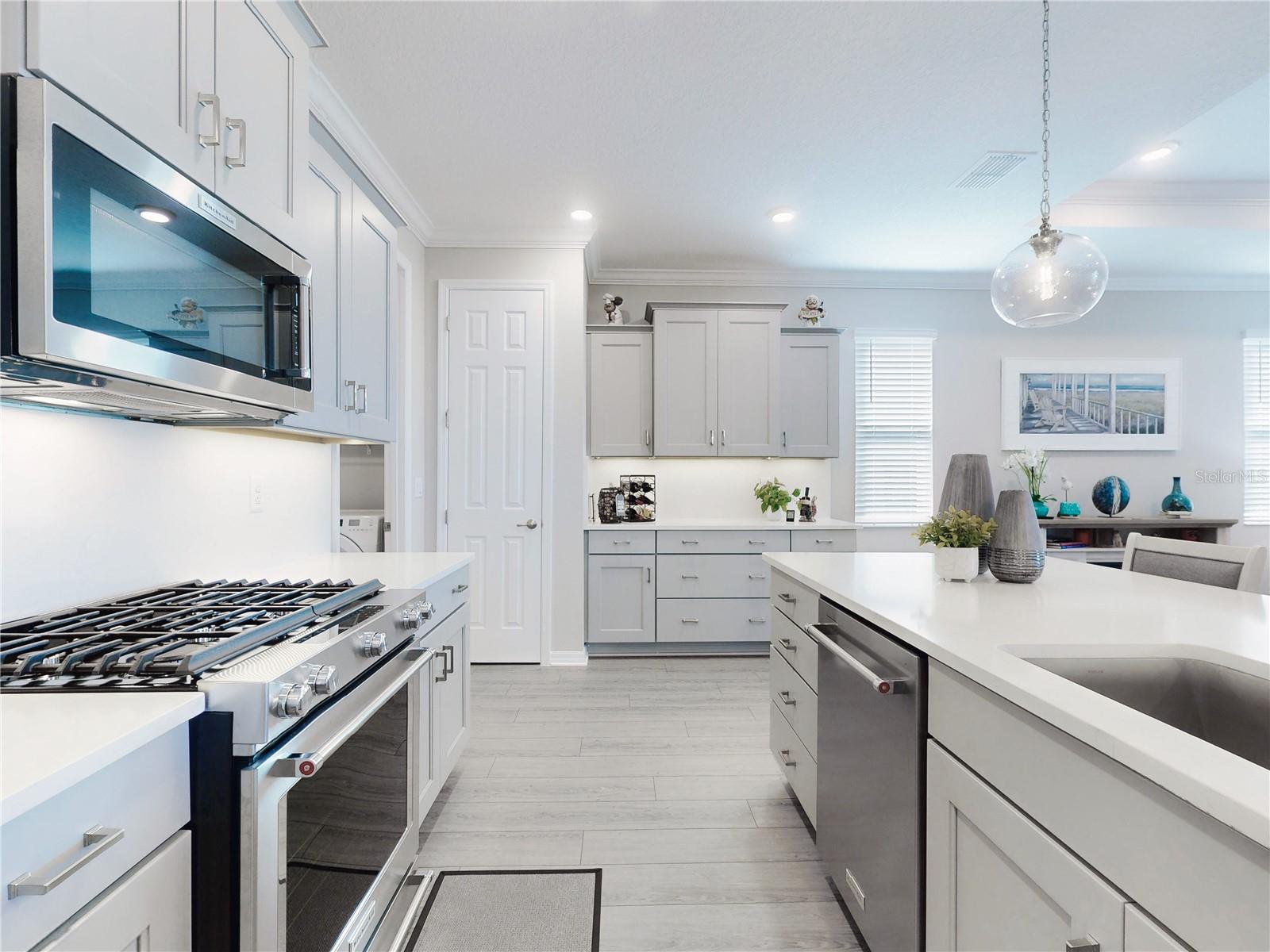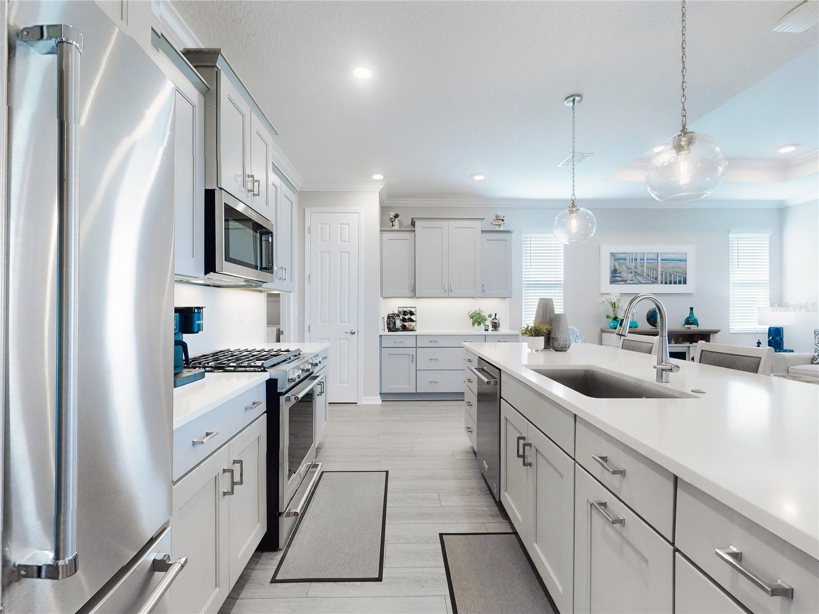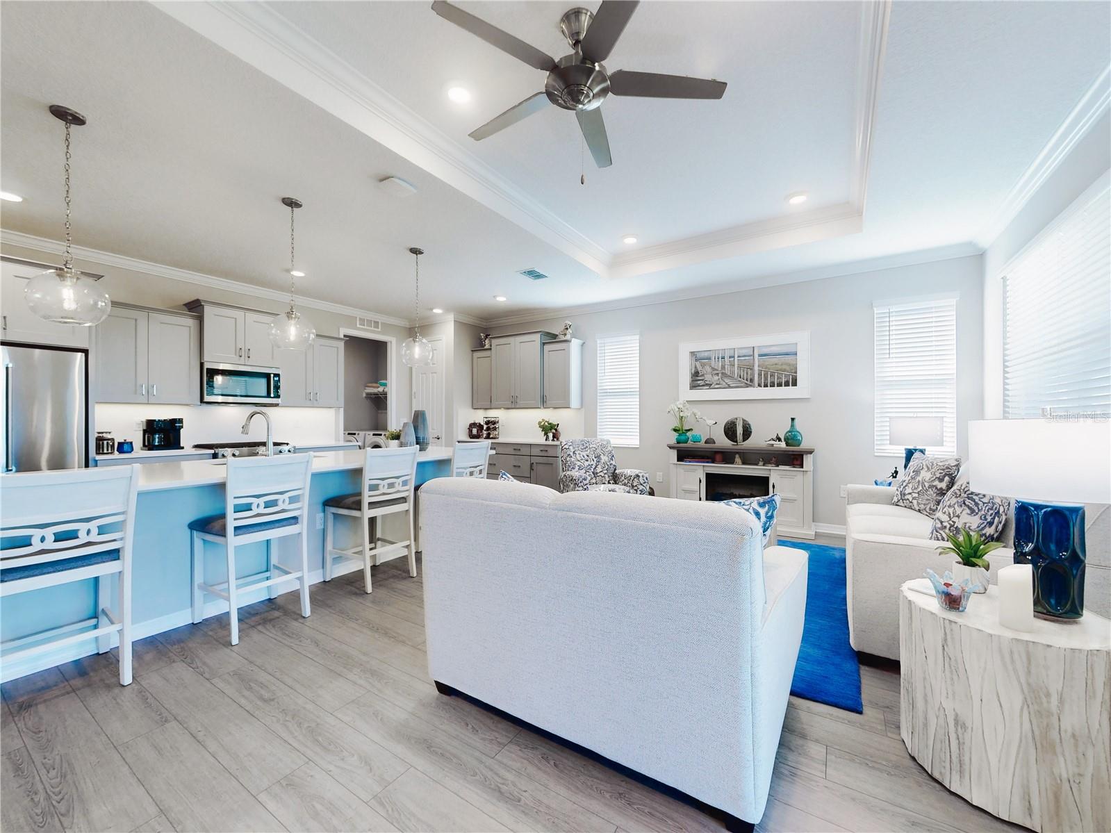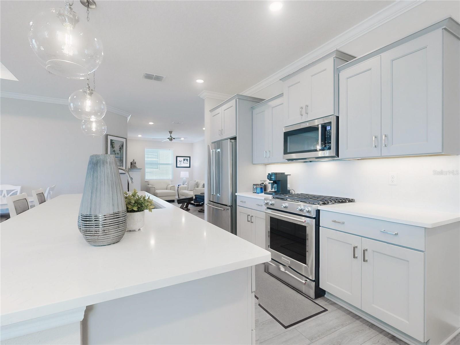 Discover refined living in this beautifully enhanced Ginger model home located in the highly desirable Weybourne Landing community. Furniture is included with a Full Price. This residence offers $74,000 in premium upgrades, exceptional blend of comfort, style, and functionality, featuring 2 bedrooms, 2 bathrooms, and a flex room ideal for a home office, craft space, or guest suite. Home offers window shades with 2" cordless blinds, The Great Room impresses with tray ceilings, crown molding, 8-foot interior doors, 9ft 4"ceilings throughout, and luxury vinyl plank flooring throughout, creating a seamless flow. The chef’s kitchen showcases staggerd cabinets 36 and 42 inch uppers, quartz countertops, Breakfast Bar, stone backsplash, under cabinet lighting, upgraded soft-close cabinetry, a five-burner gas range, French-door counter-depth refrigerator, Kitchen upgraded with Kitchen Aid stainless steel appliances. The Primary Suite offers a private retreat, custom closet system, and a spa-inspired bathroom featuring a quartz dual vanity with oval undermount sinks and an upgraded walk-in shower with built-in seat. The guest bedroom and secondary bath offers a walk-in shower to provide both comfort and style for family or visitors. Relax and entertain year-round in the enclosed, covered, and screened lanai with a 24-inch masonry knee wall offering privacy and comfort. Lanai also offers natural gas to outside grill. Additional highlights include widened driveway to corner of garage with a 2 ft extension added to garage, outside coded garage door opener, water softener. Interior laundry room with cabinetry, washer and dryer. This property offers a serene backyard setting with no neighboring homes behind, backing to a natural dry pond area that enhances privacy and openness, added features, perimeter lighting, irrigation system, ring door bell. This home is truly move-in ready, showcasing high-end finishes and meticulous attention to detail—an exceptional opportunity to enjoy the best of Weybourne Landing living. Furniture is negotiable, golf cart is for sale, has upgraded Lithium battery with wall mounted charger (1 yr. old). Residents enjoy a clubhouse, pool, fitness center, pickleball courts, and with a Gateway Pass, access to all On Top of the World amenities.
