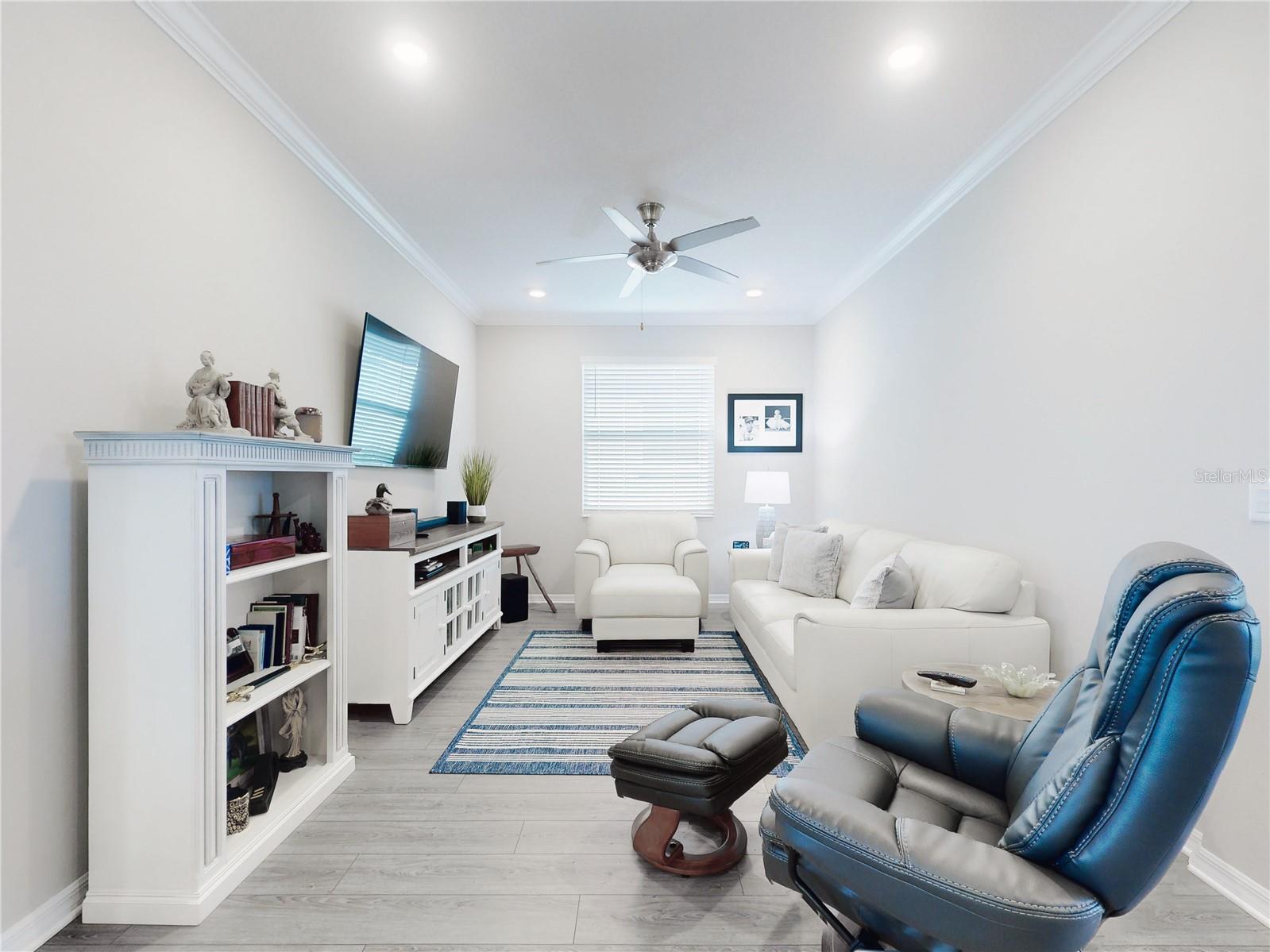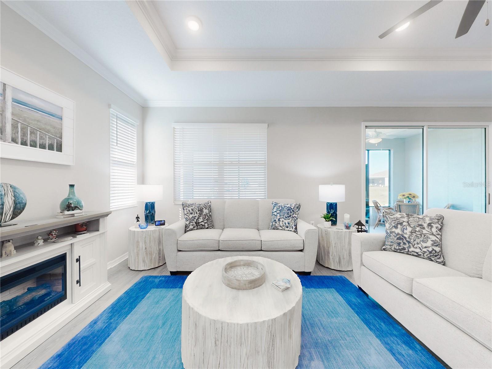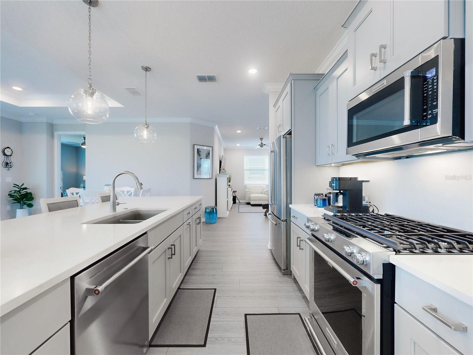 Discover refined living in this beautifully enhanced Ginger model home located in the highly desirable Weybourne Landing community. Furniture is included with a Full Price. This residence offers $74,000 in premium upgrades, exceptional blend of comfort, style, and functionality, featuring 2 bedrooms, 2 bathrooms, and a flex room ideal for a home office, craft space, or guest suite. Home offers window shades with 2" cordless blinds, The Great Room impresses with tray ceilings, crown molding, 8-foot interior doors, 9ft 4"ceilings throughout, and luxury vinyl plank flooring throughout, creating a seamless flow. The chef’s kitchen showcases staggerd cabinets 36 and 42 inch uppers, quartz countertops, Breakfast Bar, stone backsplash, under cabinet lighting, upgraded soft-close cabinetry, a five-burner gas range, French-door counter-depth refrigerator, Kitchen upgraded with Kitchen Aid stainless steel appliances. The Primary Suite offers a private retreat, custom closet system, and a spa-inspired bathroom featuring a quartz dual vanity with oval undermount sinks and an upgraded walk-in shower with built-in seat. The guest bedroom and secondary bath offers a walk-in shower to provide both comfort and style for family or visitors. Relax and entertain year-round in the enclosed, covered, and screened lanai with a 24-inch masonry knee wall offering privacy and comfort. Lanai also offers natural gas to outside grill. Additional highlights include widened driveway to corner of garage with a 2 ft extension added to garage, outside coded garage door opener, water softener. Interior laundry room with cabinetry, washer and dryer. This property offers a serene backyard setting with no neighboring homes behind, backing to a natural dry pond area that enhances privacy and openness, added features, perimeter lighting, irrigation system, ring door bell. This home is truly move-in ready, showcasing high-end finishes and meticulous attention to detail—an exceptional opportunity to enjoy the best of Weybourne Landing living. Furniture is negotiable, golf cart is for sale, has upgraded Lithium battery with wall mounted charger (1 yr. old). Residents enjoy a clubhouse, pool, fitness center, pickleball courts, and with a Gateway Pass, access to all On Top of the World amenities.