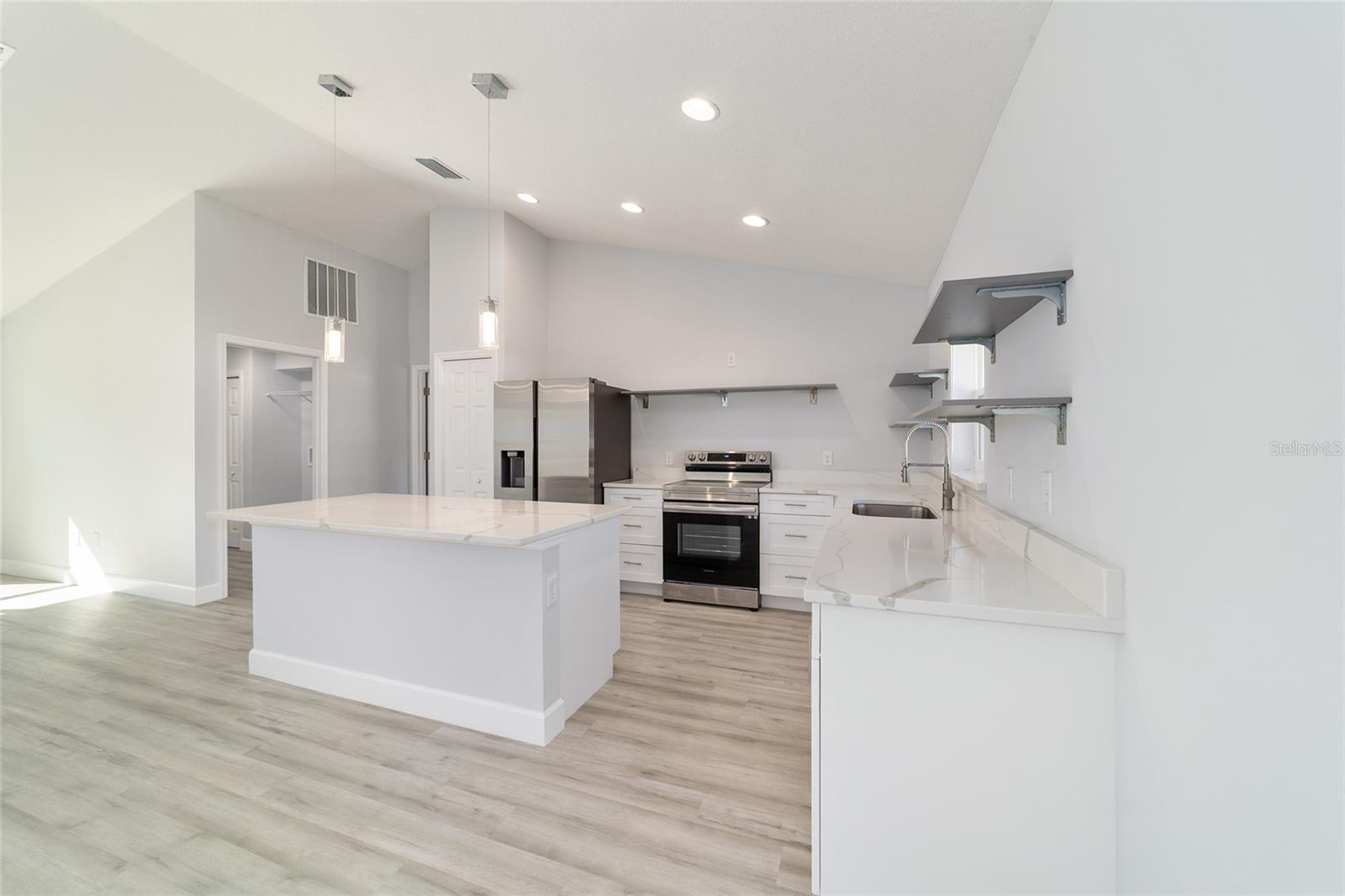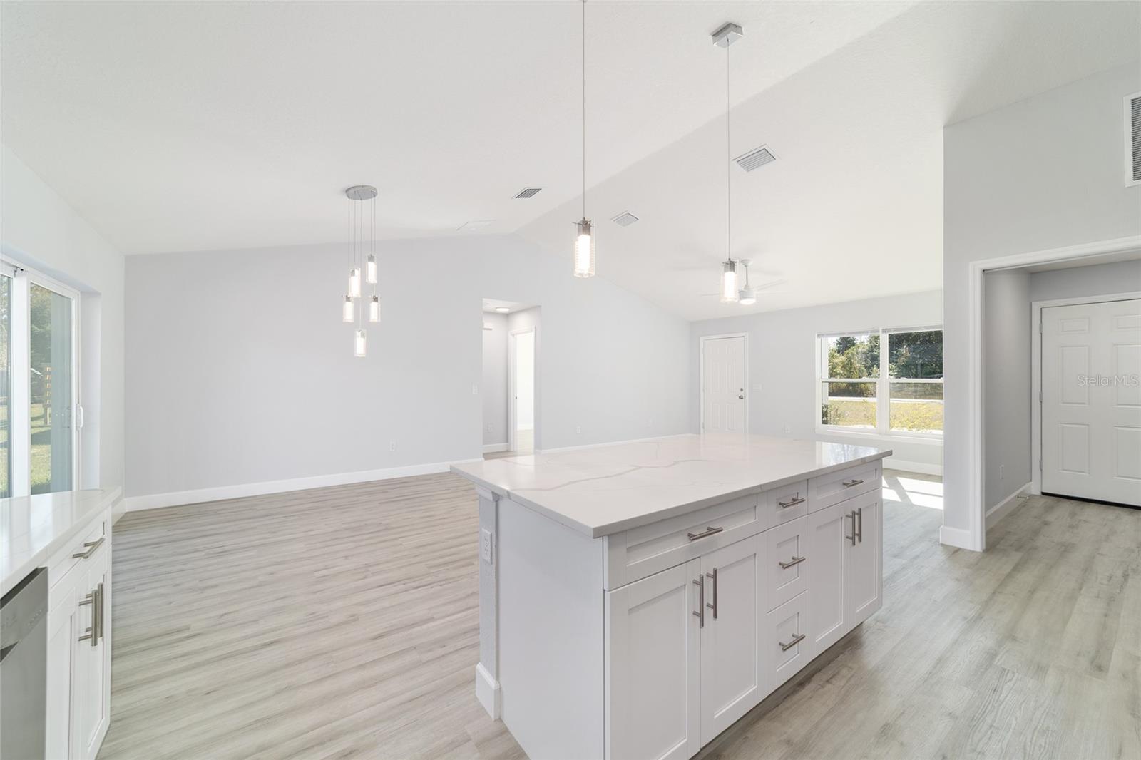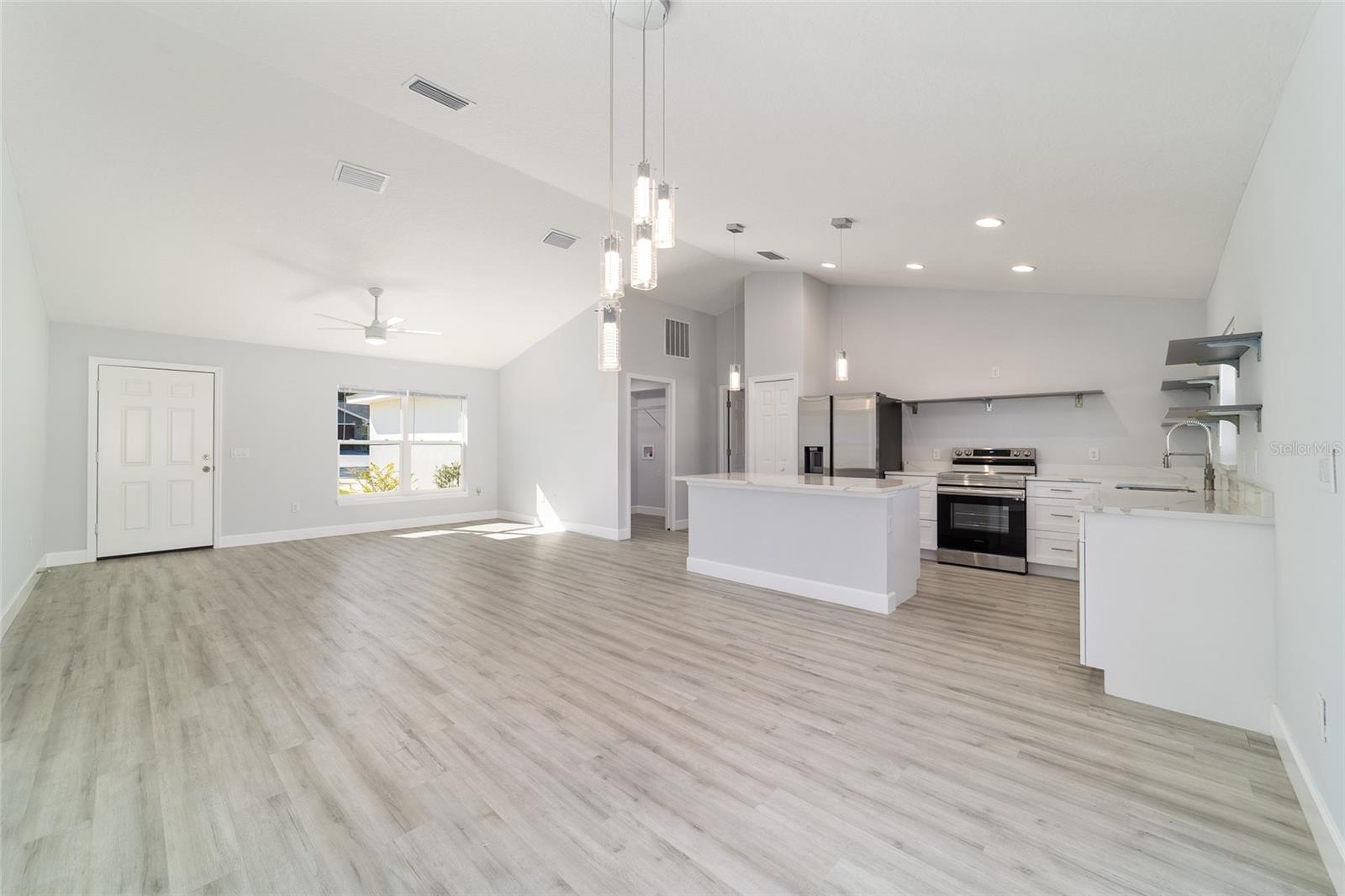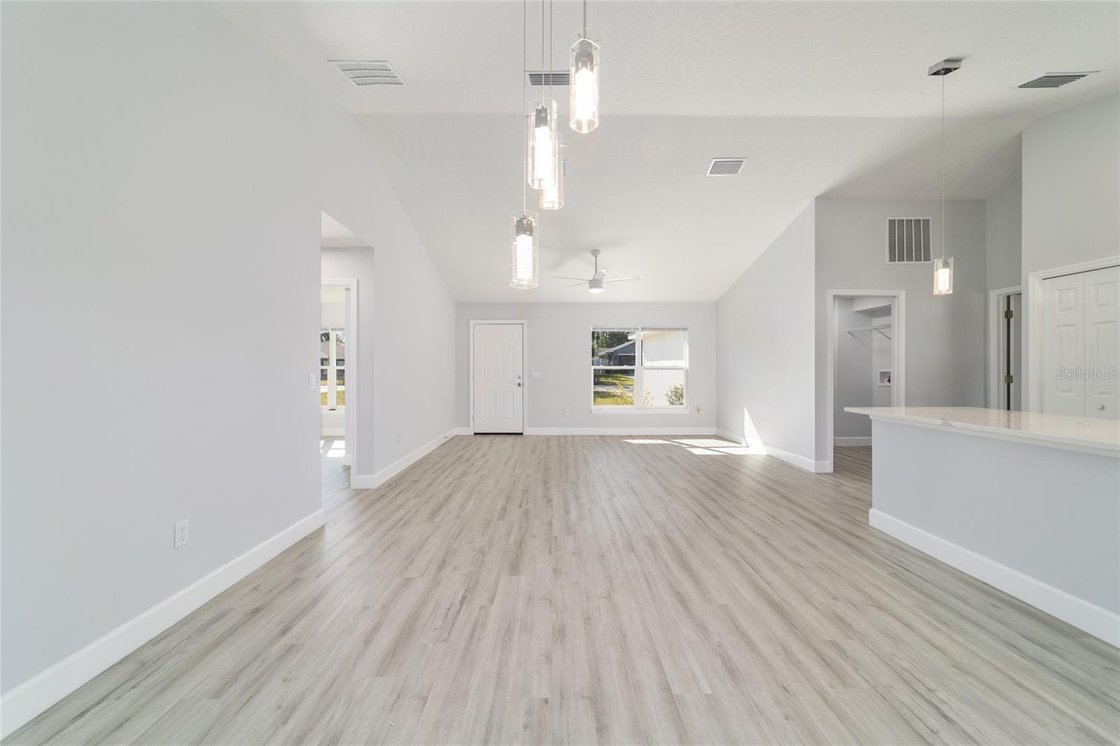 Welcome to this beautifully maintained 2023 “Benedicto” Model by Bakan Homes—offering 1,380 square feet of living area and a total footprint of 1,972 square feet. Featuring 8’ ceilings in the bedrooms and vaulted ceilings in the main living spaces, this home feels open, comfortable, and full of natural light. Located in the sought-after Rainbow Park subdivision on a rare paved road, this property blends modern living with a rustic touch. The kitchen showcases soft-close base cabinets paired with stylish open shelving, elegant quartz countertops, a spacious island with seeded LED pendant lighting, and stainless-steel appliances—including a dishwasher. Luxury water-resistant vinyl plank flooring flows throughout the home, combining beauty, durability, and easy maintenance—ideal for families and pet owners. Additional features include recessed lighting, ceiling fans in all bedrooms, and thoughtful design elements that elevate the home’s functionality and charm. This 2023 home has been lightly lived in by one tenant and is being offered as-is, but it has been exceptionally cared for and still feels like new.
