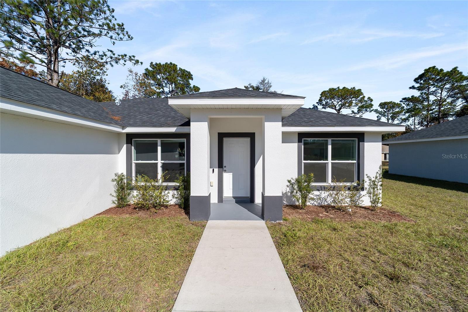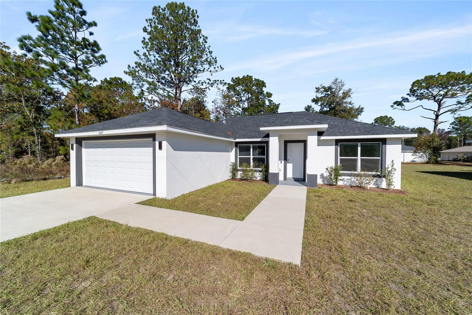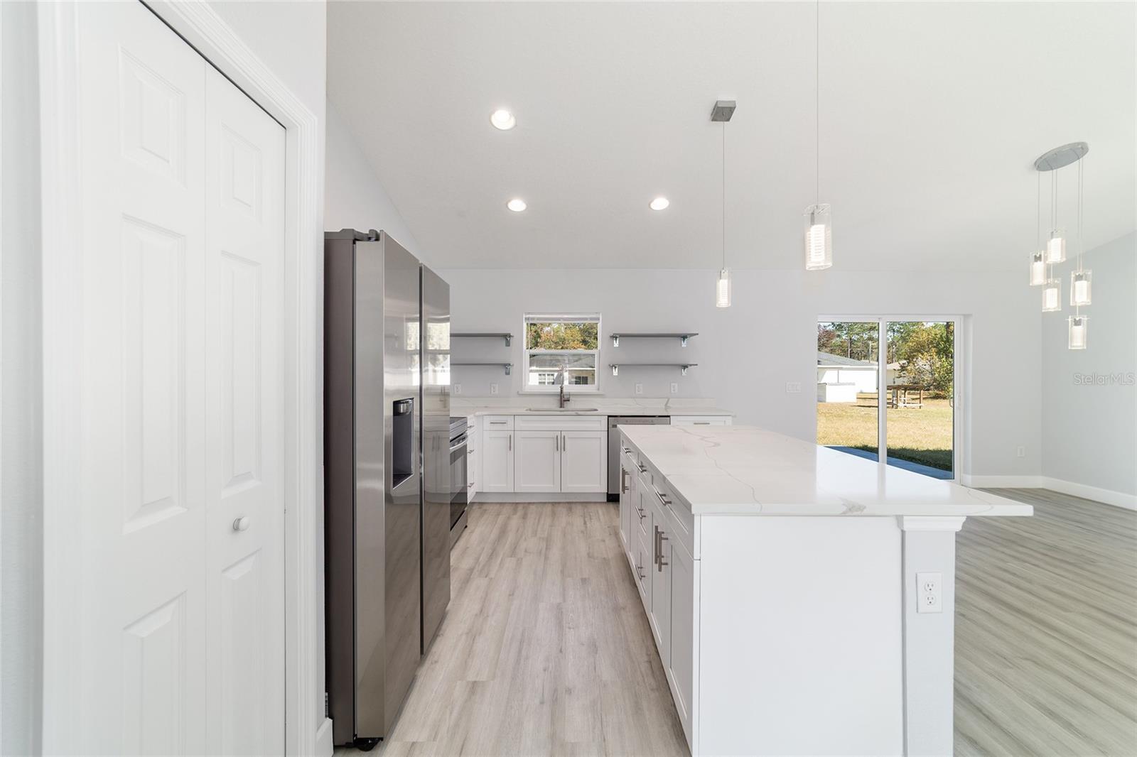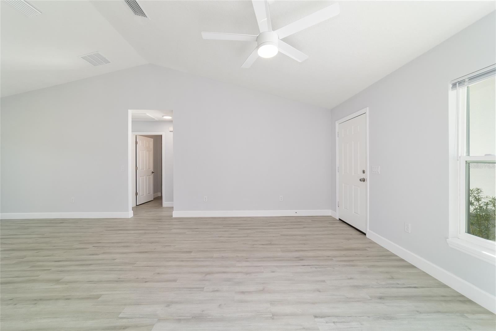 Welcome to this beautifully maintained 2023 “Benedicto” Model by Bakan Homes—offering 1,380 square feet of living area and a total footprint of 1,972 square feet. Featuring 8’ ceilings in the bedrooms and vaulted ceilings in the main living spaces, this home feels open, comfortable, and full of natural light. Located in the sought-after Rainbow Park subdivision on a rare paved road, this property blends modern living with a rustic touch. The kitchen showcases soft-close base cabinets paired with stylish open shelving, elegant quartz countertops, a spacious island with seeded LED pendant lighting, and stainless-steel appliances—including a dishwasher. Luxury water-resistant vinyl plank flooring flows throughout the home, combining beauty, durability, and easy maintenance—ideal for families and pet owners. Additional features include recessed lighting, ceiling fans in all bedrooms, and thoughtful design elements that elevate the home’s functionality and charm. This 2023 home has been lightly lived in by one tenant and is being offered as-is, but it has been exceptionally cared for and still feels like new.