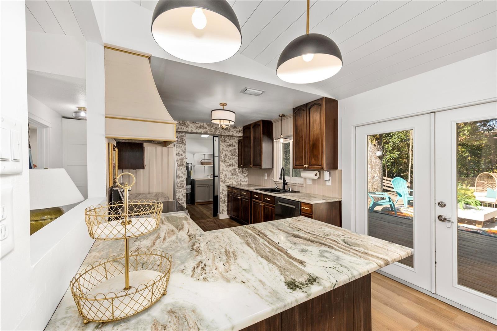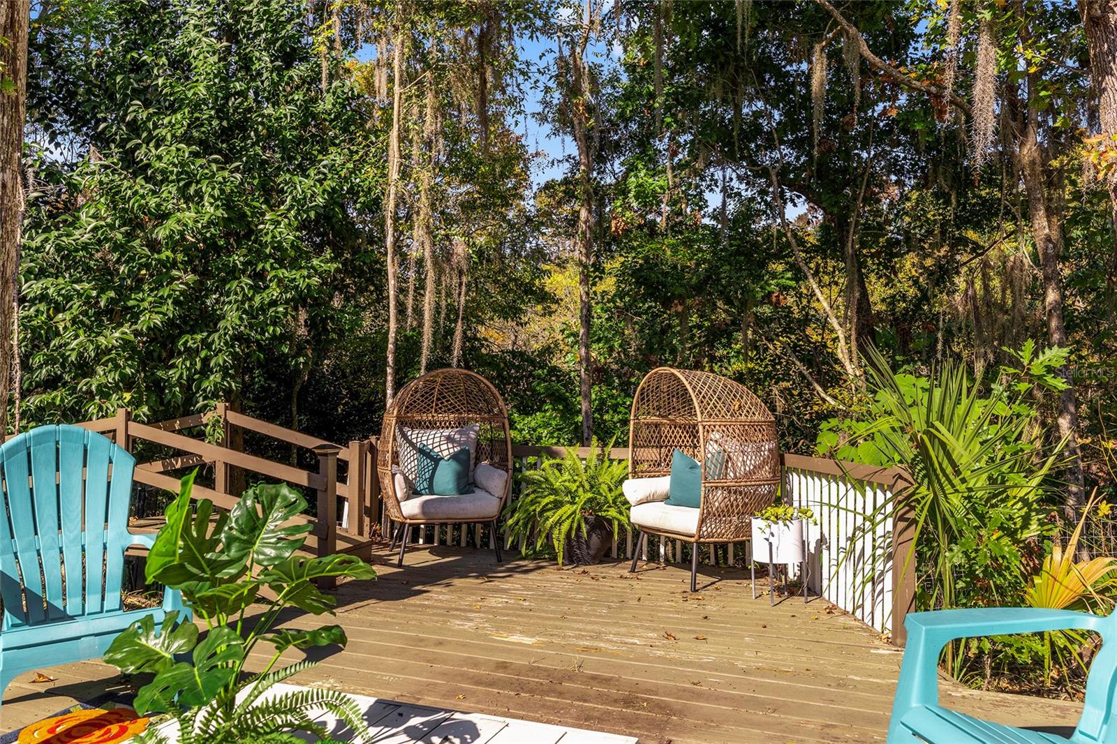 This beautifully crafted residence is a hidden gem! Tucked just minutes from town yet privately nestled among mature tree tops, this home offers a sense of peaceful seclusion that is rarely found so close to everyday conveniences. Step inside to an inviting open layout accented by vaulted ceilings, curated finishes, and a wood-burning fireplace that brings warmth to the main living space. A wall of windows in the dining area frames lush, treetop views, filling the home with natural light and creating a serene atmosphere. The adjoining elevated wooden deck extends the living space outdoors, offering an enchanting perch for morning coffee or afternoon lounging beneath the canopy. With 2 bedrooms and 2 baths, the floor plan feels efficient and easy to live in. An elegant blue owners bedroom and a fun and colorful second bedroom/play area with an en-suite bath. Outside, enjoy a fenced in yard, 2 car covered carport, and extra storage room or workshop area. Recent improvements: 2025-replacement of ten windows, 2023-HVAC, 2021-Foundation underpinning, 2016-Roof.