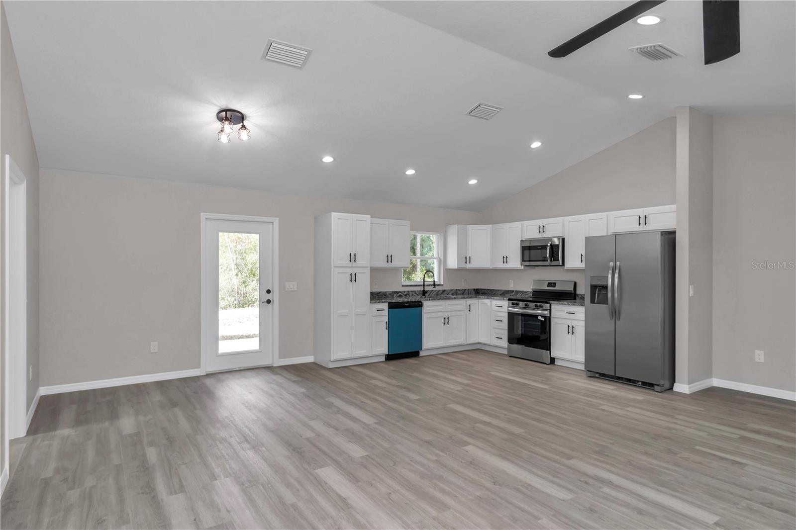 Move-in-ready new construction in Rainbow Park Estates! This 3-bedroom, 2-bath home sits on an oversized lot and includes a 1-year builder’s warranty for added peace of mind. The open living area features vaulted ceilings that create a bright, spacious feel, along with an open-concept kitchen ideal for everyday living and entertaining. A split bedroom layout offers privacy, while the owner’s suite includes a walk-in closet and well-appointed bath. Granite countertops, wood-look vinyl flooring, and modern fixtures are featured throughout. The oversized lot provides space for outdoor living, a pool, or future customization. Conveniently located within approximately 15 minutes of the World Equestrian Center, Juliette Falls Golf Course, and Rainbow Springs.