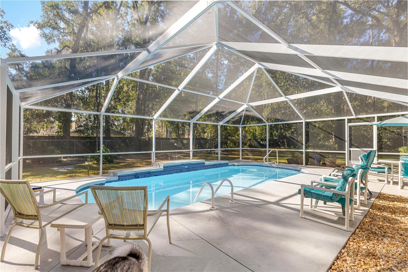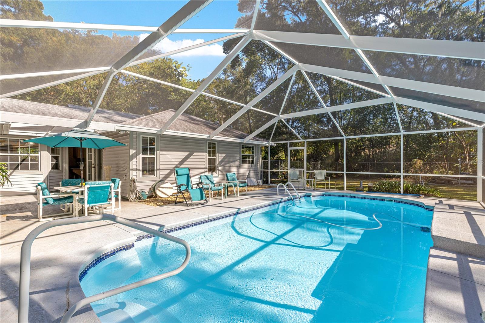 Beautiful South East Ocala pool home on 0.99 acres. Rare find for a large priviate lot almost an acre, with an in-town location minutes to downtown Ocala. Charming home with over 2,000 sq ft under air, and total space over 4,000 total SQ feet. This well-maintained 3 bedroom, 2 bath, 2-car garage home features a spacious living room with cathedral ceilings and a wood-burning fireplace, plus a formal dining room with pocket doors. The eat-in kitchen offers a center island, abundant cabinet and counter space, and a built-in desk, along with an additional dining area. The primary suite includes a walk-in closet, jetted corner tub, walk-in tiled shower, and dual-sink vanity. Two guest bedrooms and a guest bath with direct access to the pool lanai provide comfort and convenience. Inside laundry room includes storage cabinets and a utility sink. Outdoor living shines with a screen-enclosed, electric-heated pool featuring multiple seating areas, plus a separate screen-enclosed porch overlooking the fenced backyard. Property offers privacy, mature trees, and ample space for relaxation or entertainment. Move-in ready SE Ocala home close to schools, hospitals, parks, shopping, dining and more.