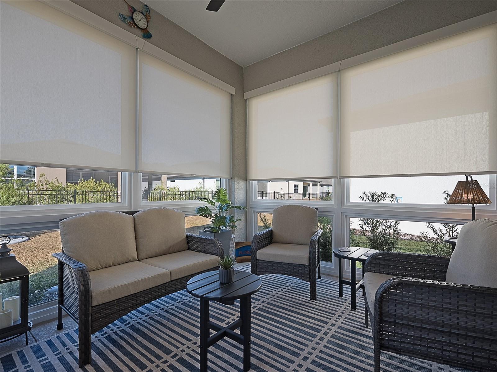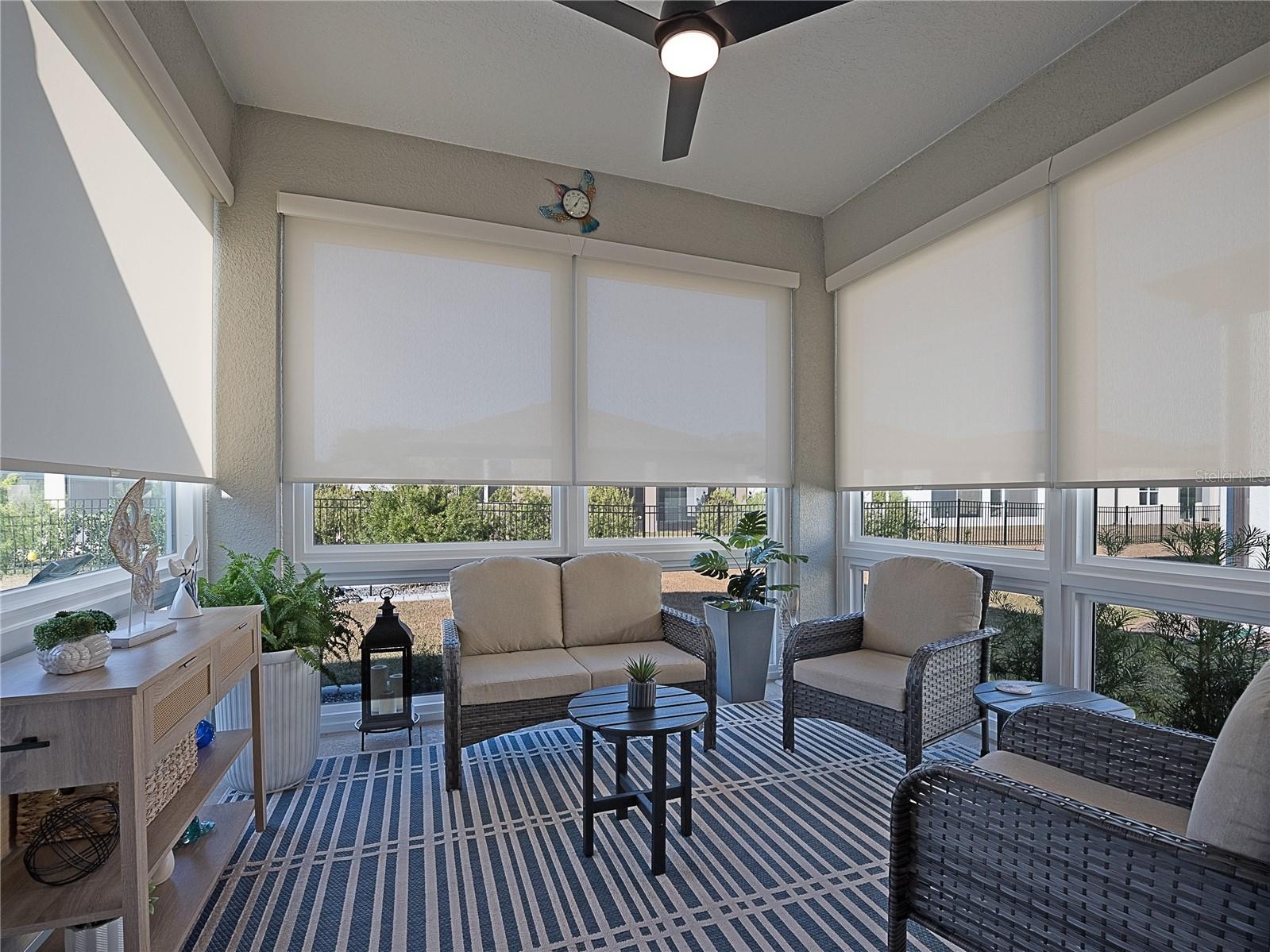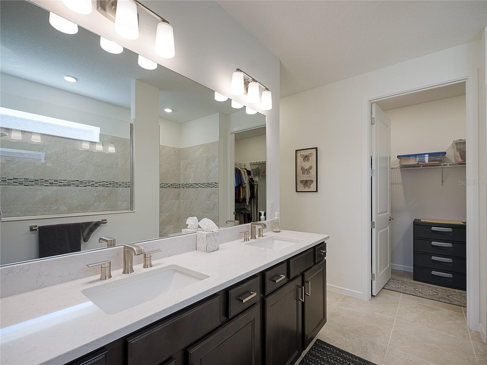 Welcome to this practically new 2024 Prosperity model in the highly sought-after 55+ community of Del Webb Stone Creek. This beautifully upgraded 2-bedroom, 2-bath home with a versatile flex room offers the perfect blend of comfort, style, and low-maintenance living. Step inside to find all-tile flooring throughout, creating a seamless and elegant flow. The light-filled living area features a tray ceiling and plantation shutters, adding an elegant touch. The upgraded gourmet kitchen boasts quartz countertops, enhanced cabinetry with crown molding, and modern finishes that make cooking and entertaining a joy. The primary suite feels like a private retreat with its large zero-entry walk-in shower, beautifully tiled for a spa-like experience. Both bathrooms showcase tastefully tiled showers and contemporary design. Enjoy the convenience of a laundry room complete with cabinetry and a utility sink, offering extra organization and functionality. Natural light pours into the home through the glass-insert front door, enhancing the bright, welcoming ambiance. Relax year-round in the enclosed lanai featuring floor-to-ceiling windows—perfect for morning coffee, evening unwinding, or entertaining guests while enjoying serene views. Living in Del Webb Stone Creek means access to world-class amenities, including: Championship golf course, Resort-style pools and spa, State-of-the-art fitness center, Recreation centers and craft rooms, Pickleball, tennis, and bocce courts, Walking trails and dog parks, A full calendar of clubs, activities, and social events This home offers exceptional value, modern upgrades, and an unmatched lifestyle. Move-in ready and waiting for you—come experience the Del Webb Stone Creek difference!