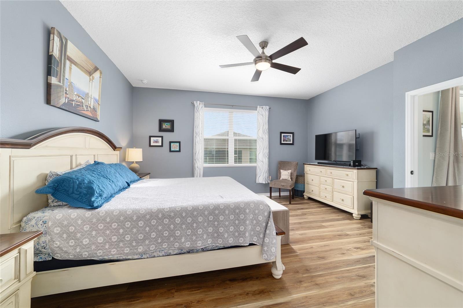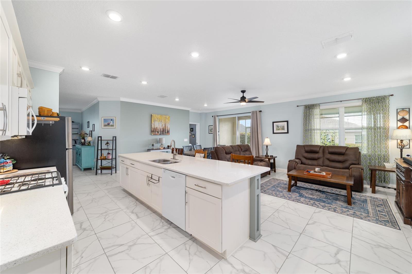 Welcome home to this well-maintained Ginger located in Indigo East at On Top of the World. This home has a space for everything with 2 bedrooms, 2 bathrooms, flex room, and a 2-car garage with an extra golf cart space. The open concept home features a great room with recessed lighting, crown molding, and tile throughout. The kitchen is a true highlight with quartz counters, stylish backsplash, under cabinet lighting, and a large pantry. The staggered white cabinets are upgraded with crown molding, pull out shelving, and rain-glass inserts. The spacious primary bedroom offers a generous layout that comfortably accommodates a king-sized suite and has luxury vinyl plank flooring. The ensuite includes dual vanity sinks and a frameless shower enclosure with an upgraded tile surround. Curb appeal is pristine with upgraded landscape beds and a recently painted exterior. Indigo East has private amenities including 2 swimming pools, fitness center, and a clubhouse and also offers curbside mail delivery and waste collection. On Top of the World is Ocala's premier 55+ golf, resort community with golf cart access to shopping, restaurants, entertainment, health, and beauty.