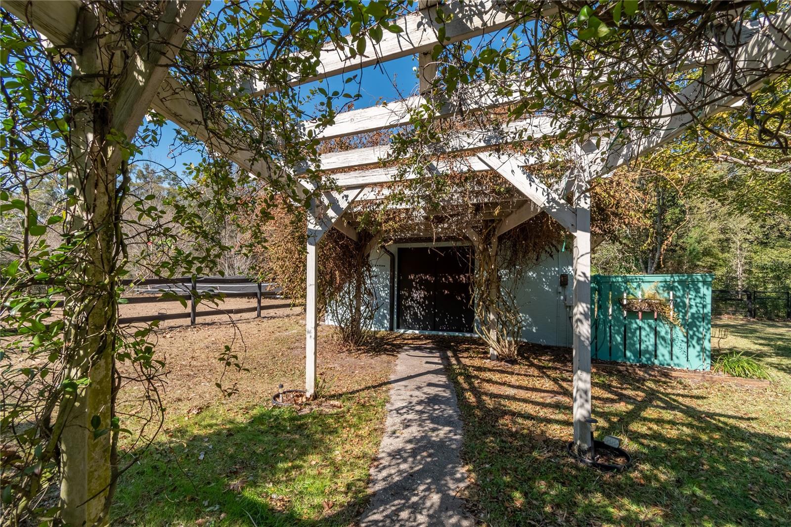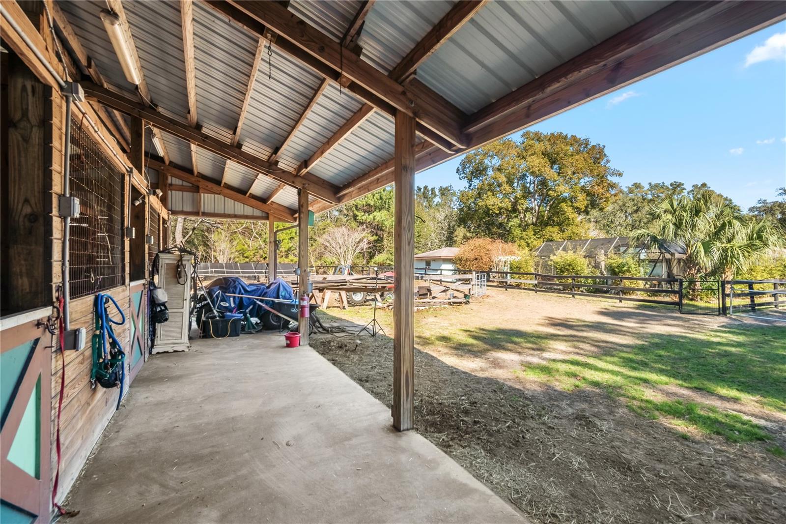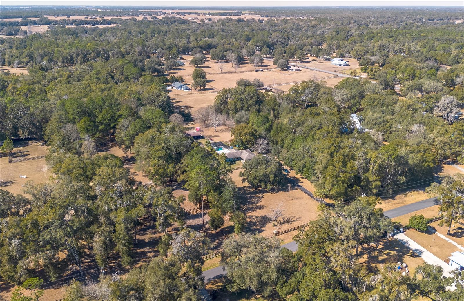 Set on 2.4 acres of gently rolling land within an established equestrian community, this inviting mini-farm offers privacy, functionality, and quiet country living. Fully fenced and gated, the property is framed by mature trees and open paddocks that create a peaceful countryside setting ideal for equestrian use. Centered on the land is a 3-bedroom, 2-bath residence with a welcoming covered entry and attached two-car garage. Inside, the home is light and comfortable with a well-designed split-bedroom layout and inviting living spaces, highlighted by a wood-burning fireplace. The kitchen offers ample cabinetry and counter space and connects easily to the main living area for everyday living and entertaining. A fully enclosed sunroom provides a relaxing space to enjoy natural light year-round. Beyond, a screen-enclosed pool area features a sparkling in-ground pool and above-ground spa, creating a private outdoor retreat. A pergola connects the pool area to a separate workshop and storage building, adding flexibility for hobbies or equipment. Equestrian amenities include a shed-row style barn with four stalls and additional storage, with stall doors opening to turnouts, along with two board-and-wire fenced paddocks offering light shade and clear sightlines. Additional storage is provided by a separate shed and covered carport. Located in a horse-friendly community with no HOA fees and convenient access to Ocala’s equestrian venues, shopping, and services, this property offers a rare opportunity to enjoy space, versatility, and a relaxed equestrian lifestyle with easy access to modern conveniences.