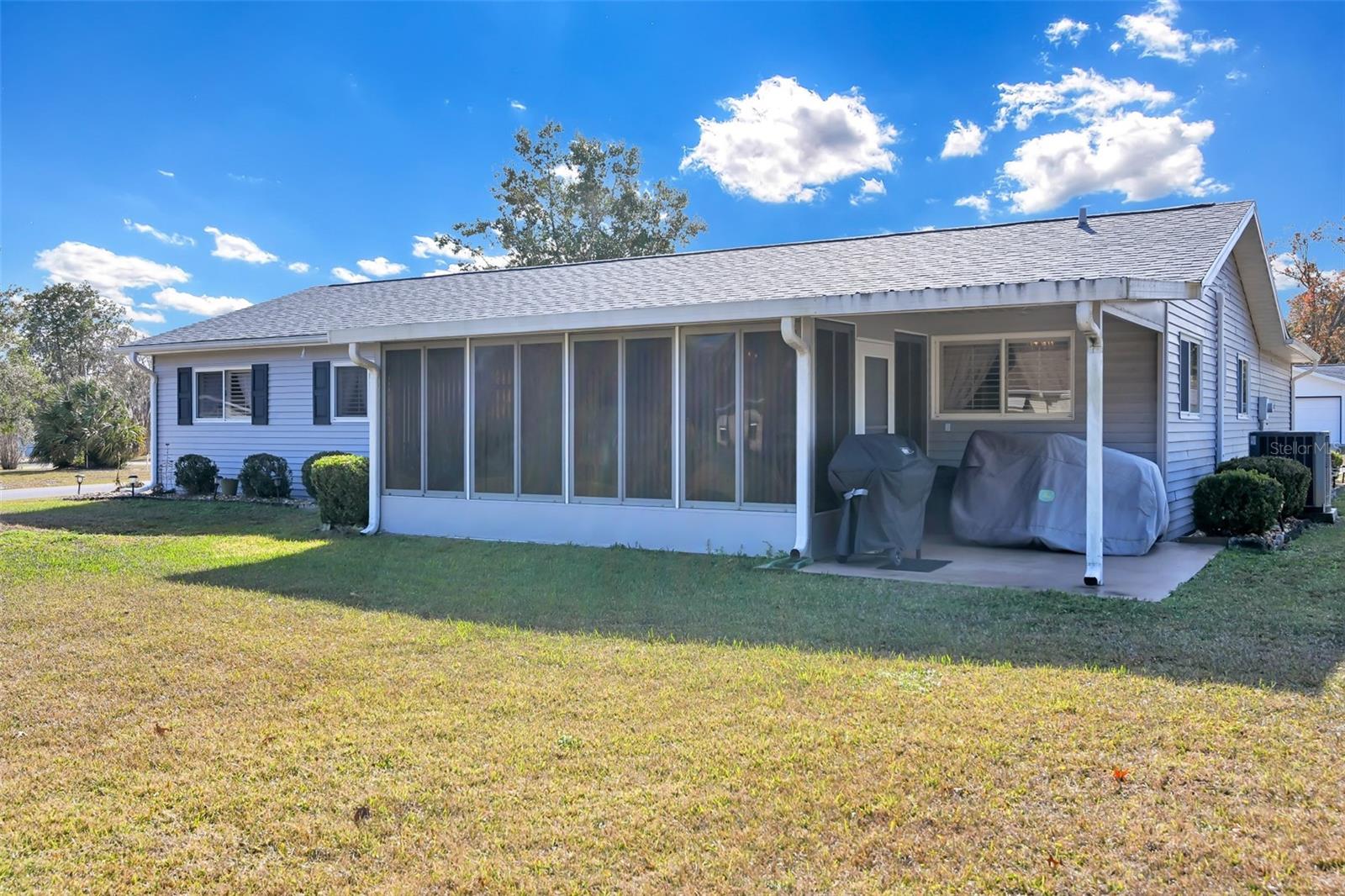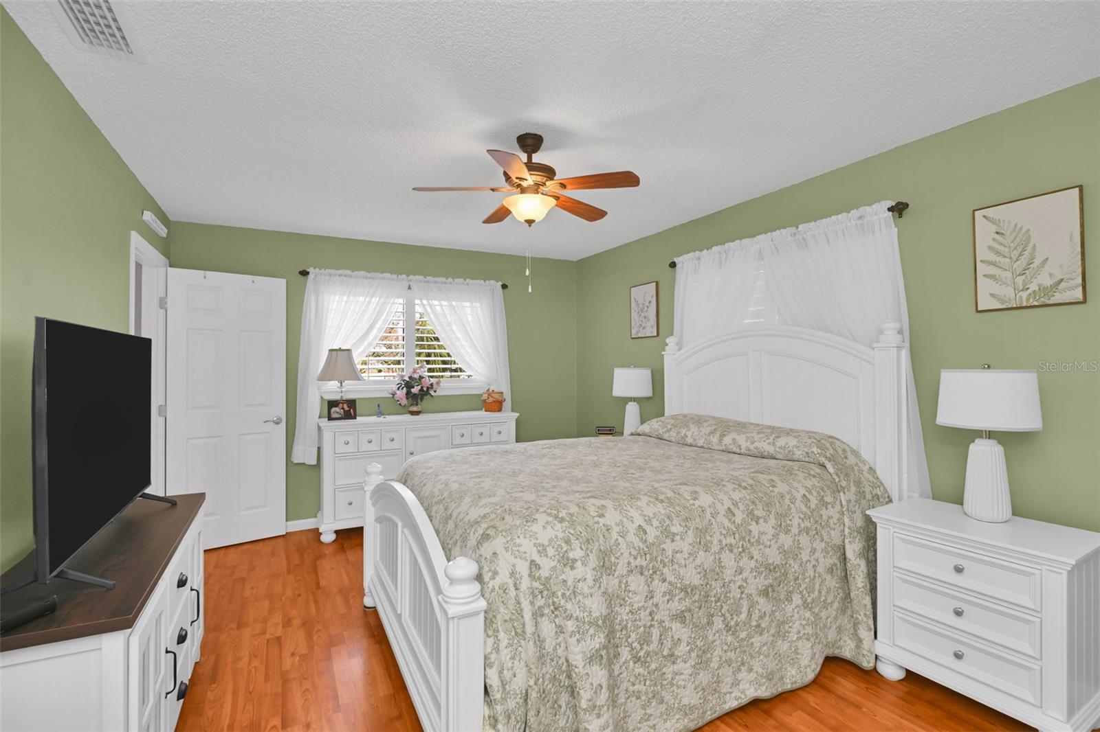 This beautiful home in the 55+ Palm Cay community, featuring a 24-hour guarded gate, is a must-see! Situated on a corner lot, it boasts a spacious lawn and an irrigation system. Key updates include a new roof (2022), air conditioning unit (2019), and 200-AMP electric service (2022). With a generous 1,404 sq. ft. of living space, this home includes 3 bedrooms and 2 bathrooms. The open living room and dining room showcase impressive cathedral ceilings and crown moldings. The 2-car garage, measuring 20' x 20', provides ample workspace and storage, including a freezer (2022). The garage is equipped with a new door opener featuring a belt drive and new garage door screens. In the kitchen, you'll find spotless tile flooring, stainless steel appliances, and a bespoke 4-door French Door Refrigerator with a customized door panel and a beverage center in "Morning Blue Glass," adding a decorative touch. Bright cabinetry complements the new countertops and sink, and the peninsula island opens to a welcoming, casual dining area. Sliding doors lead to the lanai, which features tile flooring, vinyl windows with new screens, and all-new quality blinds. The lanai opens to a covered back patio and a spacious lawn. The master bedroom includes a large walk-in closet and an ensuite bathroom with a tiled, step-in shower, new glass shower doors, and a comfort-height toilet. The guest bedrooms and bathroom are located on the opposite side of the home for added privacy. The guest bathroom features a tub/shower combo with a tile surround and a comfort-height toilet. The indoor laundry room is equipped with a washer and dryer and includes a spacious closet for utility items and supplies. A third bedroom provides the perfect space for a home office or a craft/sewing room. The affordable management fee covers trash removal, a 24-hour gated security, and access to a clubhouse that hosts planned social events. Community amenities include a library, billiards room, card room, arts and crafts room, a community pool, and a tennis court. The clubhouse has a new roof and tennis court has recently been resurfaced.