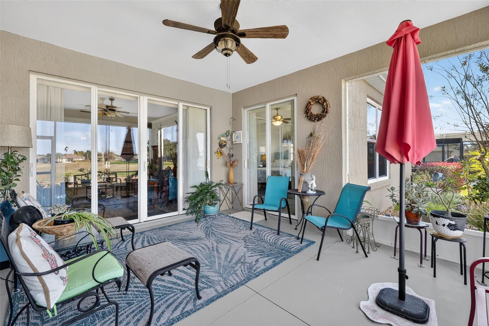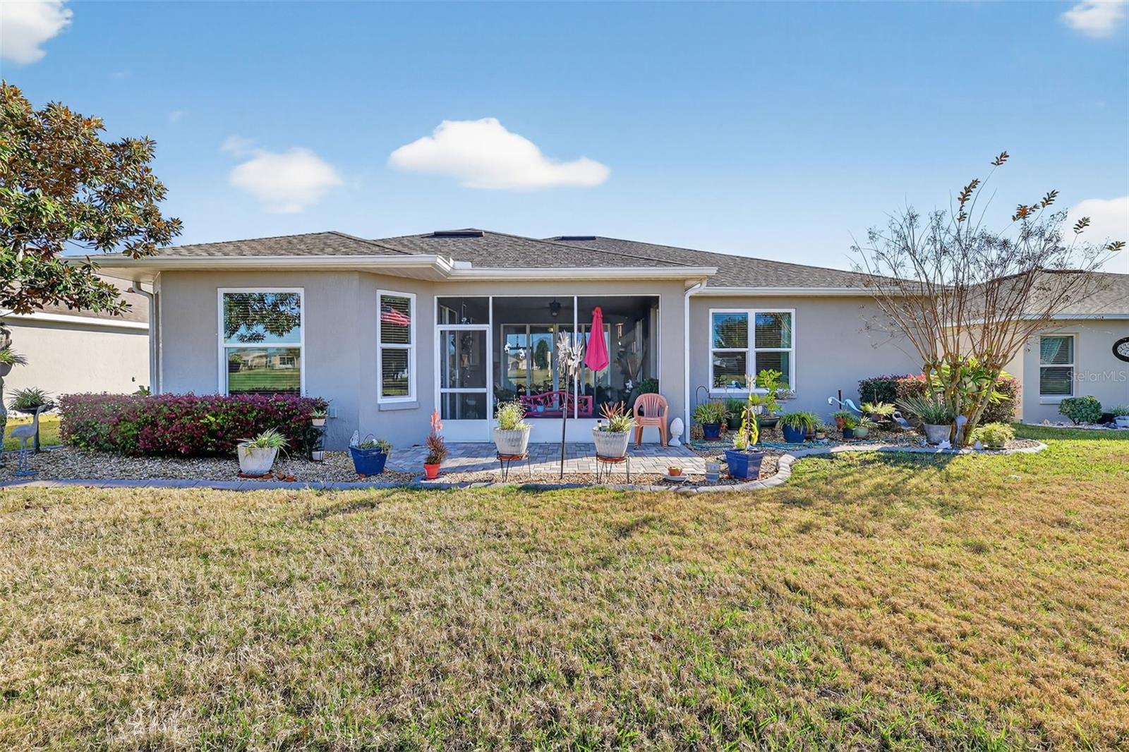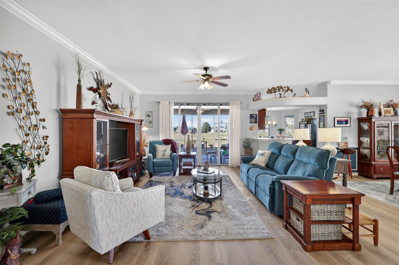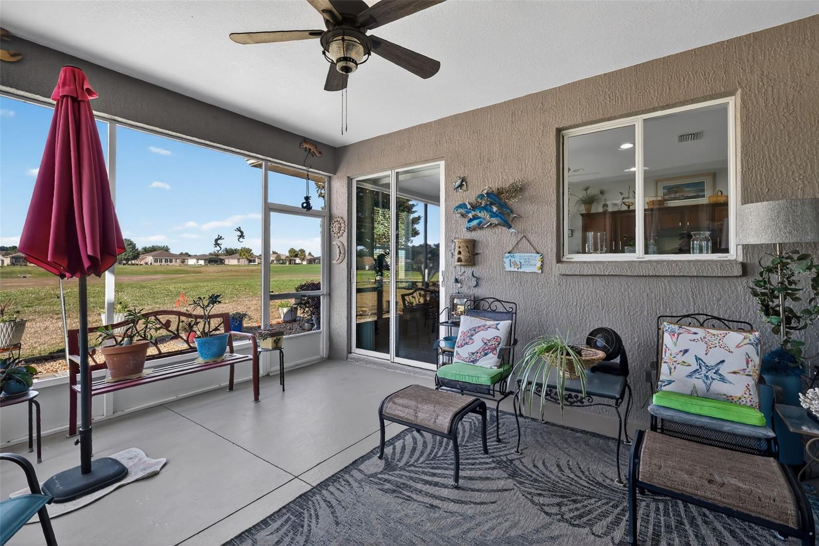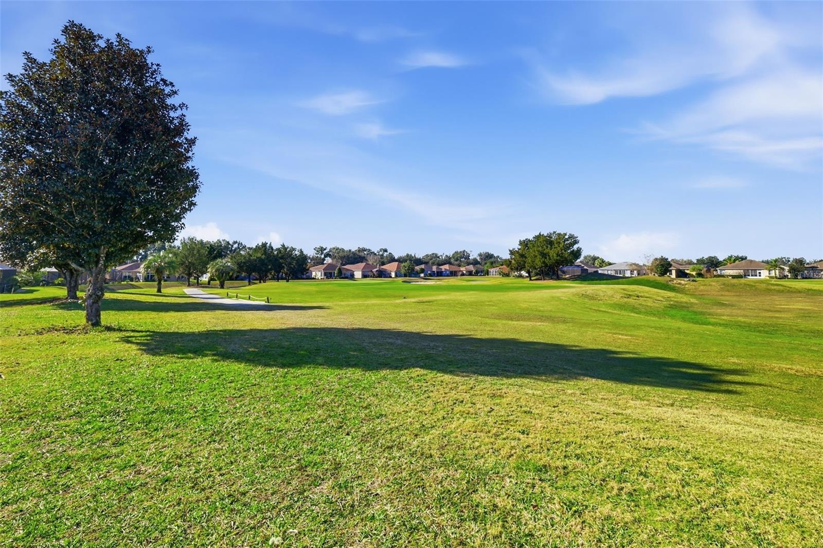 Enjoy breathtaking golf course and sunset views from this beautifully designed Bal Harbour model home featuring 3 bedrooms and 2 bathrooms and an OFFICE. From the moment you enter, the welcoming foyer you will feel the warm open feeling of the home. You will notice the attention to tasteful details to include arched doorways, picture molding and crown molding. The kitchen offers ample counter space, a breakfast bar, a cozy morning room (breakfast nook), and a generously sized pantry. Appliances are approximately 5 years old. Sliders from the kitchen take you to Lanai ( 14.0 X 15.6) to enjoy the scenery. The lanai is also accessible through sliders from the living room and master bedroom. The spacious primary suite is a true retreat, featuring a huge walk-in closet and a luxurious ensuite bath with a separate soaking tub and shower. The master closet is huge for all of your clothing. Additional highlights include: NEW ROOF 2023, solar tube installed in master bathroom, windows replaced in 2021 ( transferable warranty) with the exception of dining room, office and bathroom windows and luxury vinyl plank flooring in living areas. The OVERISIZED GARAGE is 526 square feet and has a remote controlled screen for ease of getting in and out of garage, The HOA provides added value by including mowing and edging of grass as well as high-speed internet, amenities, guard at gate, trash pick up AND a $30 voucher for the on site restaurant. This home combines comfort, quality updates, and unbeatable views—an exceptional opportunity you won’t want to miss. There is also easy access to The Villages and Ocala. NO REAR NEIGHBORS JUST BEAUTIFUL GOLF COURSE!