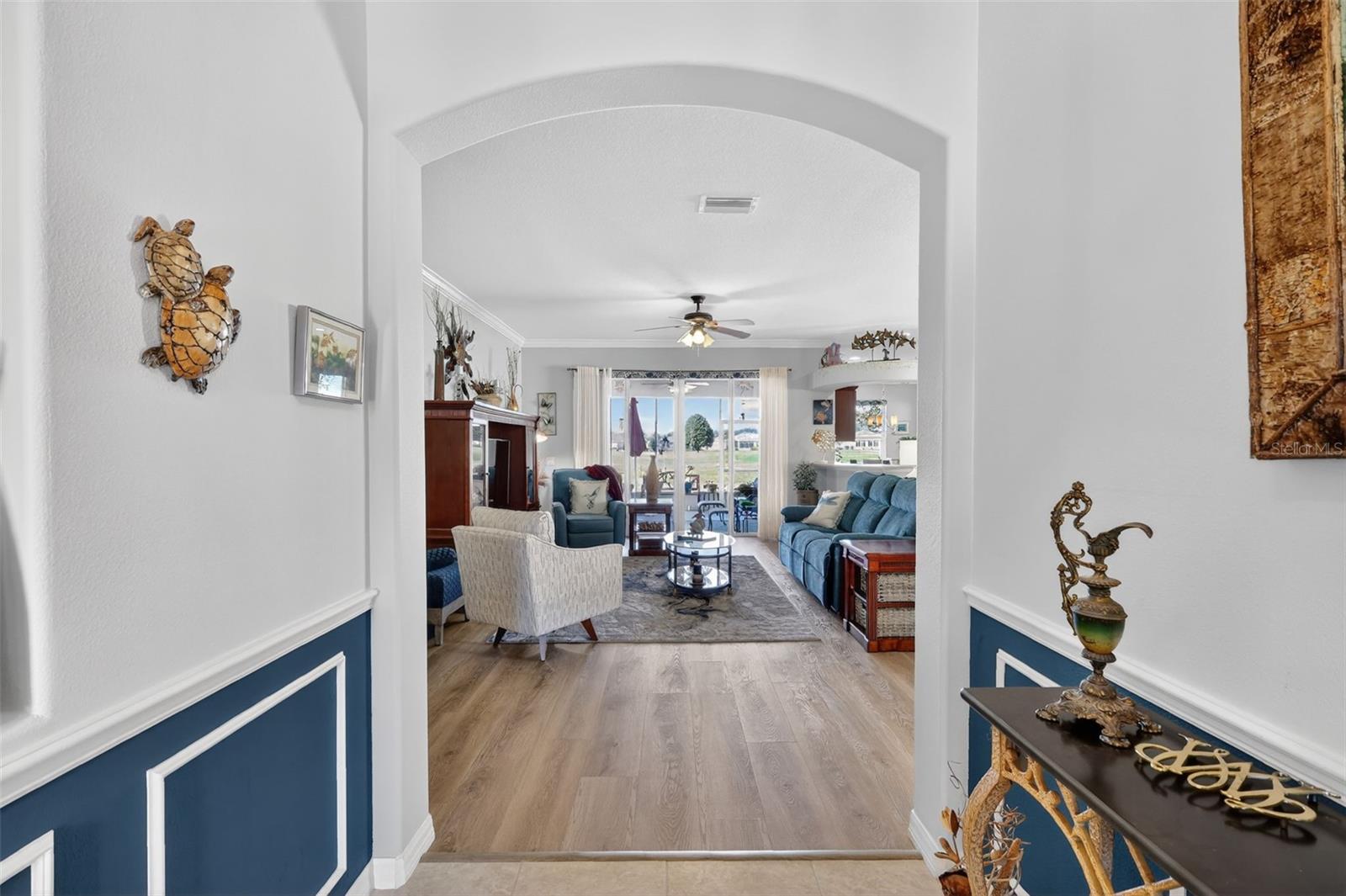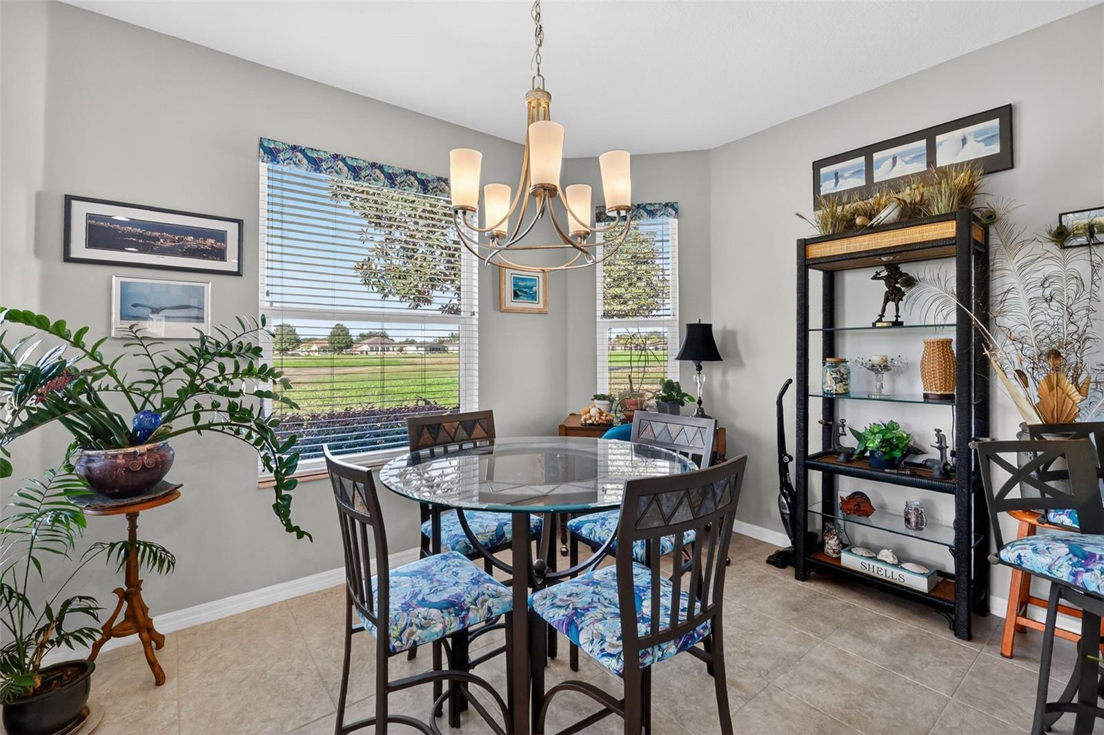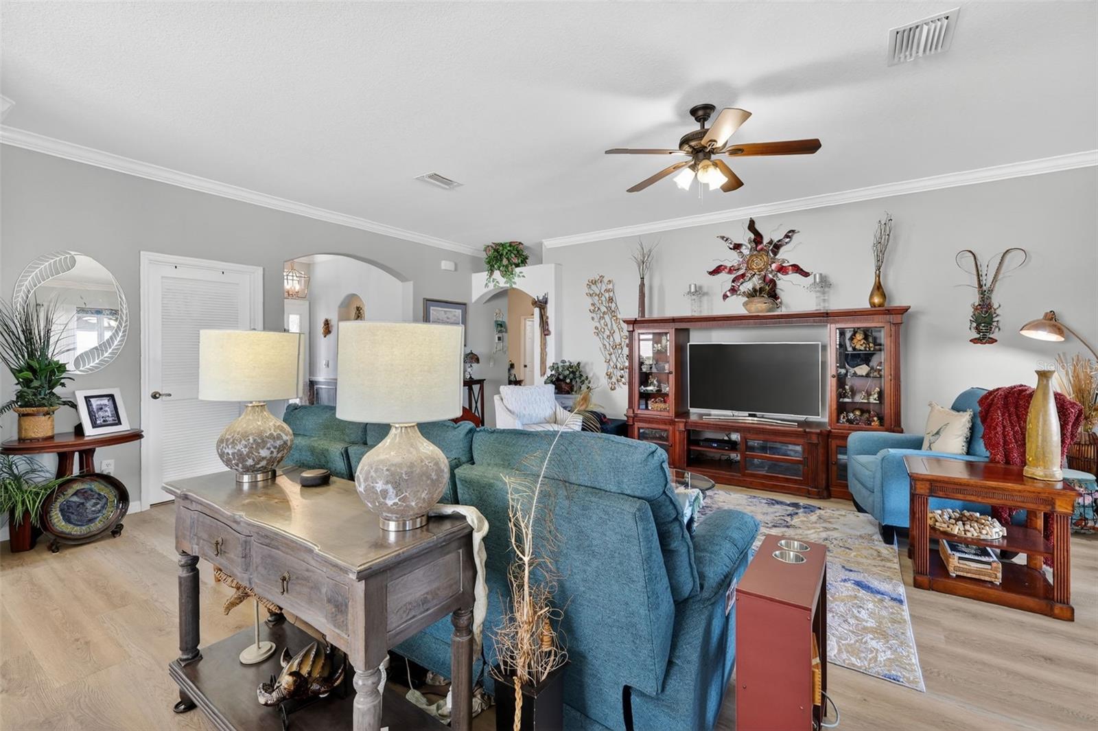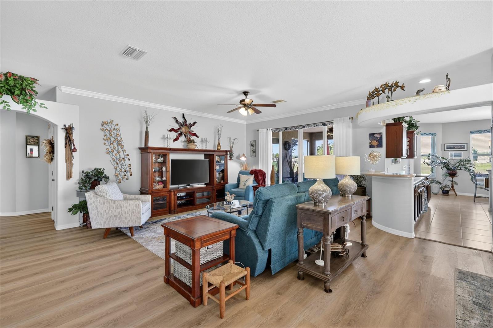 Enjoy breathtaking golf course and sunset views from this beautifully designed Bal Harbour model home featuring 3 bedrooms and 2 bathrooms and an OFFICE. From the moment you enter, the welcoming foyer you will feel the warm open feeling of the home. You will notice the attention to tasteful details to include arched doorways, picture molding and crown molding. The kitchen offers ample counter space, a breakfast bar, a cozy morning room (breakfast nook), and a generously sized pantry. Appliances are approximately 5 years old. Sliders from the kitchen take you to Lanai ( 14.0 X 15.6) to enjoy the scenery. The lanai is also accessible through sliders from the living room and master bedroom. The spacious primary suite is a true retreat, featuring a huge walk-in closet and a luxurious ensuite bath with a separate soaking tub and shower. The master closet is huge for all of your clothing. Additional highlights include: NEW ROOF 2023, solar tube installed in master bathroom, windows replaced in 2021 ( transferable warranty) with the exception of dining room, office and bathroom windows and luxury vinyl plank flooring in living areas. The OVERISIZED GARAGE is 526 square feet and has a remote controlled screen for ease of getting in and out of garage, The HOA provides added value by including mowing and edging of grass as well as high-speed internet, amenities, guard at gate, trash pick up AND a $30 voucher for the on site restaurant. This home combines comfort, quality updates, and unbeatable views—an exceptional opportunity you won’t want to miss. There is also easy access to The Villages and Ocala. NO REAR NEIGHBORS JUST BEAUTIFUL GOLF COURSE!