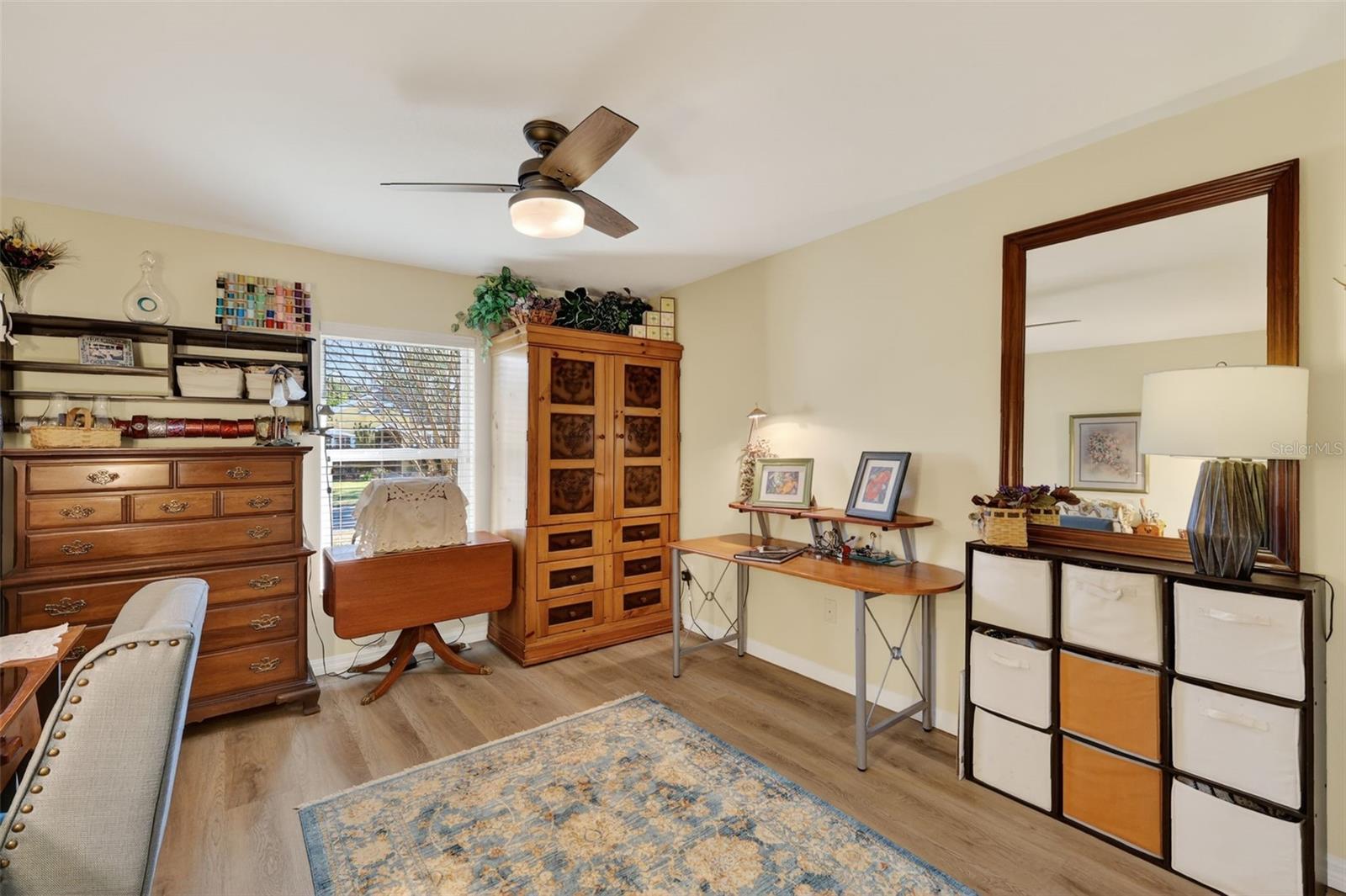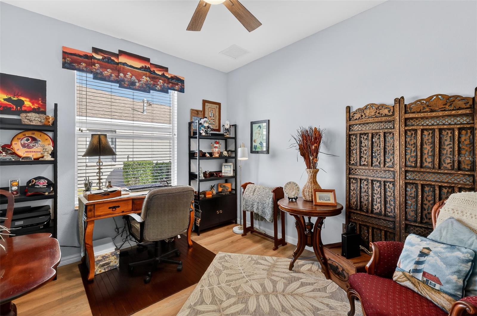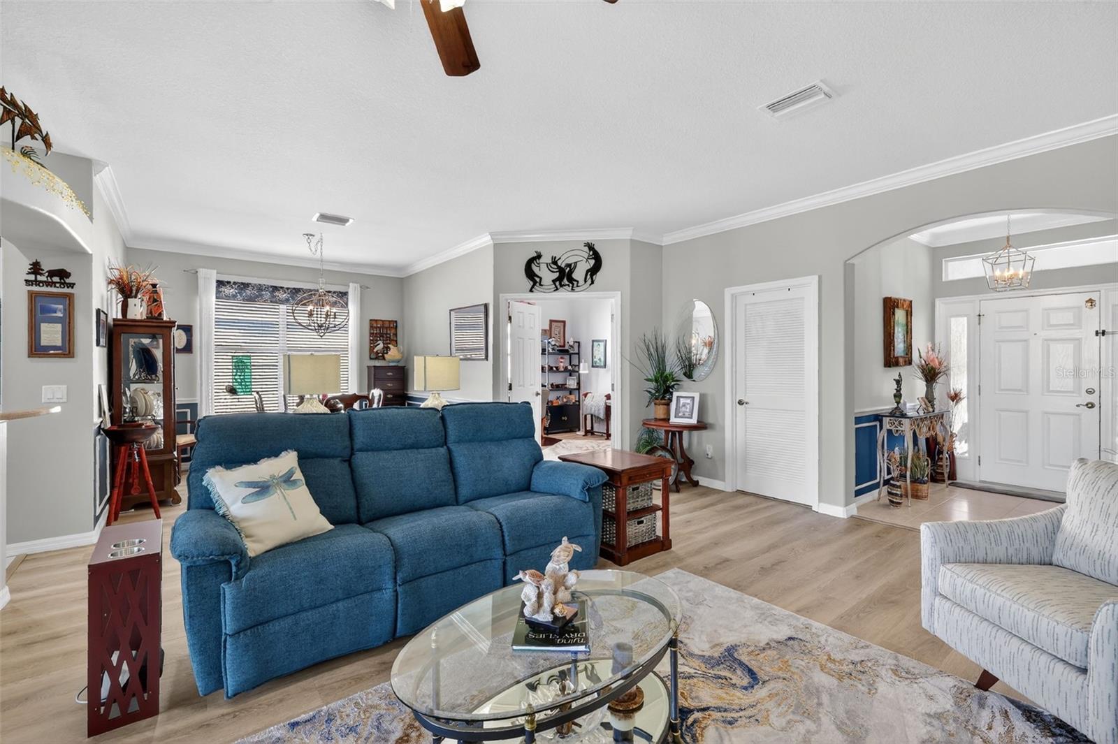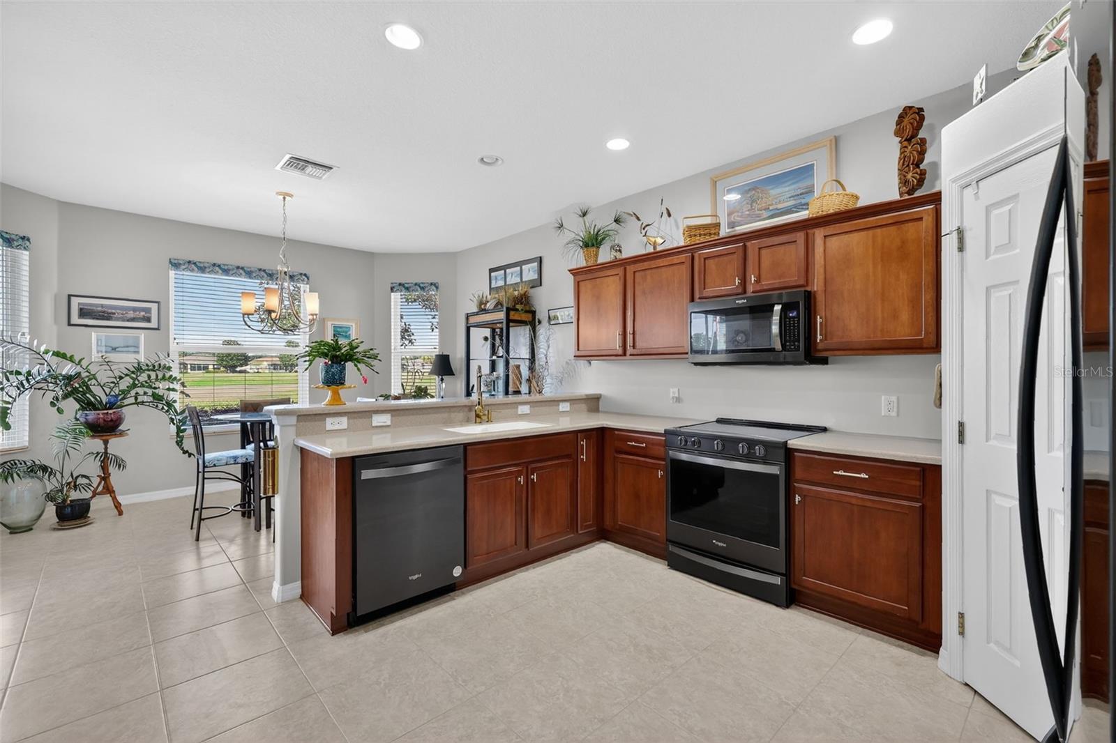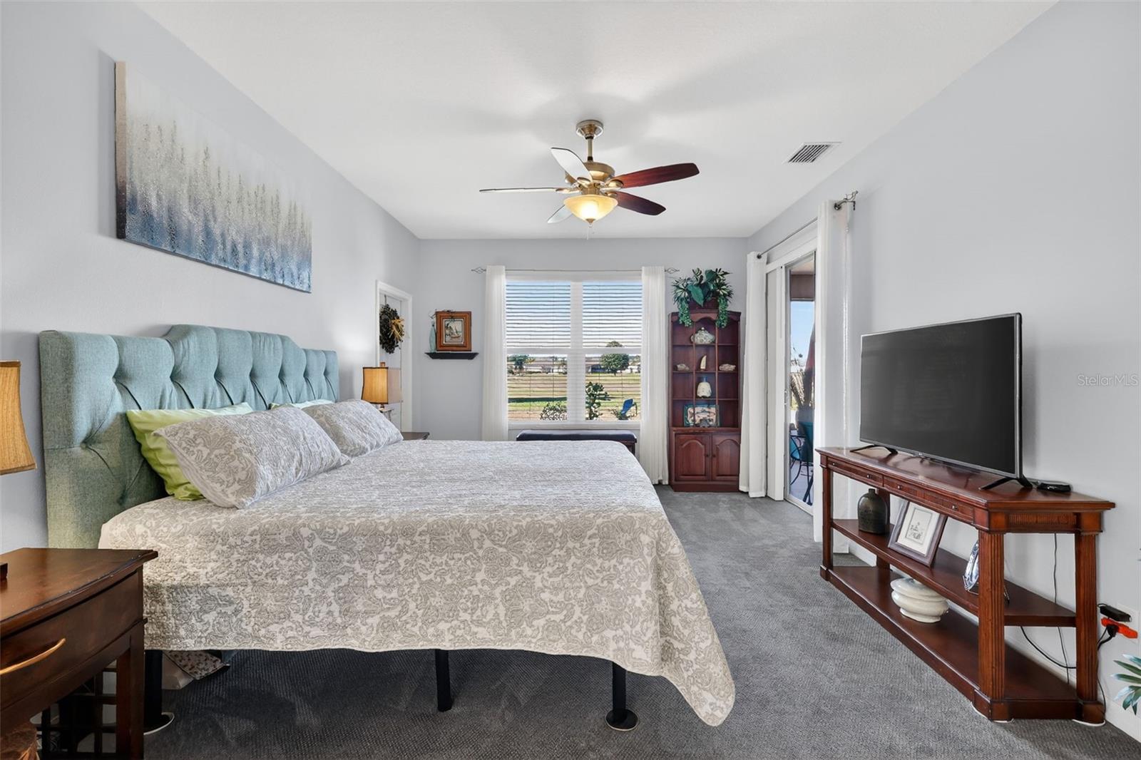 Enjoy breathtaking golf course and sunset views from this beautifully designed Bal Harbour model home featuring 3 bedrooms and 2 bathrooms and an OFFICE. From the moment you enter, the welcoming foyer you will feel the warm open feeling of the home. You will notice the attention to tasteful details to include arched doorways, picture molding and crown molding. The kitchen offers ample counter space, a breakfast bar, a cozy morning room (breakfast nook), and a generously sized pantry. Appliances are approximately 5 years old. Sliders from the kitchen take you to Lanai ( 14.0 X 15.6) to enjoy the scenery. The lanai is also accessible through sliders from the living room and master bedroom. The spacious primary suite is a true retreat, featuring a huge walk-in closet and a luxurious ensuite bath with a separate soaking tub and shower. The master closet is huge for all of your clothing. Additional highlights include: NEW ROOF 2023, solar tube installed in master bathroom, windows replaced in 2021 ( transferable warranty) with the exception of dining room, office and bathroom windows and luxury vinyl plank flooring in living areas. The OVERISIZED GARAGE is 526 square feet and has a remote controlled screen for ease of getting in and out of garage, The HOA provides added value by including mowing and edging of grass as well as high-speed internet, amenities, guard at gate, trash pick up AND a $30 voucher for the on site restaurant. This home combines comfort, quality updates, and unbeatable views—an exceptional opportunity you won’t want to miss. There is also easy access to The Villages and Ocala. NO REAR NEIGHBORS JUST BEAUTIFUL GOLF COURSE!
