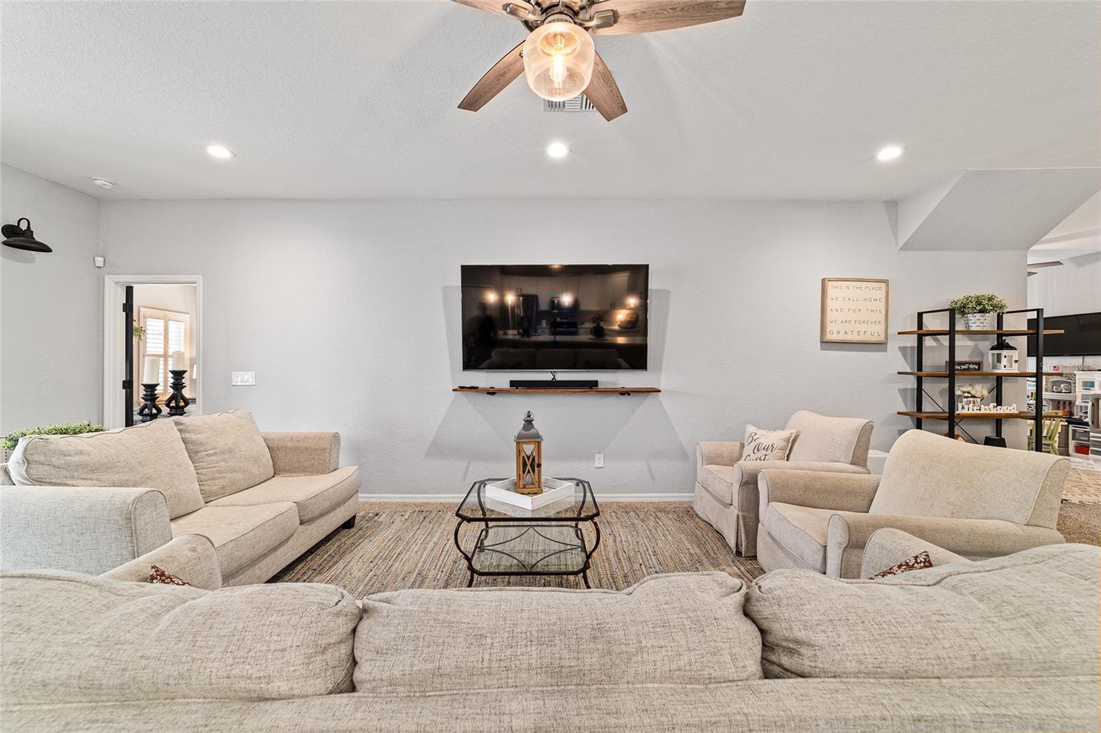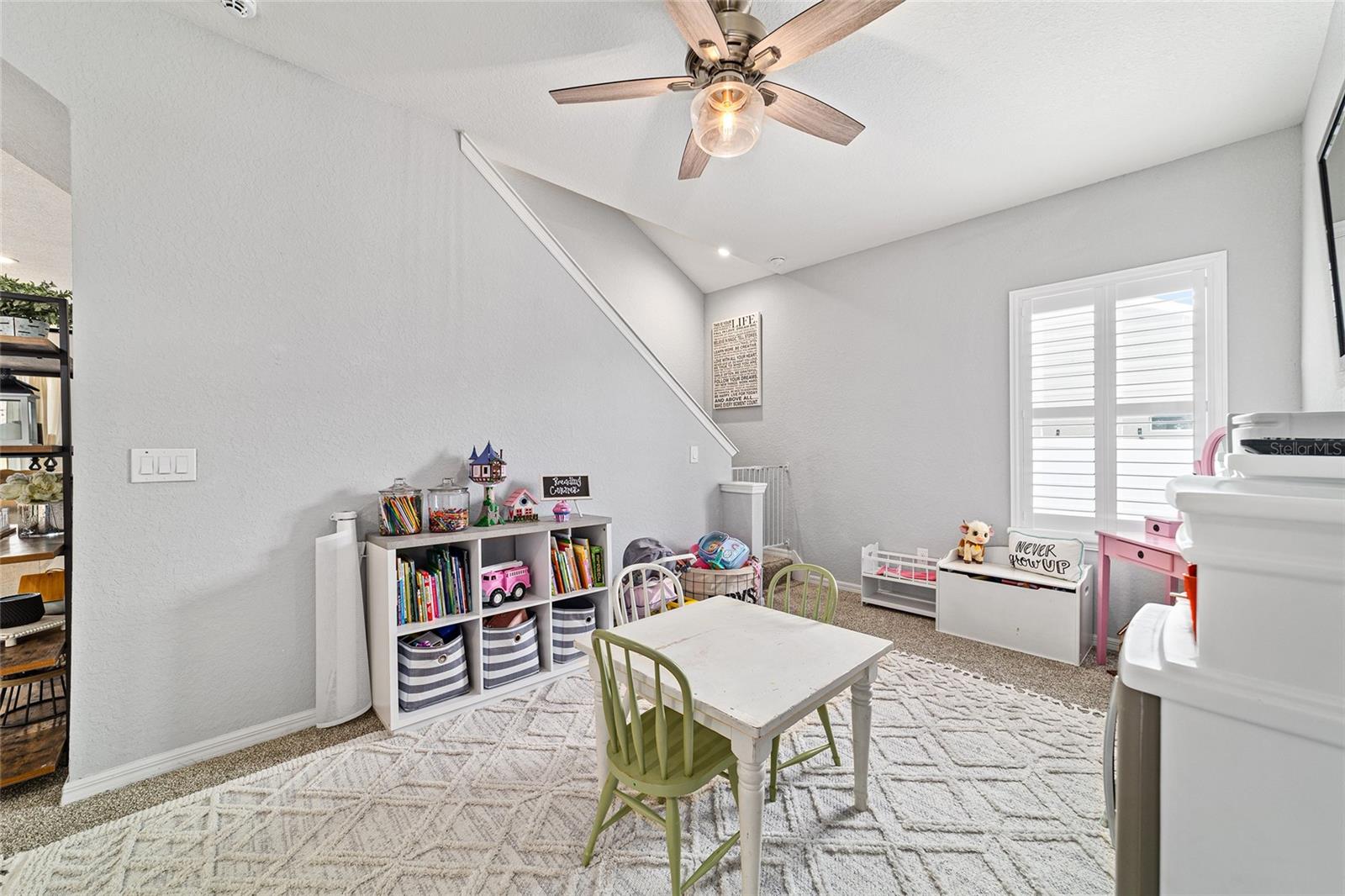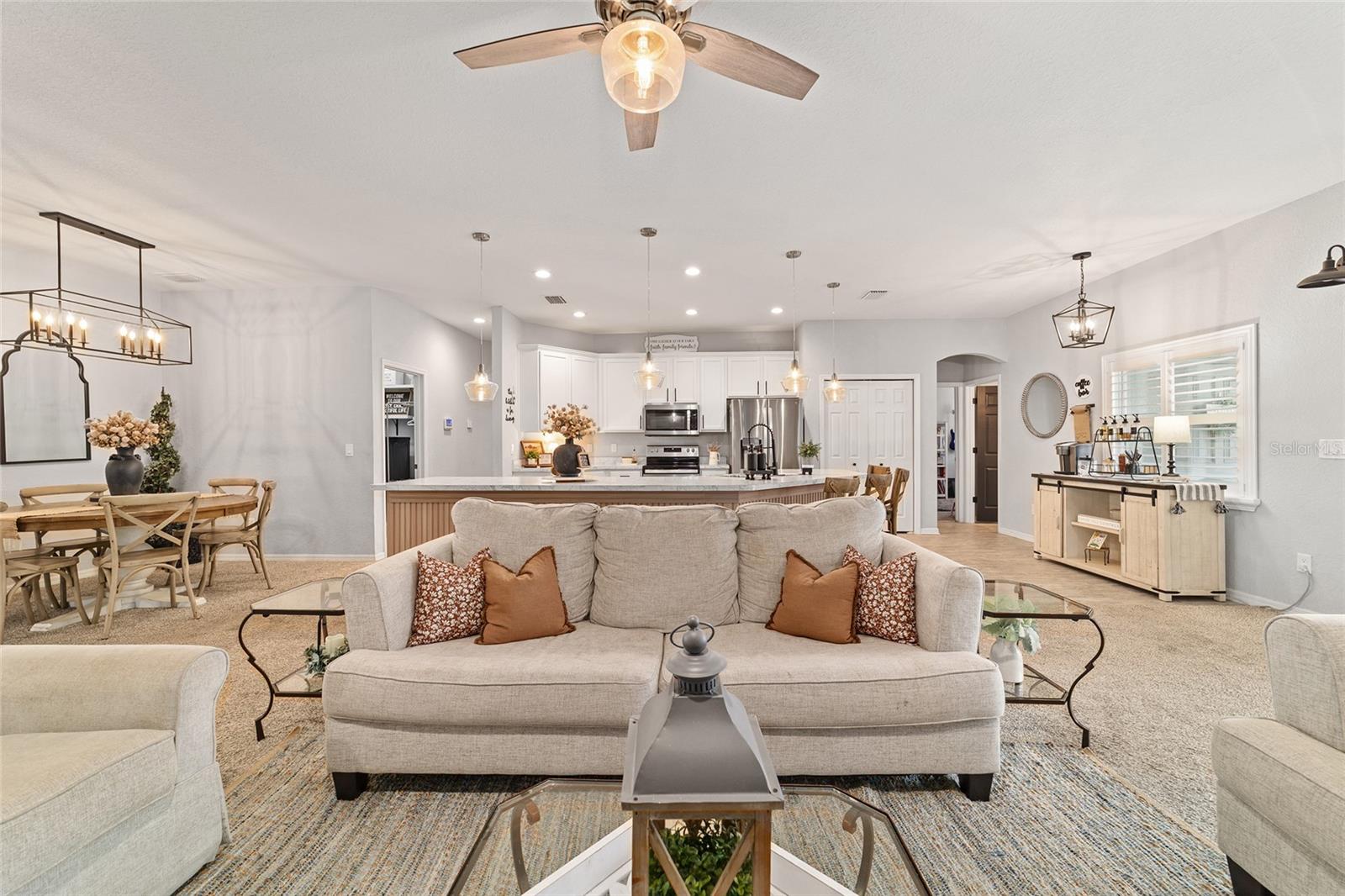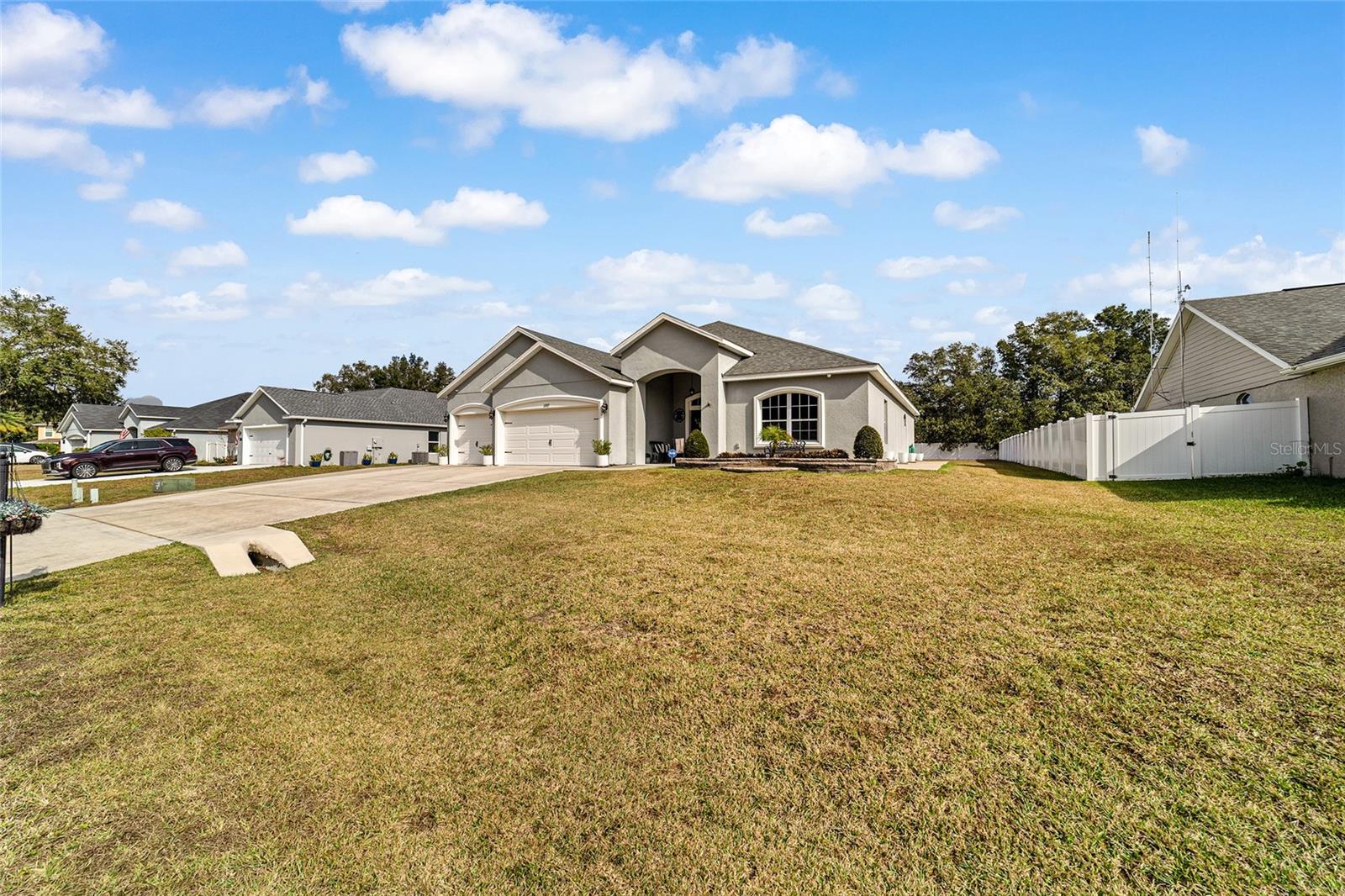 This beautifully maintained 5-bedroom, 3-bath, 3-car garage Willow II model built in 2018 offers 2,900 sq ft of living space on a .42-acre lot in Kingsland Country Estates. The home features an open-concept layout with an oversized kitchen island, pendant lighting, stainless steel appliances, white cabinets with soft-close drawers, wood paneling accents, and pantry. The formal dining room is currently used as a playroom, and the living area includes a ceiling fan and TV mount. Plantation shutters throughout. The primary suite offers a tray ceiling, TV mount, and an en-suite with laminate flooring. The primary bath has a double sink, a soaker tub, tiled shower with glass door, linen closet, and a walk-in closet with shelving. Additional bedrooms include ceiling fans, carpet, closets, and plantation shutters. Bath 2 features a tiled tub/shower combo, while the 3rd bath has a walk-in tiled shower and single-sink vanity. Upstairs, the loft includes carpeted stairs, sliding barn door, recessed lighting, shelving, TV mount, window, and the water heater. The laundry room has laminate flooring and Samsung washer and dryer. The 3-car garage offers epoxy floors, upper and lower cabinetry with a sink, and water softener. Outdoor features include French entry doors, a covered rear porch with fan and lighting, extended paver patio, screen door, sliding doors with curtains, and concrete walkways on both sides, with fencing on the right side. The home also includes two AC units, ceiling fans, carpet in dry areas, and a camera security system. Don't miss the chance to be make this spacious house your next home!