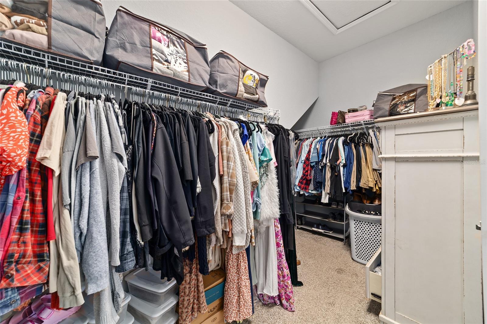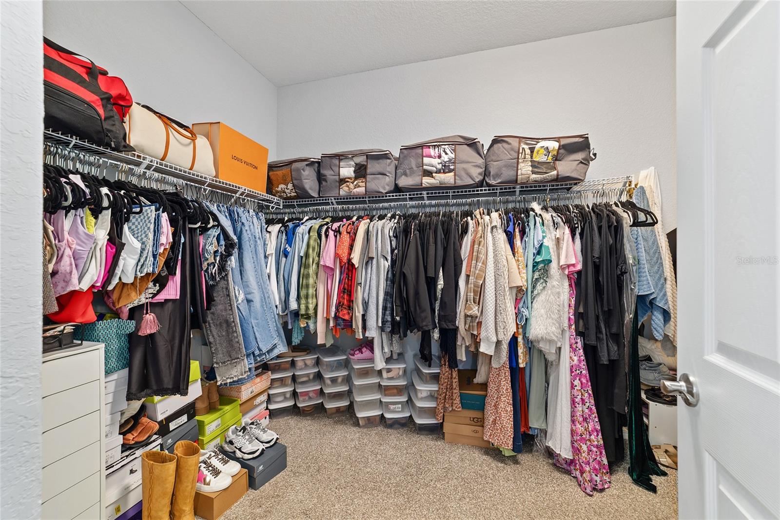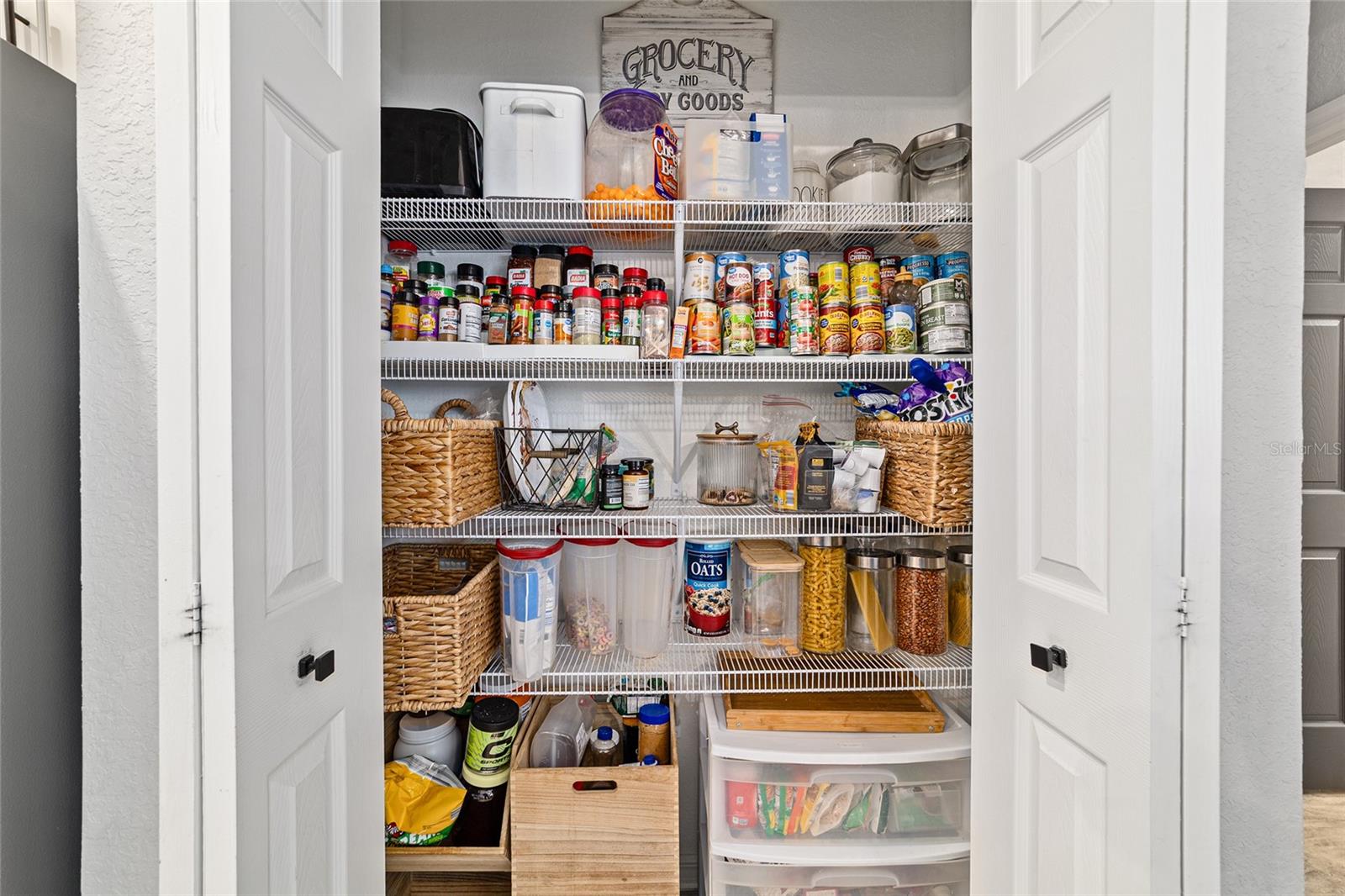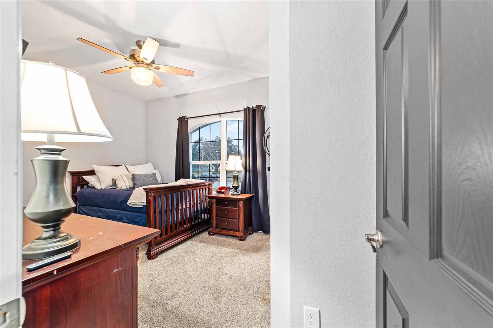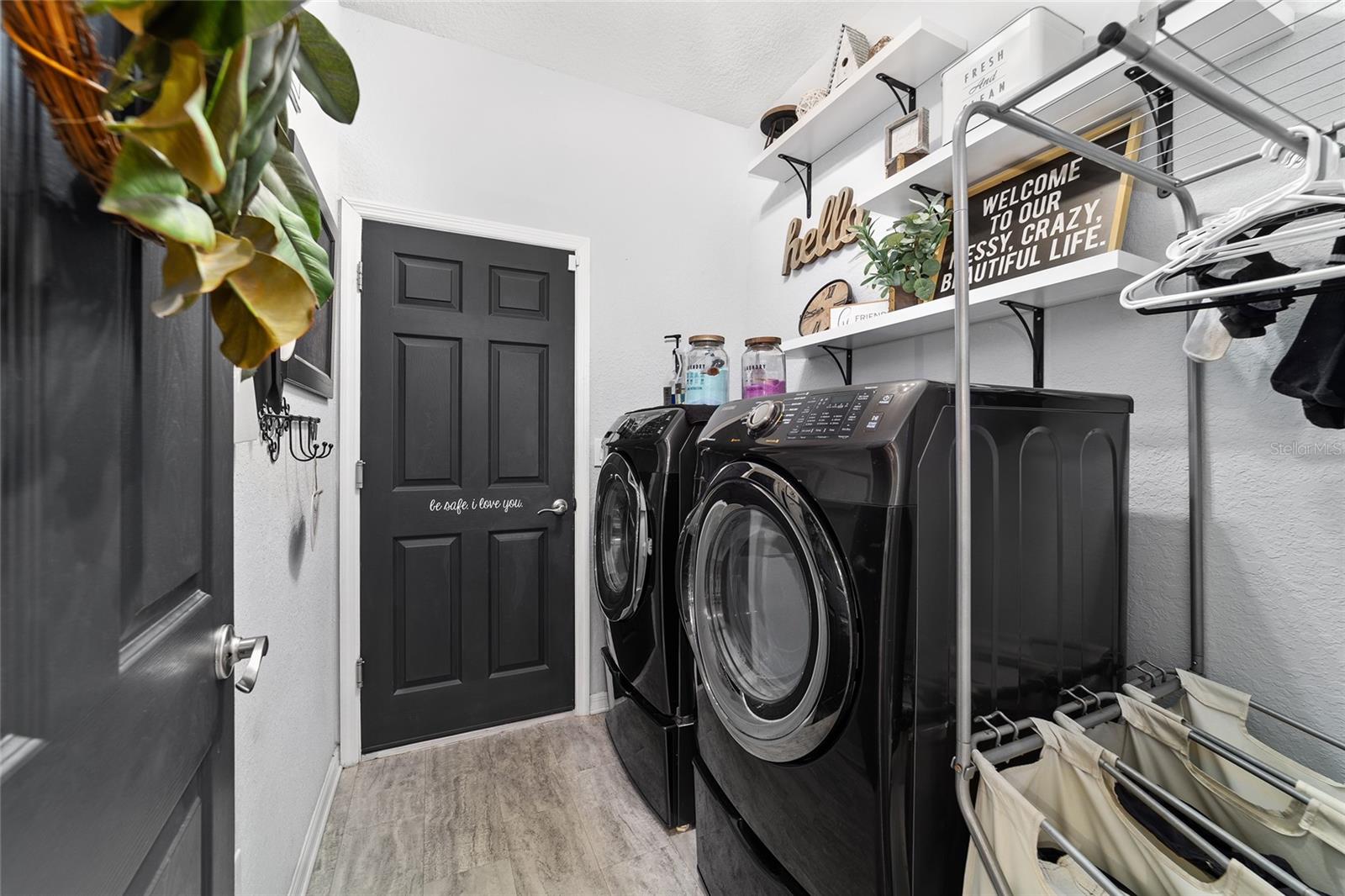 This beautifully maintained 5-bedroom, 3-bath, 3-car garage Willow II model built in 2018 offers 2,900 sq ft of living space on a .42-acre lot in Kingsland Country Estates. The home features an open-concept layout with an oversized kitchen island, pendant lighting, stainless steel appliances, white cabinets with soft-close drawers, wood paneling accents, and pantry. The formal dining room is currently used as a playroom, and the living area includes a ceiling fan and TV mount. Plantation shutters throughout. The primary suite offers a tray ceiling, TV mount, and an en-suite with laminate flooring. The primary bath has a double sink, a soaker tub, tiled shower with glass door, linen closet, and a walk-in closet with shelving. Additional bedrooms include ceiling fans, carpet, closets, and plantation shutters. Bath 2 features a tiled tub/shower combo, while the 3rd bath has a walk-in tiled shower and single-sink vanity. Upstairs, the loft includes carpeted stairs, sliding barn door, recessed lighting, shelving, TV mount, window, and the water heater. The laundry room has laminate flooring and Samsung washer and dryer. The 3-car garage offers epoxy floors, upper and lower cabinetry with a sink, and water softener. Outdoor features include French entry doors, a covered rear porch with fan and lighting, extended paver patio, screen door, sliding doors with curtains, and concrete walkways on both sides, with fencing on the right side. The home also includes two AC units, ceiling fans, carpet in dry areas, and a camera security system. Don't miss the chance to be make this spacious house your next home!