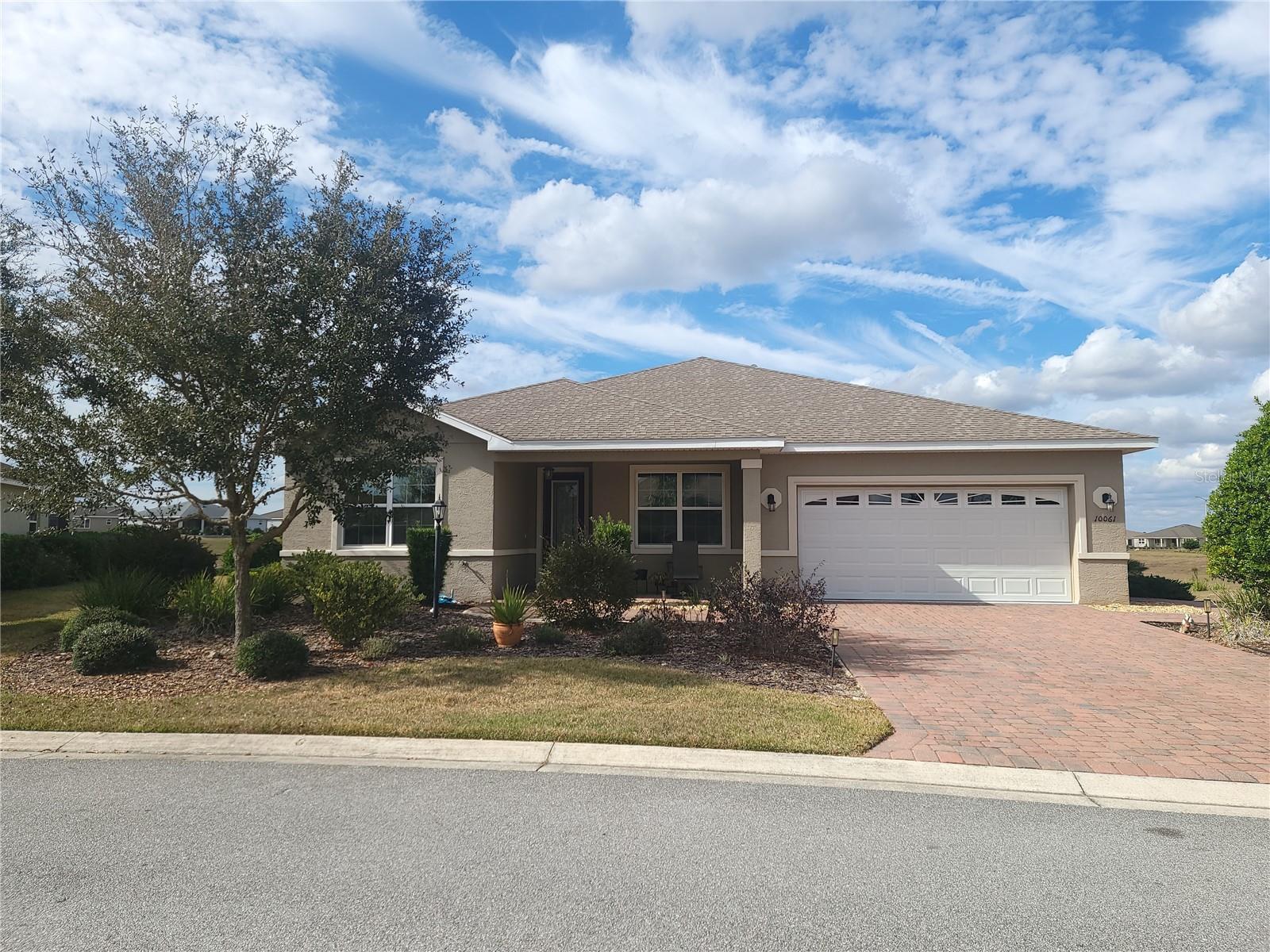 No need to wait for a new build in On Top of the World; you can get your new lifestyle started today! This beautiful Ariana model is available and is move-in ready. Built in 2019, this well-kept and perfectly maintained home has 2 bedrooms, 2 baths, boasts open concept living, has a flex/den/bonus room, and an expanded garage with 3 extra windows that provide extra lighting for your workshop. As you pull up to the home, the first thing you notice is the upgraded driveway with pavers, which extends along the sidewalk and also complements the front porch. You will dream of having your morning coffee and relaxing evenings on this inviting porch. Entering the home, you will feel welcomed as you enter the spacious foyer. The guest bedroom is on your left, and the flex room/den with French doors is on your right. Next, you will notice the spacious, modern gourmet kitchen, a chef's dream, and perfect for entertaining. The kitchen boasts upgraded staggered cabinets, beautiful countertops, and pendant lighting. The kitchen includes a refrigerator, gas range, wall oven, microwave, and dishwasher. Pull up a chair and sit at the large island while overlooking the great room. The high ceilings, tile flooring, and gas fireplace add to the brightness and provide a very welcoming atmosphere. The primary bedroom is located in the back of the home, for privacy, with a sizeable en-suite which includes a large step-in shower and double vanities. The walk-in closet provides plenty of room, while the laundry room, which can be entered two ways for convenience, has a sink and custom cabinetry providing additional storage space. Out back, you can sit in your screened-in lanai and watch the beautiful Florida sunsets. The monthly HOA fee includes Basic Internet, roof repair, exterior painting every seven years, and exterior maintenance. Also included is landscaping, trash and recycling, and gated entry. Some of the amenities in this lively community include several Swimming pools, fitness centers, tennis, pickleball, softball, archery, bocce ball, shuffleboard, horseshoes, a remote control plane flying field, a library, and to name a few. Come take a look at this immaculate and modern home in this amazing golf cart community, and you will know that you have found the place that you want to call home!