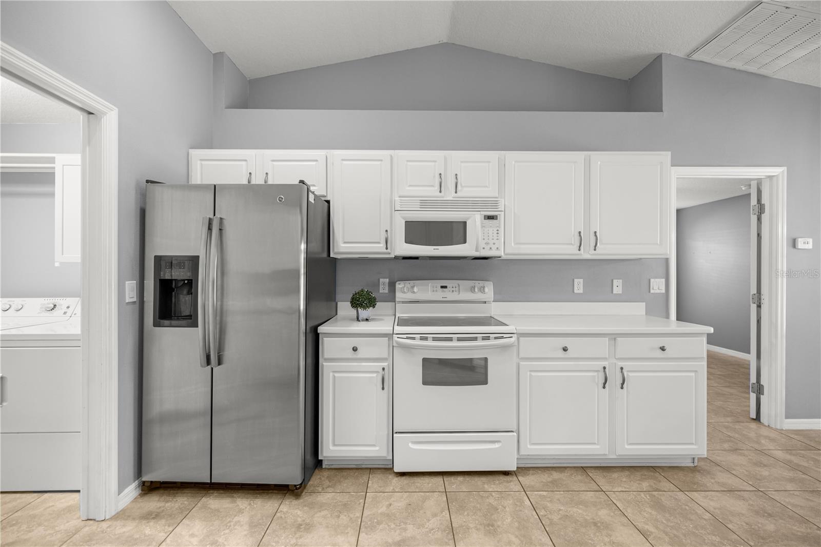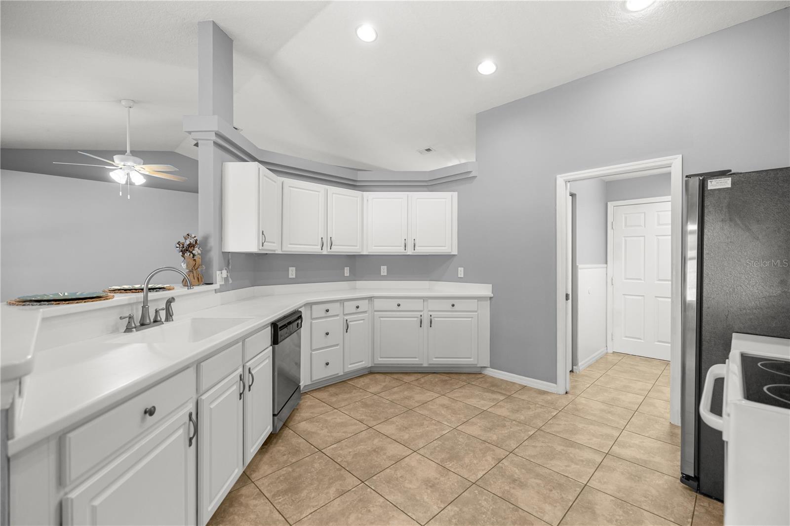 This thoughtfully designed three bedroom, two bath home with a split bedroom floorplan is located in The Fountains, a quiet Northwest neighborhood in an ideal location. It offers neutral decor and easy-care tile floors throughout. Its volume ceilings lend to its spacious feel. The large kitchen has plenty of cabinets, solid surface counters, an eat-at bar and adjoining dining area. An inside laundry off the kitchen has a pantry and leads to the attached garage. The primary bedroom provides a private retreat, large enough to accommodate a king sized bed, with an en suite bath and walk-in closet. Enjoy Ocala's mild weather with the fenced backyard and covered rear porch, perfect for relaxing or entertaining. This desirable community has extremely low and affordable HOA fees at approximately $338/year, paid annually or semi-annually. For those that commute, this location will provide easy access to major East/West and North/South arteries. It's conveniently located just minutes from shopping, fine dining, banking, medical and dental, I-75 and the World Equestrian Center.