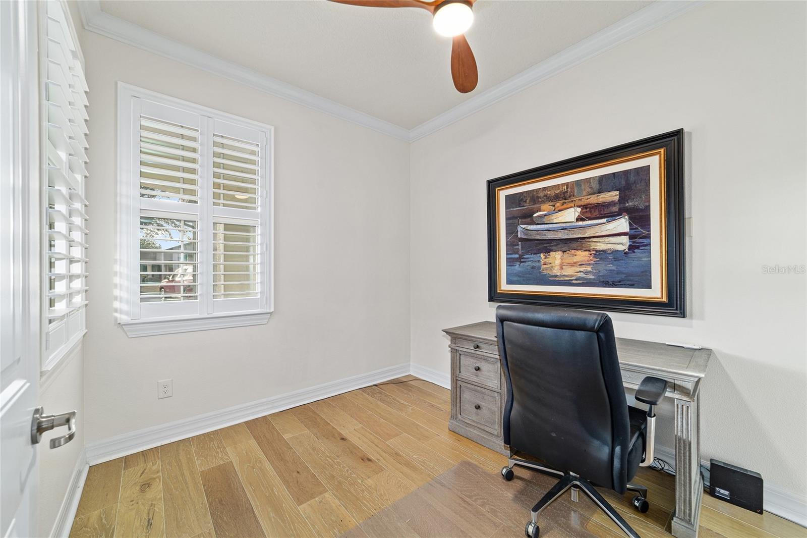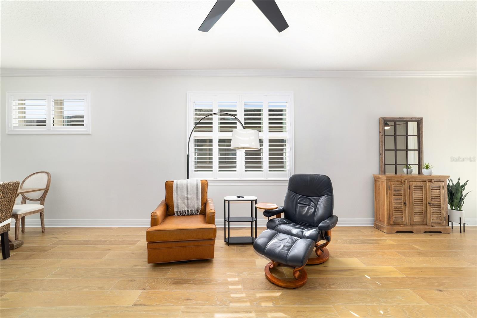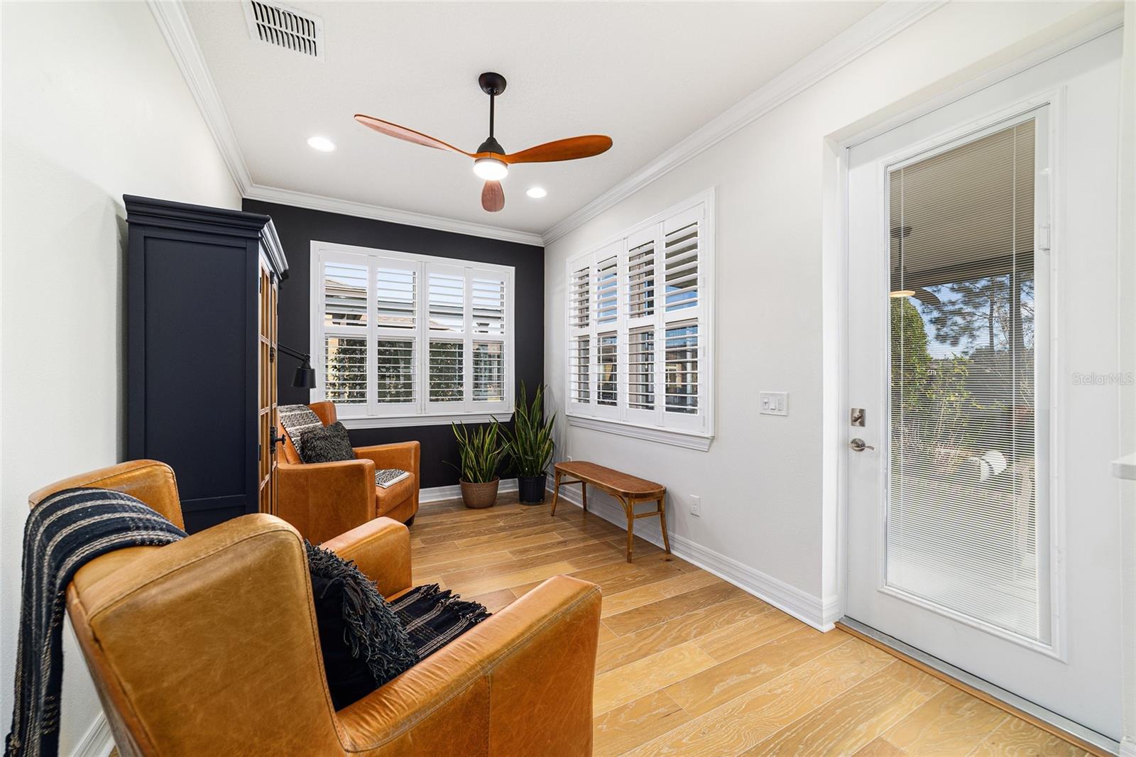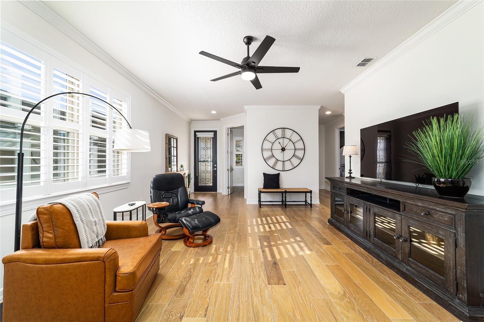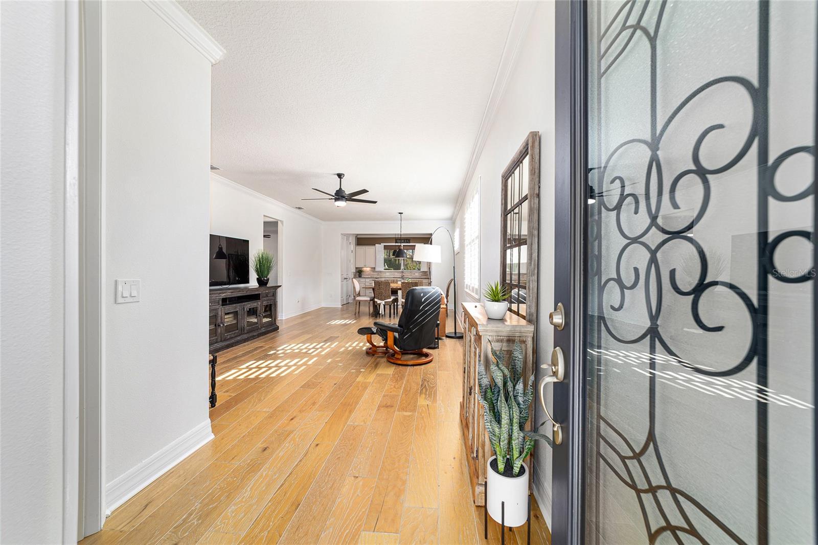 Welcome to this beautifully appointed 2-bedroom, 2-bath home with a versatile flex room and an extended 2-car garage, located in the highly desirable 55+ community of Del Webb Stonecreek. From the moment you arrive, you’ll be impressed by the exceptional curb appeal, storm door, and decorative glass front entry. Inside, an open-concept floor plan seamlessly connects the living, dining, and kitchen areas, creating an inviting space for both everyday living and entertaining. The kitchen features stainless steel appliances, granite countertops, brushed nickel fixtures, real wood cabinetry with under-cabinet lighting, a polished marble backsplash, and custom plantation shutters that overlook the extended screened-in patio. A sunroom extends off the kitchen and leads to the expansive 28-foot partially roofed, screened birdcage patio, offering privacy and views of the landscaped backyard. The spacious owner’s suite boasts of elegant tray ceilings, a large walk-in closet, and a luxurious en-suite bath with granite countertops, dual sinks, and a large walk-in shower with dual shower heads. The guest bedroom is thoughtfully set apart in its own private area near a full guest bath with a tiled shower and granite counters. Additional highlights include: New A/C unit 2023, crown molding, plantation style shutters, a new stove, 8-foot interior doors, 5¼-inch base moldings, recent interior paint, rounded drywall corners, upgraded light fixtures and ceiling fans, and a flex room perfect for an office, hobby space, or den. The extended garage features an epoxy-coated floor, storage shelving, sliding garage screen, remote free entry, and is pre-wired for a generator. The home also includes a house water softener and irrigation system. HOA benefits include: irrigation water, repair and maintenance as well as lawn and shrub maintenance. Del Webb Stonecreek offers an unmatched lifestyle with a state-of-the-art fitness center, spa, heated resort style pool, basketball, golf, pickleball, softball, tennis, scenic walking and biking paths, multiple clubhouses, and an on-site café and grill. This exceptional home offers so many upgrades and combines comfort, style with resort-style living—schedule your private showing today!