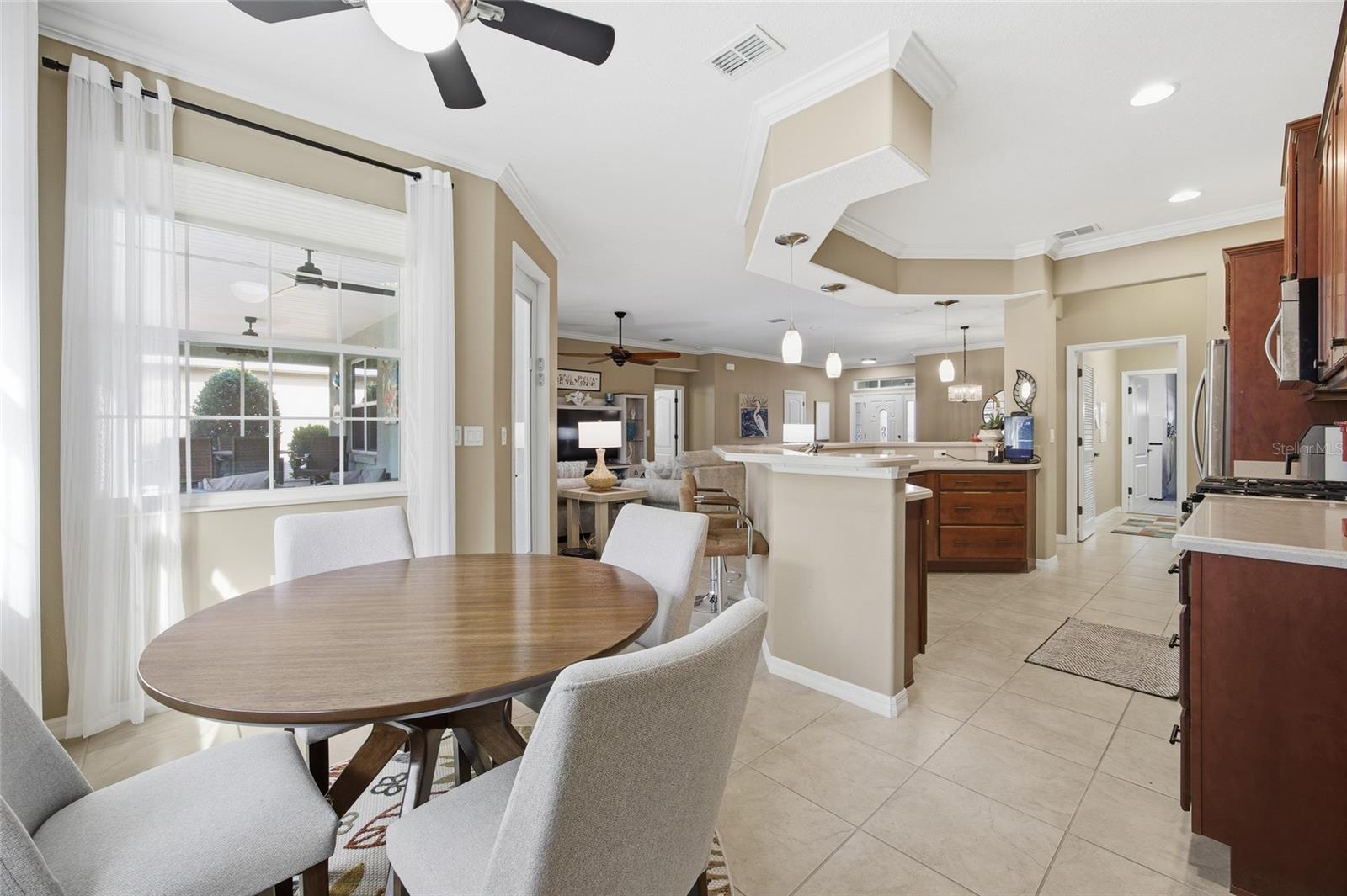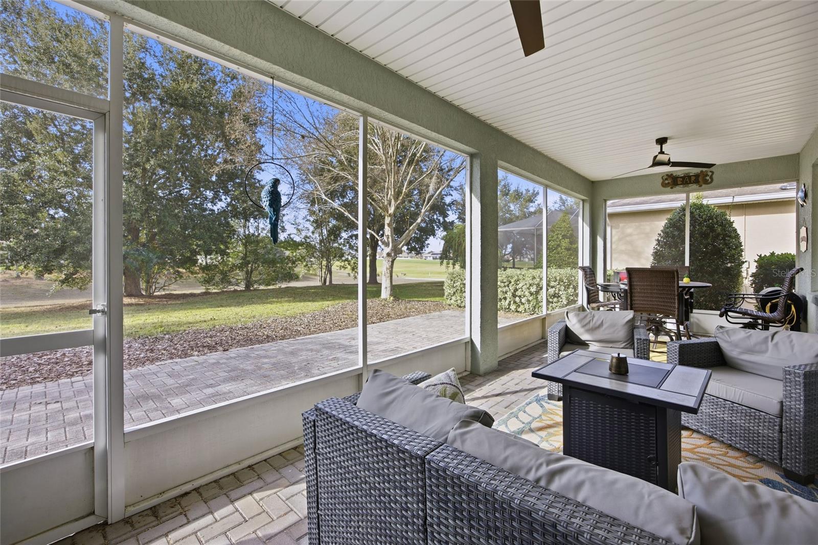 One or more photo(s) has been virtually staged. Beautiful, fully furnished 2,010 sq ft, 3/2 Lochearn model located in Candler Hills at On Top of the World offers a golf course view. Ideal for active adults and snowbirds seeking a Turnkey home with low maintenance. This Move-in Ready home includes furniture, decor, dishes, linens, and an electric golf cart. The oversize garage with room for a golf cart features a built-in workshop with Mitsubishi mini-split A/C for year-round comfort. Imagine coffee and cocktails on the lanai while watching golfers and sunsets. From Low E glass windows, master bedroom plantation shutters and tray ceiling, Corian countertops, radiant barrier foil backed roof sheathing, a side utility door in the garage and natural gas, this house is gorgeous. The guard gated 55+ active HOA community features resort style amenities including pools, clubhouses, fitness centers, restaurants, pickleball, tennis, archery, mini golf, dog parks, social clubs and much more. This golf cart community has connectivity to grocery, medical, restaurants and