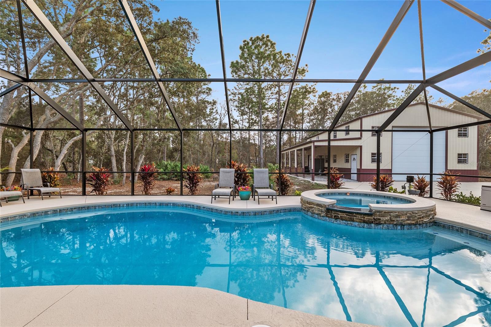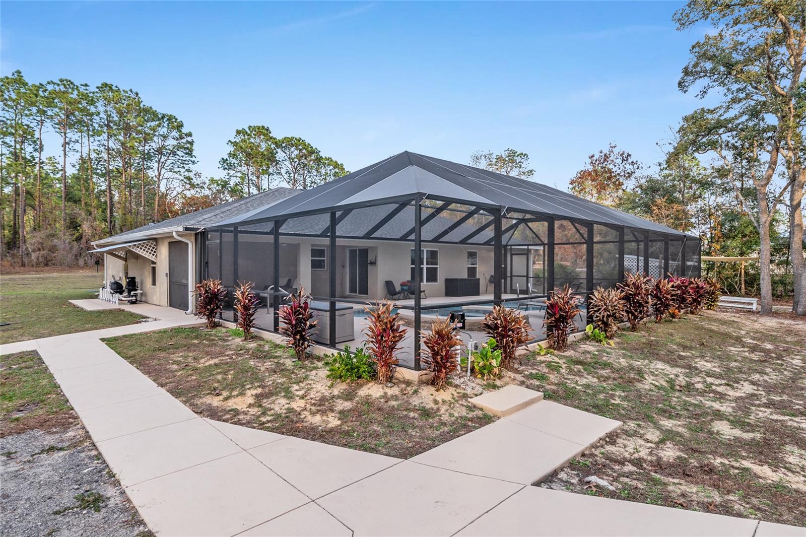 A quiet stretch of farmland leads you to this modern country retreat, completed in 2022 and set on 1.16 acres just minutes from the World Equestrian Center. The location offers a rare balance of privacy and convenience, with newer construction and functional upgrades designed for everyday comfort and serious utility. Inside, the home features three bedrooms plus a generously sized office that easily adapts for work, hobbies, or guest use. The kitchen is finished with espresso shaker cabinetry, while the primary bedroom includes a custom sliding barn door detail. The garage has been upgraded with a True Grit durable epoxy finish and includes a new opener with camera and motion sensing technology. The home has also been prepped for a propane generator. Outdoor living has been thoughtfully designed to maximize enjoyment. A heated pool with color changing LED lighting, sundeck, and built in hot tub create a resort style setting, all enclosed within a large screened pool area. A dedicated grilling space with paver flooring and overhead shade provides an ideal spot for outdoor dining and entertaining. A 500 gallon propane tank services the property, and selective tree removal has opened up ample driveway space. A standout feature is the recently constructed 30×50 detached metal workshop with oversized RV bay, and now equipped with electric service. Designed with flexibility in mind, it includes multiple roll up and walk in doors along with a lean to, offering space for vehicles, trailers, equipment, or recreational storage. This level of functionality is rarely found so close to the World Equestrian Center. The sellers have completed additional improvements, but a change in plans now creates an opportunity for the next owner to enjoy a nearly new home with upgrades already in place. Mature landscaping, fruit trees, and established plantings frame the property, creating a private and peaceful atmosphere. With its blend of modern construction, outdoor living, and versatile outbuildings, this property offers a unique opportunity in a highly desirable area.
