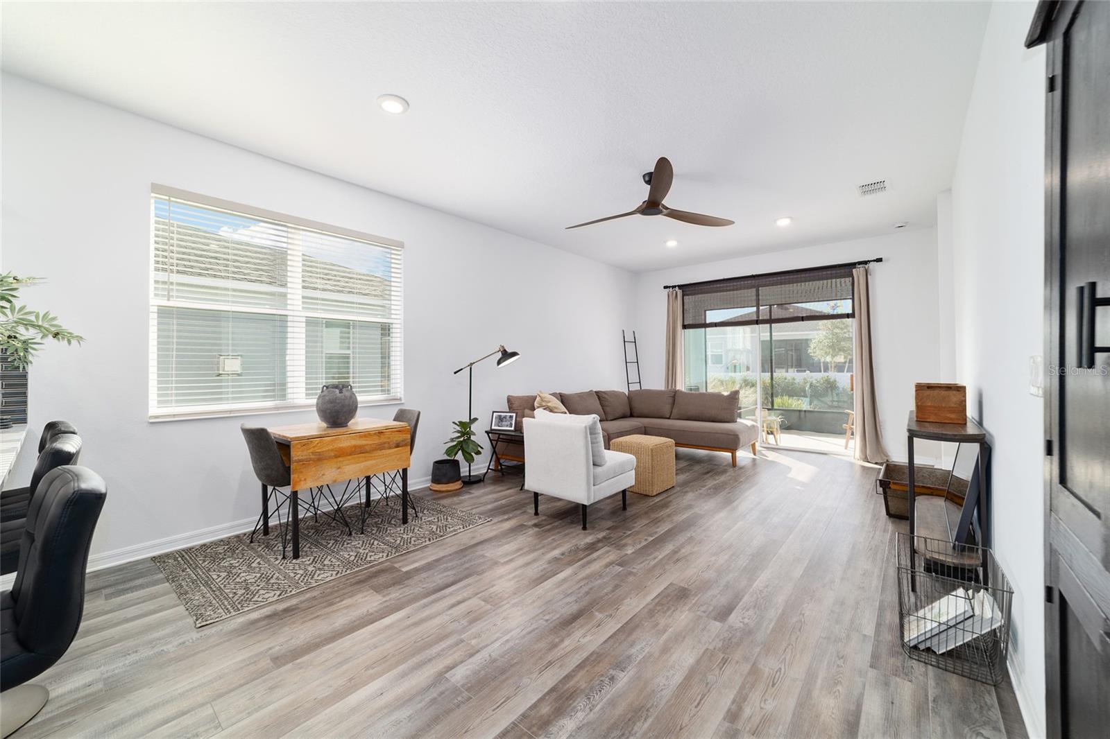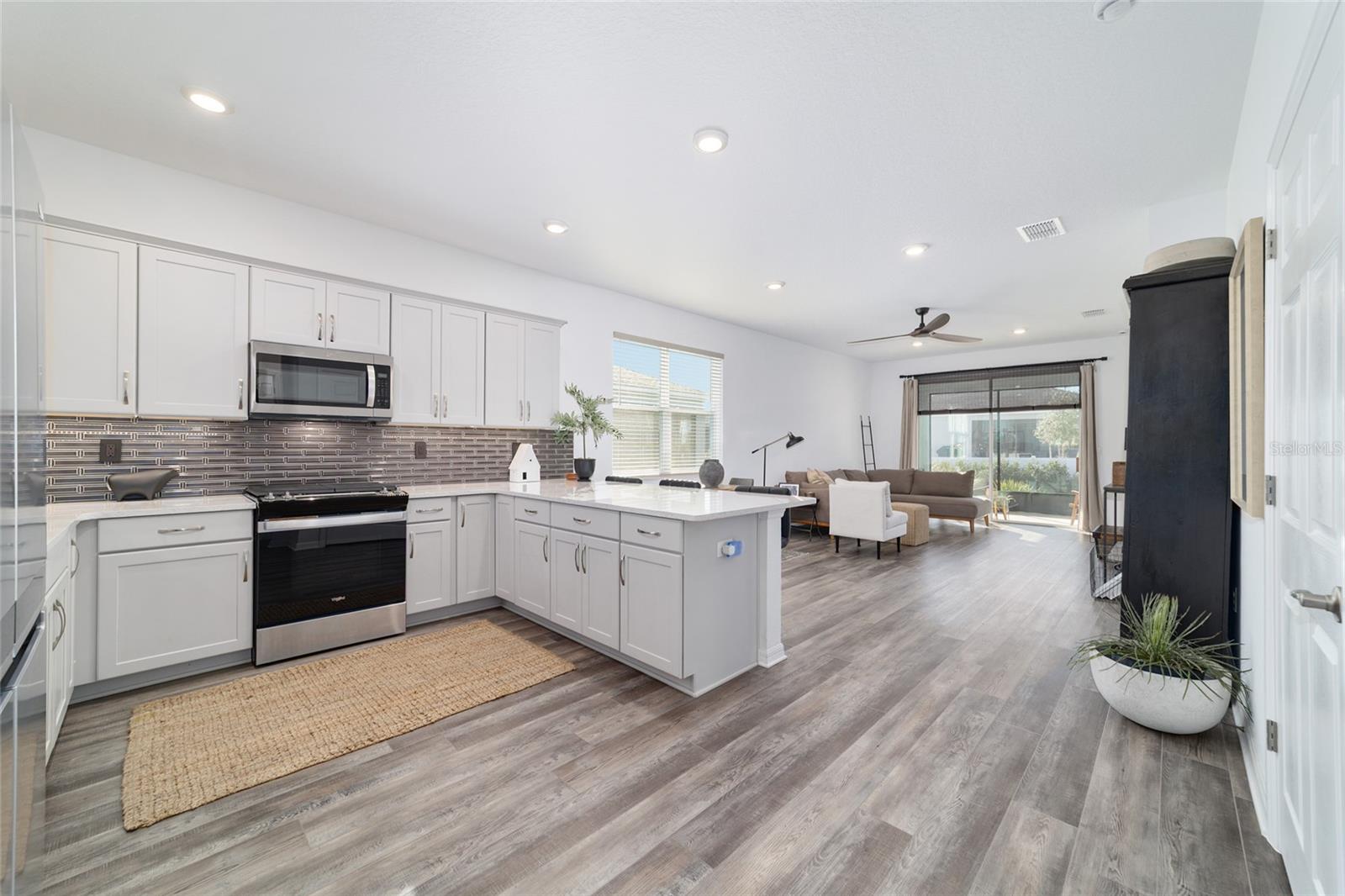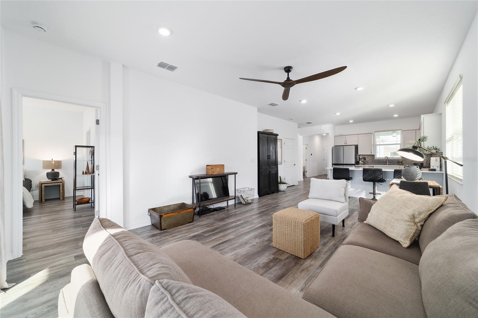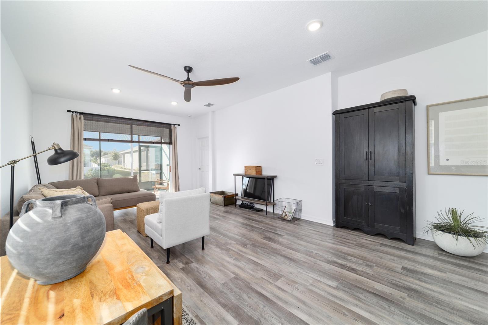 This stylish Tamar model is located in the Weybourne Landing neighborhood of On Top of the World and offers 2 bedrooms, 2 bathrooms, and a flex room with French doors, along with a 2-car garage. The open-concept layout features a foyer that leads into the kitchen, dining, and living areas. Luxury vinyl plank flooring throughout creates a bright, open feel. The kitchen includes 42" cabinetry with crown molding and a lazy Susan, under-cabinet LED lighting, quartz countertops, a breakfast bar, pantry, stainless steel Whirlpool appliances, natural gas cooking, and a tile backsplash. The primary suite offers a walk-in closet and an ensuite bath with dual quartz vanities, a linen closet, and a walk-in shower with floor-to-ceiling tile and a glass enclosure. A secondary bedroom is positioned at the front of the home, while the flex room provides additional space suitable for a home office, den, or hobby area. The guest bath includes a quartz vanity and a tub/shower combination. Additional features include custom window treatments, ceiling fans, landscaped grounds, and a screened lanai that extends the living space outdoors. Residents of On Top of the World enjoy access to a wide range of amenities, including golf courses, a driving range, clubhouses, fitness centers, indoor and outdoor pools, and numerous clubs and activities. The community offers convenient access to shopping, dining, medical facilities, the The World Equestrian Center, and downtown Ocala.
