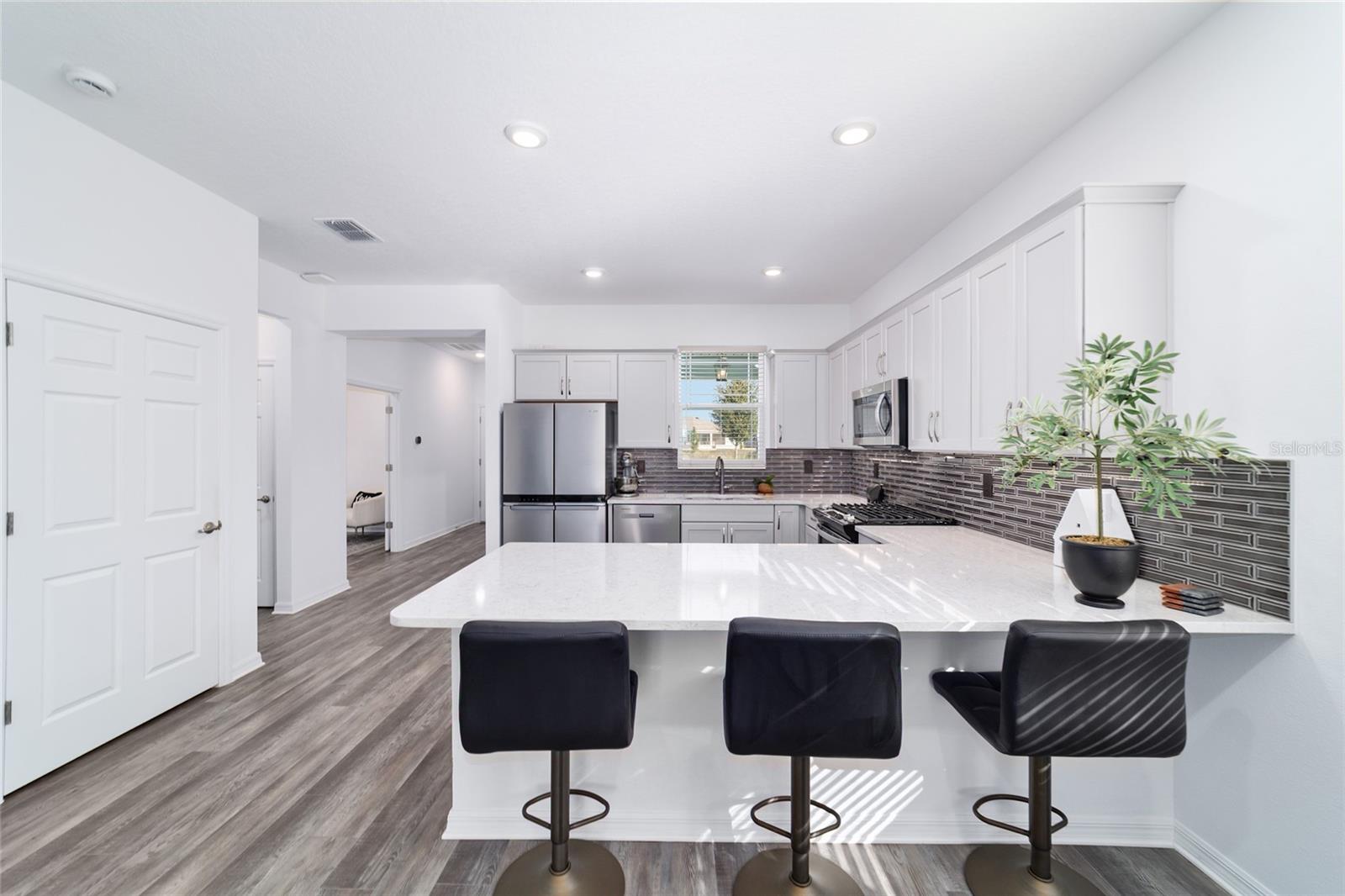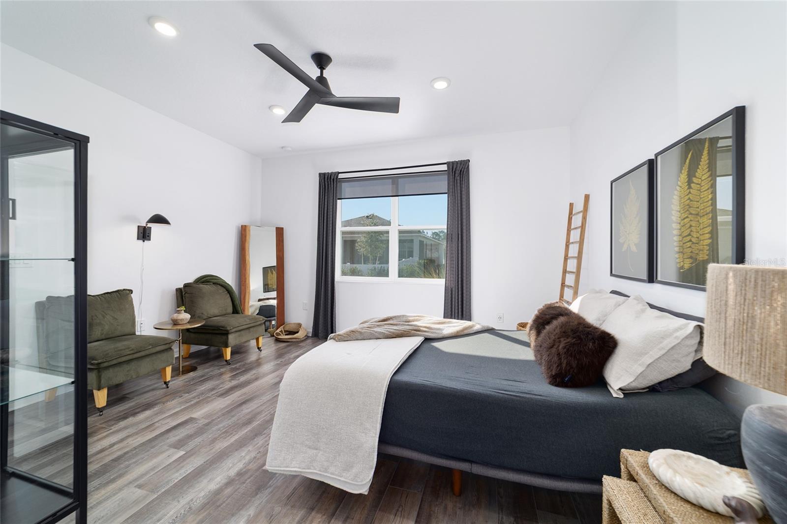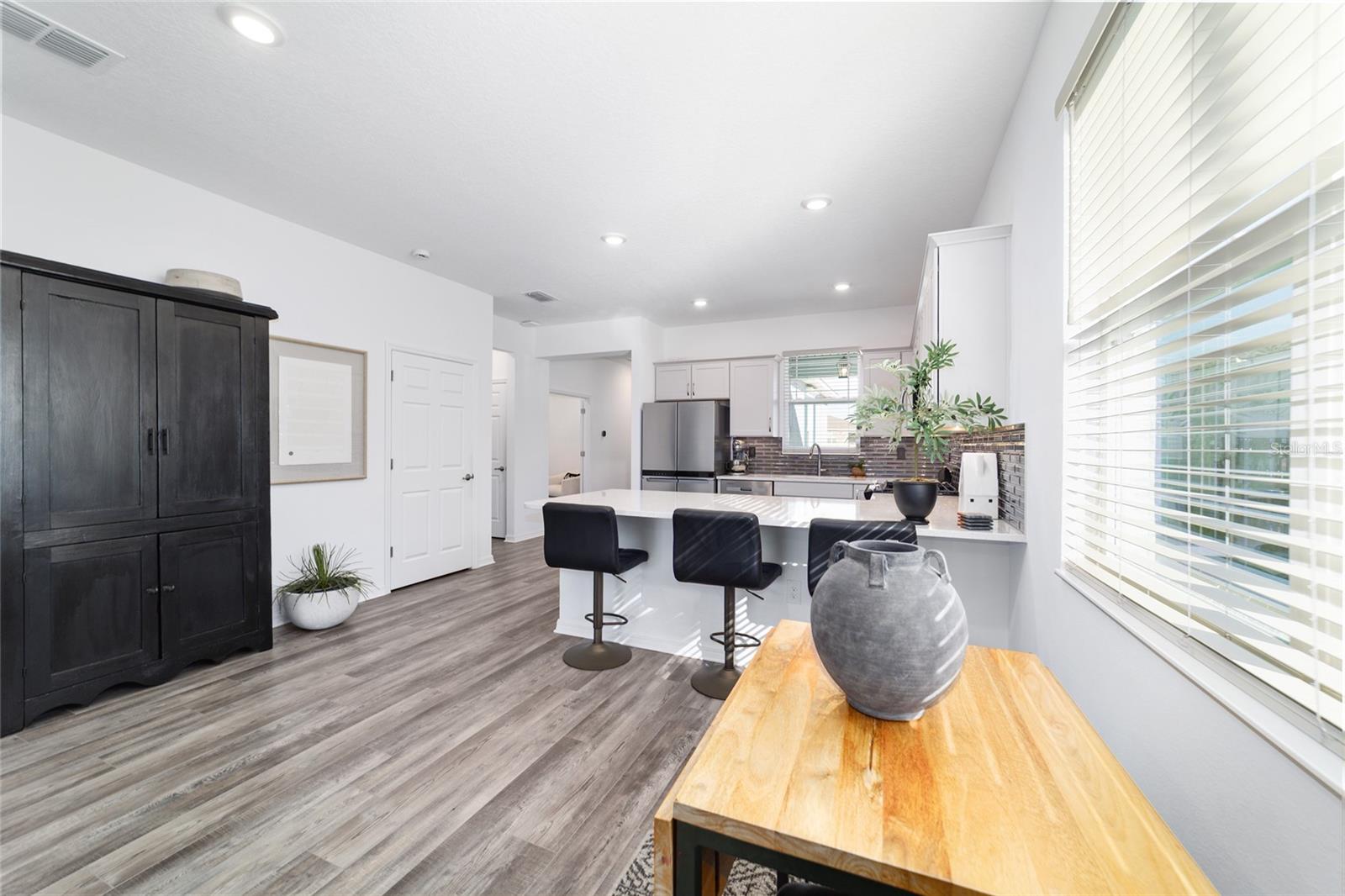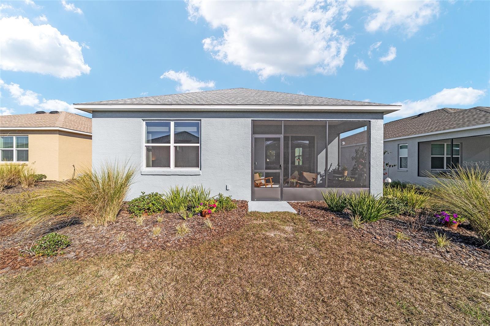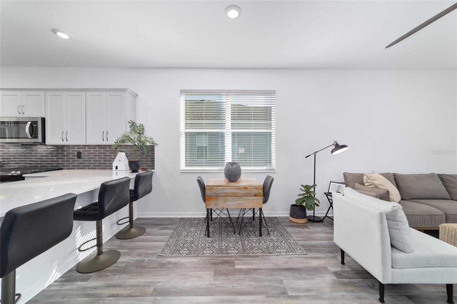 This stylish Tamar model is located in the Weybourne Landing neighborhood of On Top of the World and offers 2 bedrooms, 2 bathrooms, and a flex room with French doors, along with a 2-car garage. The open-concept layout features a foyer that leads into the kitchen, dining, and living areas. Luxury vinyl plank flooring throughout creates a bright, open feel. The kitchen includes 42" cabinetry with crown molding and a lazy Susan, under-cabinet LED lighting, quartz countertops, a breakfast bar, pantry, stainless steel Whirlpool appliances, natural gas cooking, and a tile backsplash. The primary suite offers a walk-in closet and an ensuite bath with dual quartz vanities, a linen closet, and a walk-in shower with floor-to-ceiling tile and a glass enclosure. A secondary bedroom is positioned at the front of the home, while the flex room provides additional space suitable for a home office, den, or hobby area. The guest bath includes a quartz vanity and a tub/shower combination. Additional features include custom window treatments, ceiling fans, landscaped grounds, and a screened lanai that extends the living space outdoors. Residents of On Top of the World enjoy access to a wide range of amenities, including golf courses, a driving range, clubhouses, fitness centers, indoor and outdoor pools, and numerous clubs and activities. The community offers convenient access to shopping, dining, medical facilities, the The World Equestrian Center, and downtown Ocala.
