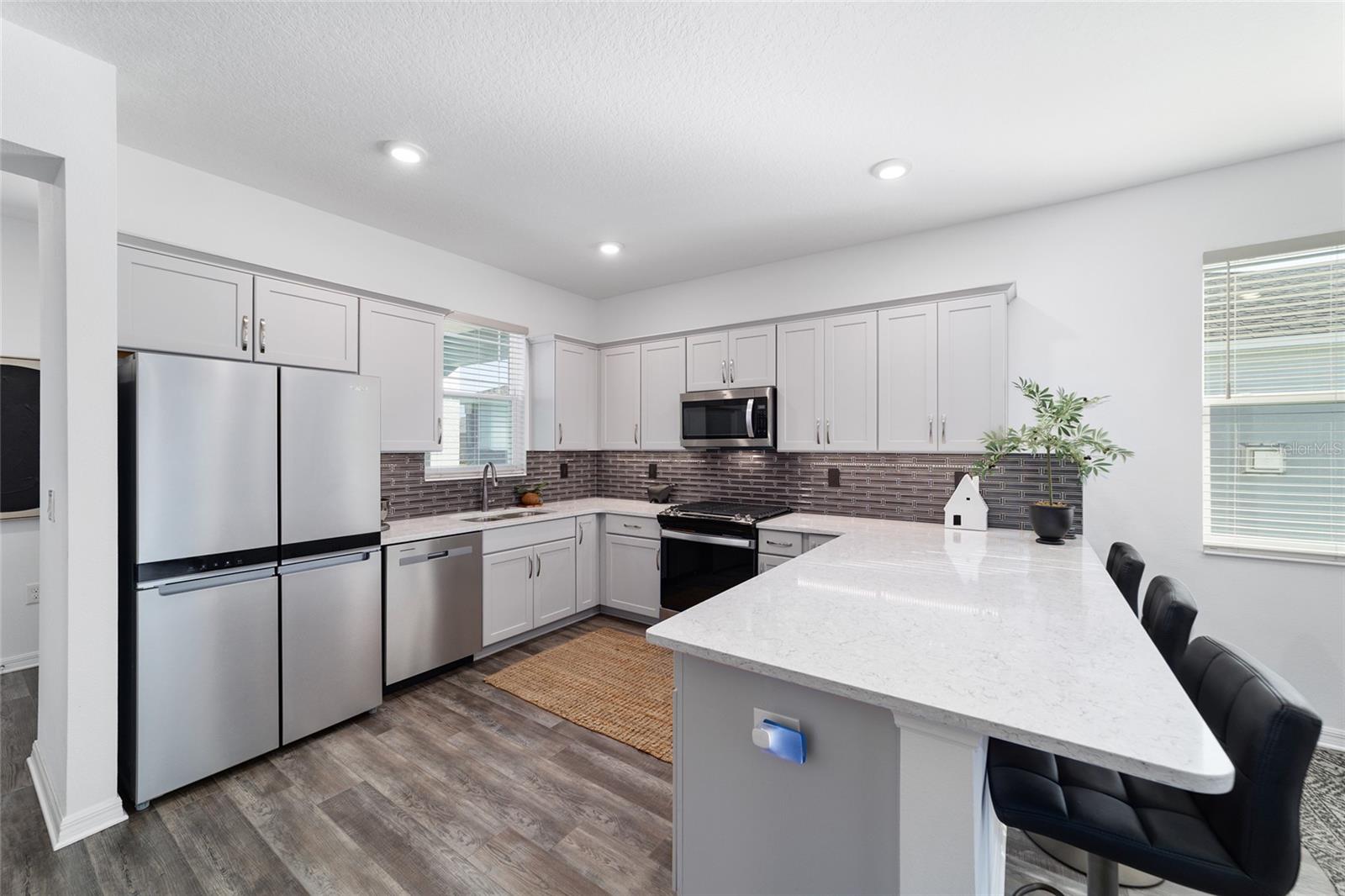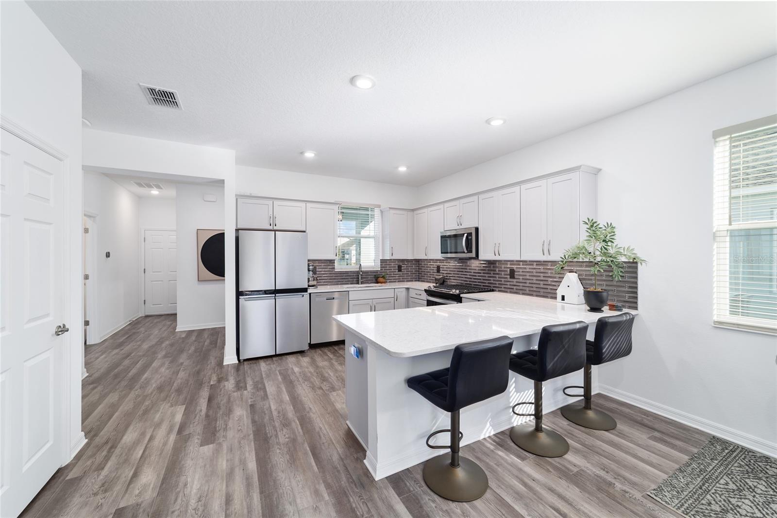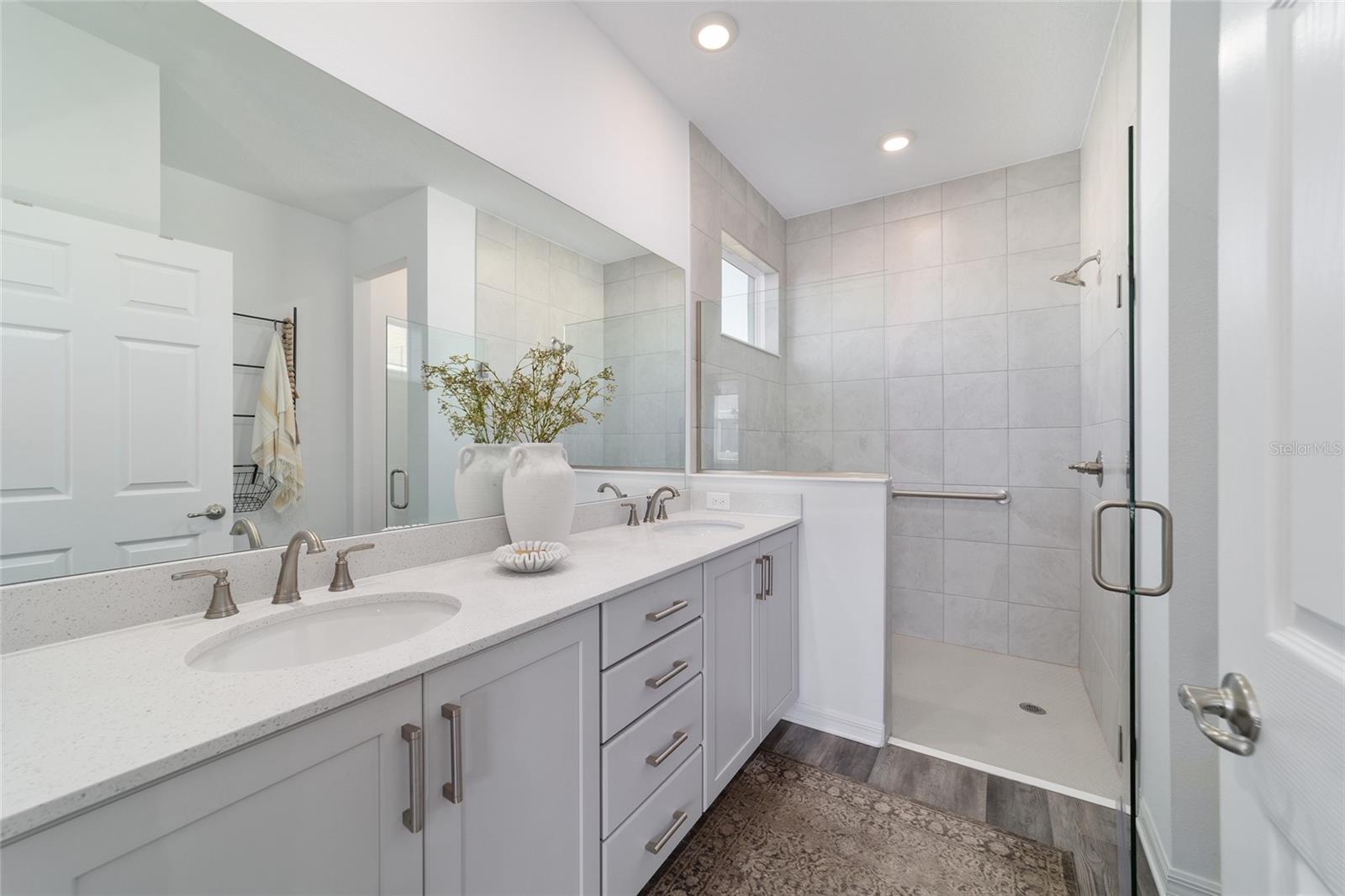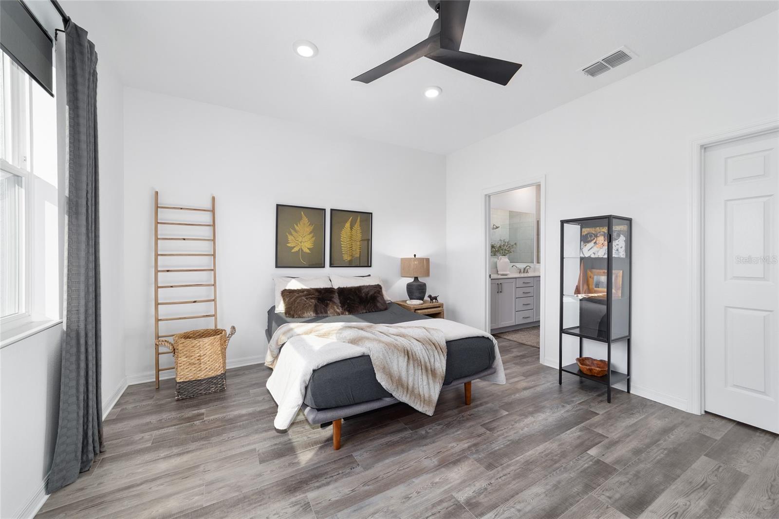 This stylish Tamar model is located in the Weybourne Landing neighborhood of On Top of the World and offers 2 bedrooms, 2 bathrooms, and a flex room with French doors, along with a 2-car garage. The open-concept layout features a foyer that leads into the kitchen, dining, and living areas. Luxury vinyl plank flooring throughout creates a bright, open feel. The kitchen includes 42" cabinetry with crown molding and a lazy Susan, under-cabinet LED lighting, quartz countertops, a breakfast bar, pantry, stainless steel Whirlpool appliances, natural gas cooking, and a tile backsplash. The primary suite offers a walk-in closet and an ensuite bath with dual quartz vanities, a linen closet, and a walk-in shower with floor-to-ceiling tile and a glass enclosure. A secondary bedroom is positioned at the front of the home, while the flex room provides additional space suitable for a home office, den, or hobby area. The guest bath includes a quartz vanity and a tub/shower combination. Additional features include custom window treatments, ceiling fans, landscaped grounds, and a screened lanai that extends the living space outdoors. Residents of On Top of the World enjoy access to a wide range of amenities, including golf courses, a driving range, clubhouses, fitness centers, indoor and outdoor pools, and numerous clubs and activities. The community offers convenient access to shopping, dining, medical facilities, the The World Equestrian Center, and downtown Ocala.