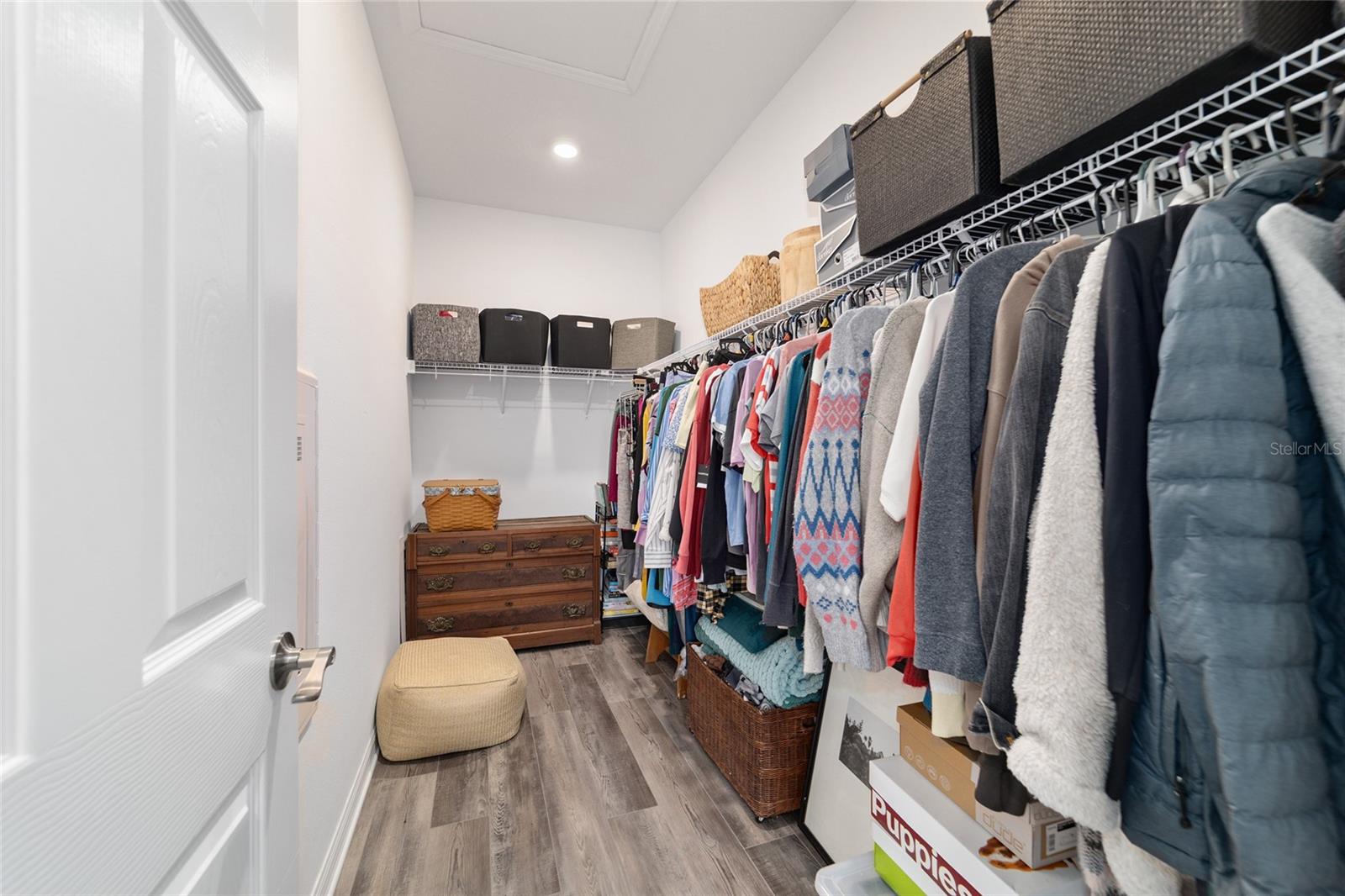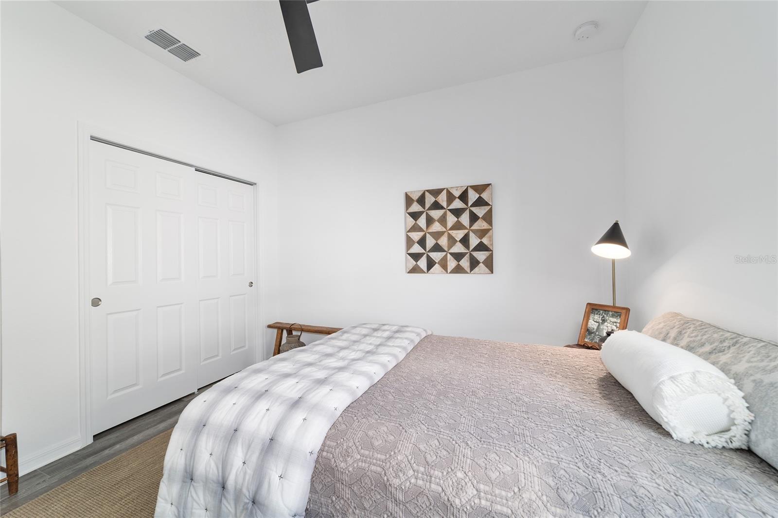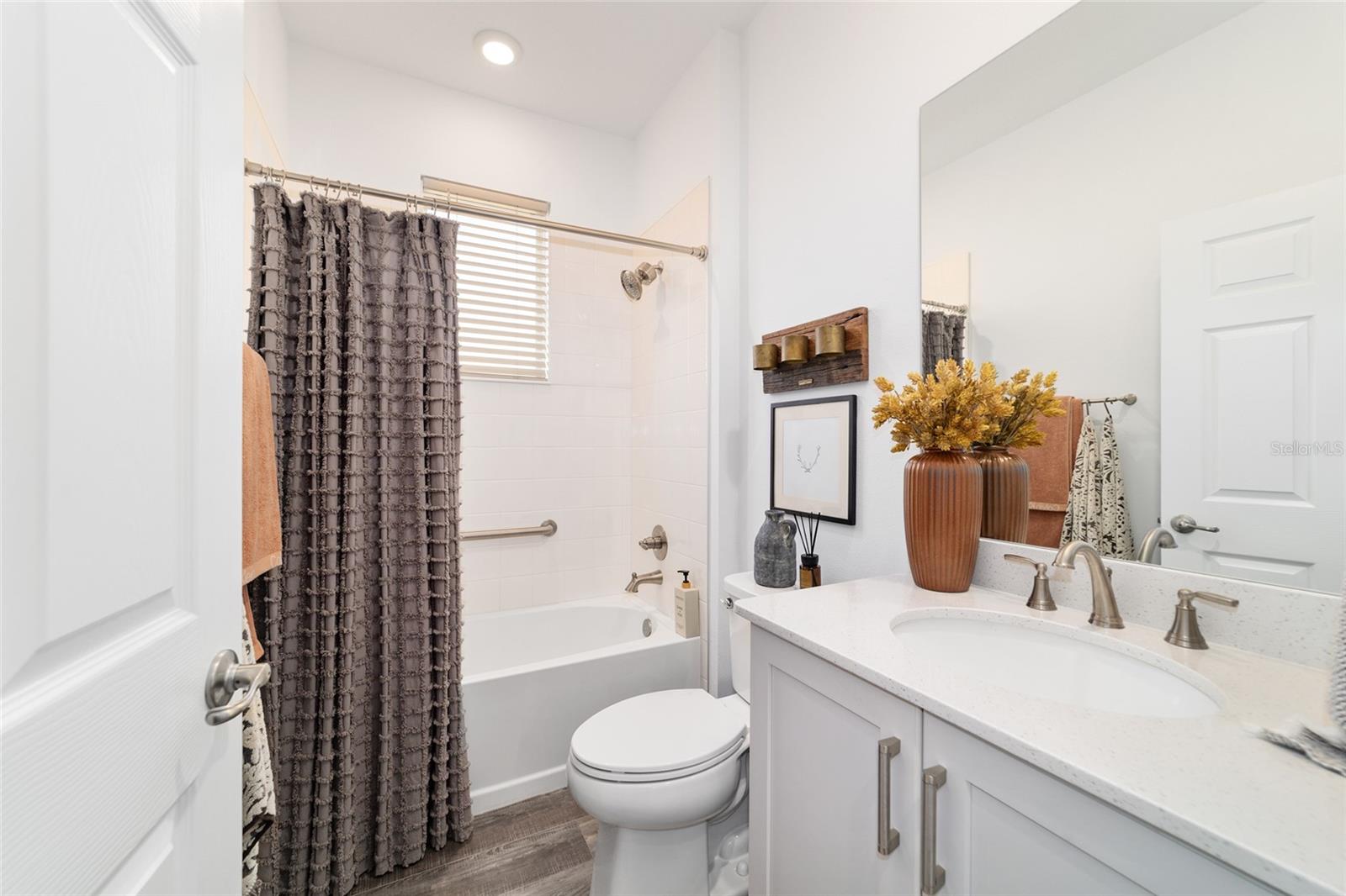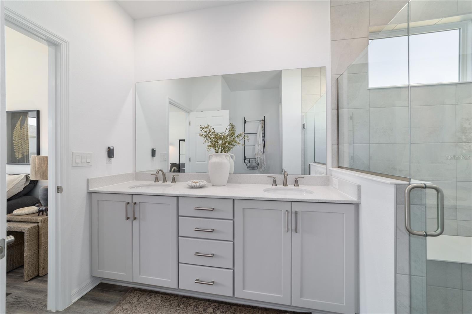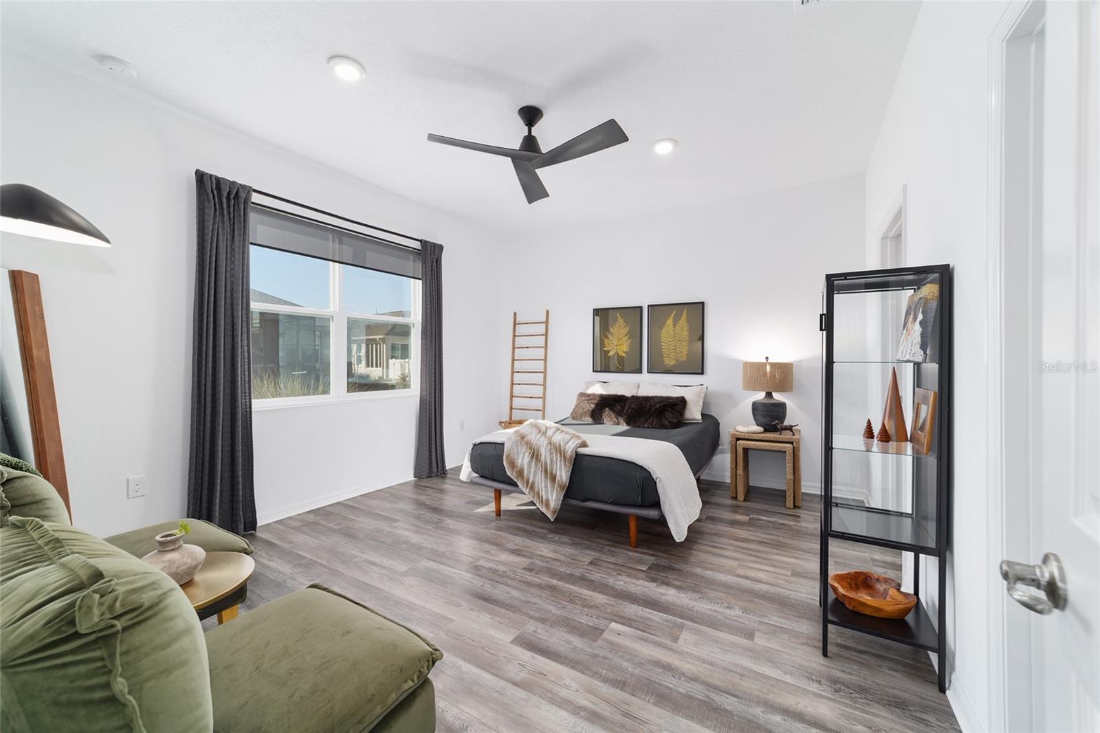 This stylish Tamar model is located in the Weybourne Landing neighborhood of On Top of the World and offers 2 bedrooms, 2 bathrooms, and a flex room with French doors, along with a 2-car garage. The open-concept layout features a foyer that leads into the kitchen, dining, and living areas. Luxury vinyl plank flooring throughout creates a bright, open feel. The kitchen includes 42" cabinetry with crown molding and a lazy Susan, under-cabinet LED lighting, quartz countertops, a breakfast bar, pantry, stainless steel Whirlpool appliances, natural gas cooking, and a tile backsplash. The primary suite offers a walk-in closet and an ensuite bath with dual quartz vanities, a linen closet, and a walk-in shower with floor-to-ceiling tile and a glass enclosure. A secondary bedroom is positioned at the front of the home, while the flex room provides additional space suitable for a home office, den, or hobby area. The guest bath includes a quartz vanity and a tub/shower combination. Additional features include custom window treatments, ceiling fans, landscaped grounds, and a screened lanai that extends the living space outdoors. Residents of On Top of the World enjoy access to a wide range of amenities, including golf courses, a driving range, clubhouses, fitness centers, indoor and outdoor pools, and numerous clubs and activities. The community offers convenient access to shopping, dining, medical facilities, the The World Equestrian Center, and downtown Ocala.