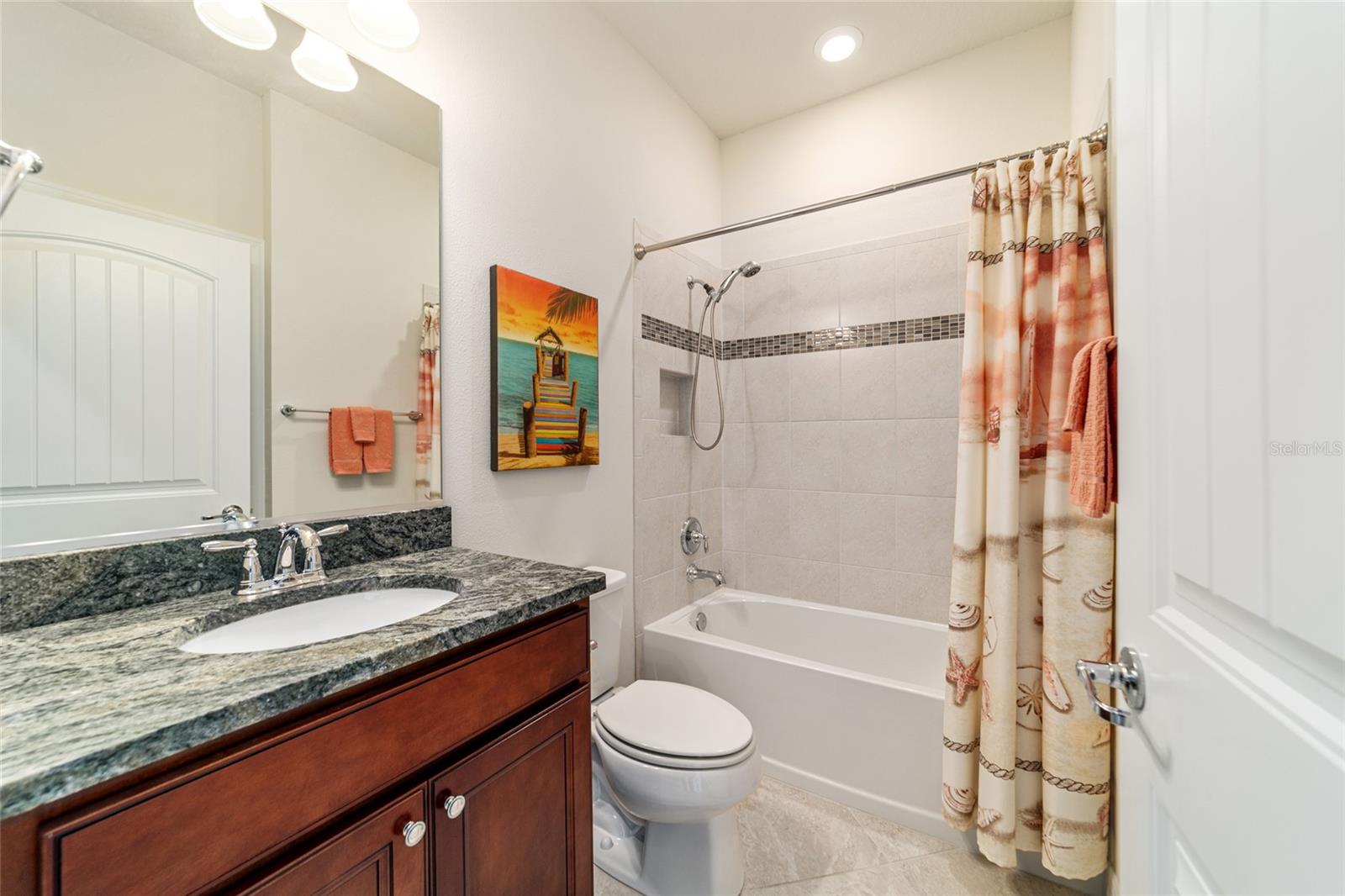 Seize the chance to own this gorgeous Abbeyville model home in the Longleaf neighborhood of Stone Creek, a premier 55-plus gated golf course community known impressive resort-style amenities. This bright and open living plan offers a relaxed and carefree lifestyle with two bedrooms, two bathrooms, a versatile flex room, and diagonally laid tile flooring throughout the main living area. The expansive gathering room is great for entertaining, while a casual dining room with sliders seamlessly connects to the outdoors. The outdoor living area includes a screened Florida room and an adjoining patio, providing an ideal setting for year-round relaxation or hosting friends and family. The chef’s kitchen boasts a premium built-in KitchenAid appliance package, including a cooktop with a wooden range hood and a spacious center island that offers generous space for food prep and casual dining. Granite countertops, a stylish tiled backsplash, and a convenient pantry complete the space and deliver the ease and functionality you have been searching for. The owner’s suite is a peaceful retreat with a spacious walk-in closet and an impressive en suite bath. The bath features a glass-enclosed step-in shower with decorative glass tile accents, a transom window that brings in natural light, a double sink vanity, and a private water closet. Additional highlights include a spacious laundry room with a laundry tub and large storage area, and a two-car garage with an eye-pleasing epoxy flooring finish. These thoughtful features ensure both convenience and practicality throughout the home. Embrace the exceptional lifestyle of this vibrant community, featuring a 24/7 staffed gated entrance for security and peace of mind. Luxury-inspired amenities include heated pools, a state-of-the-art fitness center, a spa, and relaxing hot tubs and saunas. Stay active with pickleball, bocce, tennis, and a softball field, while a dedicated lifestyle staff curates entertainment, activities, and special events to foster connections. Just beyond the gates, enjoy a golf course, pro shop, and restaurant—perfect for socializing and unwinding. Make your move today and experience resort-style living at its finest!