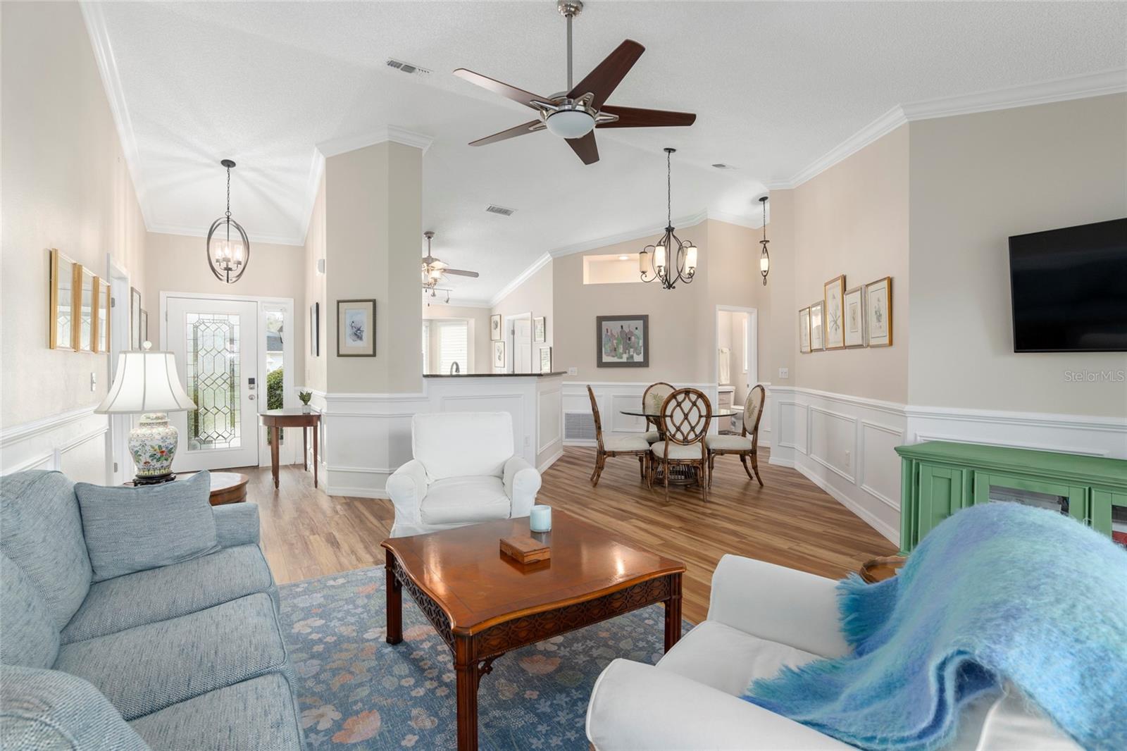 Discover your dream lifestyle in this meticulously updated Royal Model home, nestled within the prestigious gated community of Ocala Palms, just 2 miles from the World Equestrian Center! This stunning 2-bedroom, 2-bathroom residence boasts 1,534 sq ft of light-filled, open-concept living. Enjoy a prime location with easy access to the WEC, shopping, and dining. Recent upgrades include brand NEW wood flooring, NEW interior paint throughout the home, modern closet systems, an epoxy garage floor, new Low E glass windows in the breakfast nook, and new custom kitchen island molding. Cathedral ceilings and a spacious great room create an airy atmosphere, while the split bedroom layout provides privacy. The chef's kitchen features solid wood cabinets, granite countertops, stainless steel appliances, eating space and is open to the family room, perfect for entertaining! The breakfast nook has an adorable bay window with new Low E glass windows and views of the beautiful landscaped front yard. The spacious primary suite offers a walk-in closet and an ensuite bathroom with a garden tub, dual sinks, and a glass shower. Triple sliders lead out to the beautiful glass enclosed Florida Room under Heat & Air, which leads to a newer Birdcage Enclosure (2020) overlooking the gorgeous landscaped, tree shaded yard with gorgeous backyard views! Comfort and convenience are ensured with a 2016 Carrier AC with WiFi climate control and a 2011 architectural 30-year shingle roof. Indulge in the community's 18-hole golf course, 19,000 sq ft clubhouse, fitness center, Olympic-sized pool, hot tub, arts & crafts studio, pickleball, bocce ball, and a vibrant social scene. This meticulously maintained, move-in-ready home offers an exceptional opportunity to own a piece of paradise in the heart of Florida's horse country! Don't miss out!