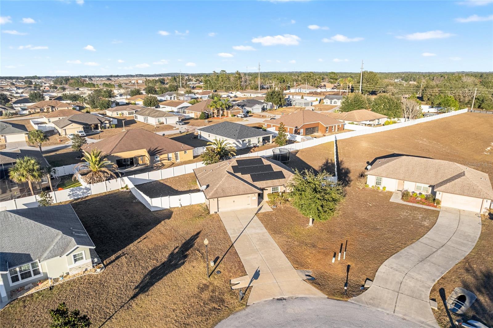Tucked away on a quiet cul-de-sac in the Meadow Glenn community of Ocala, this well-cared-for Fallon model offers comfortable living on an oversized .36-acre lot with a thoughtful blend of style, space, and functionality. With three bedrooms, two baths, and a two-car garage, this home is designed for both everyday living and easy entertaining. From the moment you enter, the welcoming foyer with wainscoting detail and a coat closet with custom built-ins sets the tone. Vaulted ceilings and tile flooring throughout the main living areas enhance the open, airy feel, while the bedrooms feature plush carpeting for added comfort. The kitchen flows seamlessly into the living and dining areas and is beautifully appointed with granite countertops, staggered cabinetry with crown molding, stainless steel appliances, and a brand-new dishwasher. Pendant lighting above the breakfast bar and additional lighting over the dining area create a warm, inviting atmosphere, while the walk-in pantry provides ample storage. The living room offers a ceiling fan, TV mount, and sliding glass doors that open to the covered back porch, perfect for indoor-outdoor living. The spacious primary suite serves as a private retreat, featuring a ceiling fan, blinds, a large walk-in closet, and an ensuite bath with double granite vanities, a linen closet, and a tiled, glass-enclosed walk-in shower with built-in bench. Two additional bedrooms are comfortably sized and include ceiling fans, blinds, and ample closet space. The second bathroom is equally well finished with a granite vanity, tiled tub/shower, and its own linen closet, complemented by additional hallway linen storage. The laundry room adds everyday convenience with tile flooring, a utility sink with lower cabinet, and a new Whirlpool washer and Kenmore dryer that convey with the home. Step outside to enjoy the covered back porch with ceiling fan, overlooking a fully vinyl-fenced backyard with both double and single gates, offering flexibility for pets, storage, or recreational use. Gutters surround the home, and a Ring doorbell adds an extra layer of security. Set on a generously sized lot in a peaceful setting, this home offers the space, features, and added benefit of solar-powered efficiency you’ve been looking for! Schedule your private showing today.
