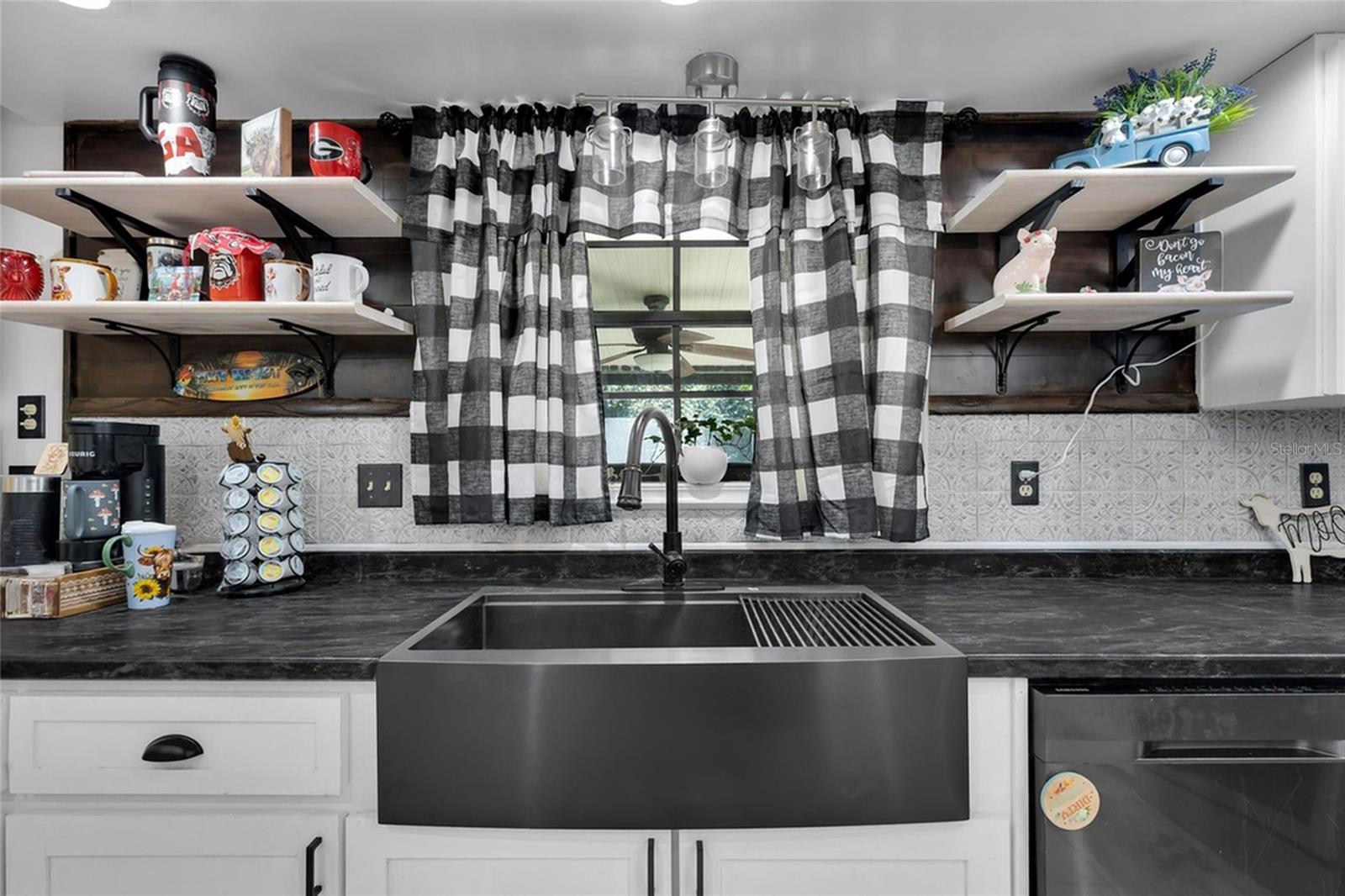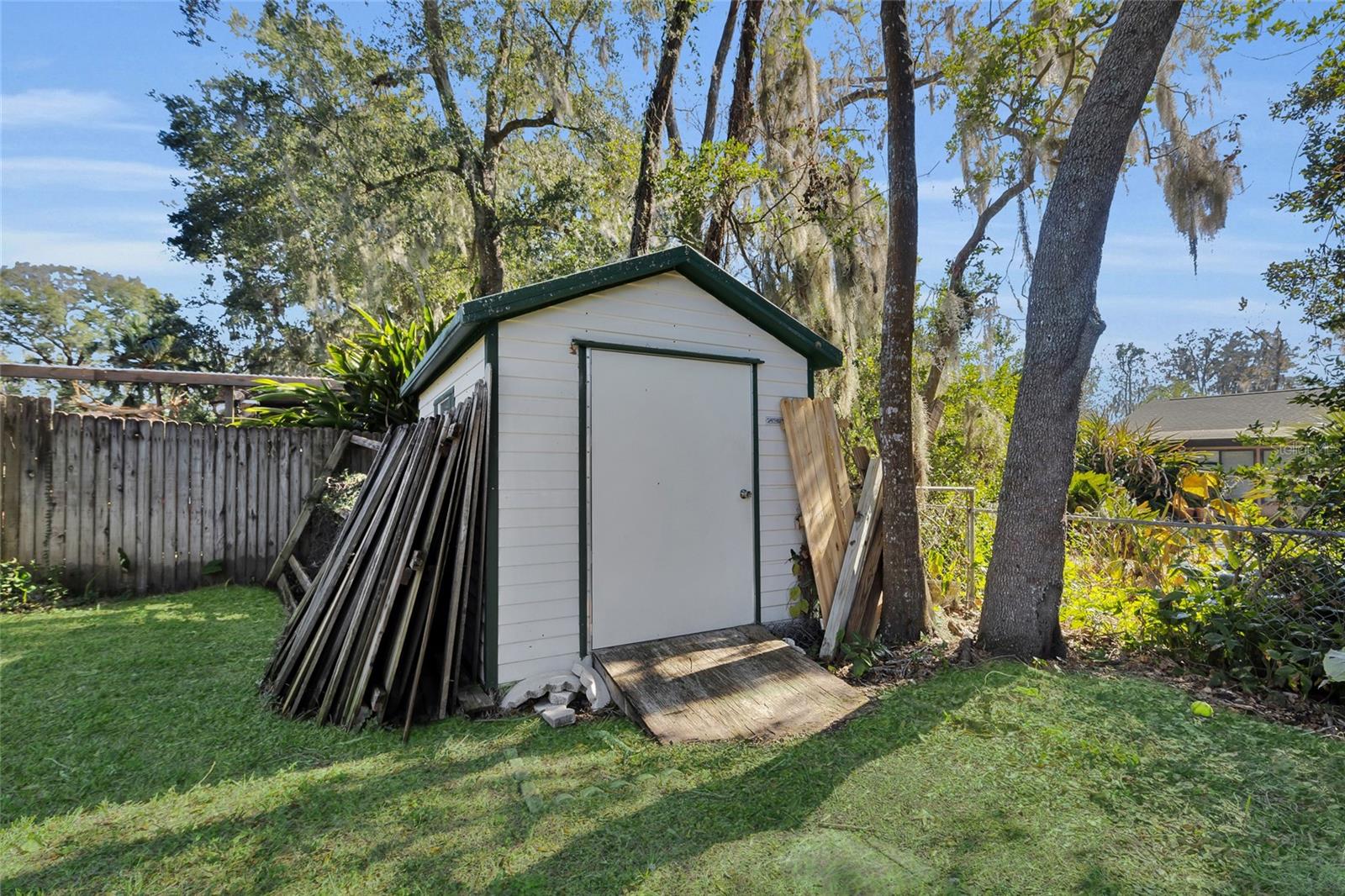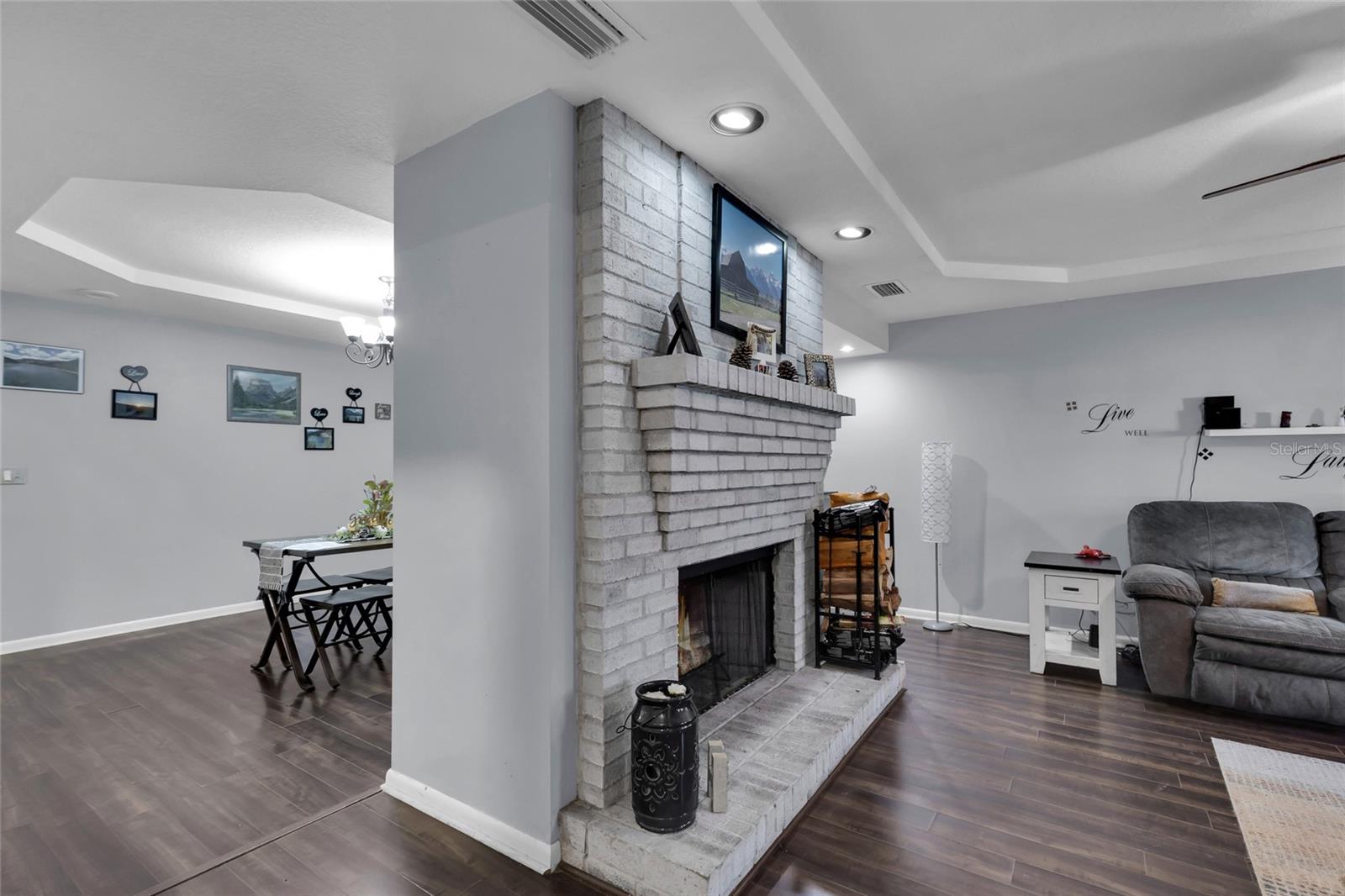 Welcome home to this beautifully appointed 4-bedroom, 2-bath residence tucked away on a quiet cul-de-sac. Step inside to a welcoming tile foyer that opens to a light-filled living room featuring tray ceilings and a cozy wood burning brick fireplace, perfect for relaxing or entertaining. A separate dining room, also accented with tray ceilings, adds an elegant touch for gatherings. The kitchen is a standout with white shaker cabinets, a farmhouse sink, and granite countertops, offering both style and functionality. Ceiling fans throughout the home provide year-round comfort, while the spacious laundry room with built-in cabinets adds exceptional convenience. The large primary suite is a true retreat, complete with its own fireplace and a generous walk-in closet. Additional bedrooms are well-sized and thoughtfully designed. Outside, enjoy a screened back lanai overlooking a large, privacy-fenced backyard, ideal for outdoor living and entertaining. A side-entry garage enhances curb appeal and functionality. This home seamlessly blends comfort, charm, and thoughtful design in a desirable location—don’t miss the opportunity to make it yours. The backyard also includes a shed with electric for added functionality. Solar panels will be paid off at closing, providing energy efficiency and long-term savings.