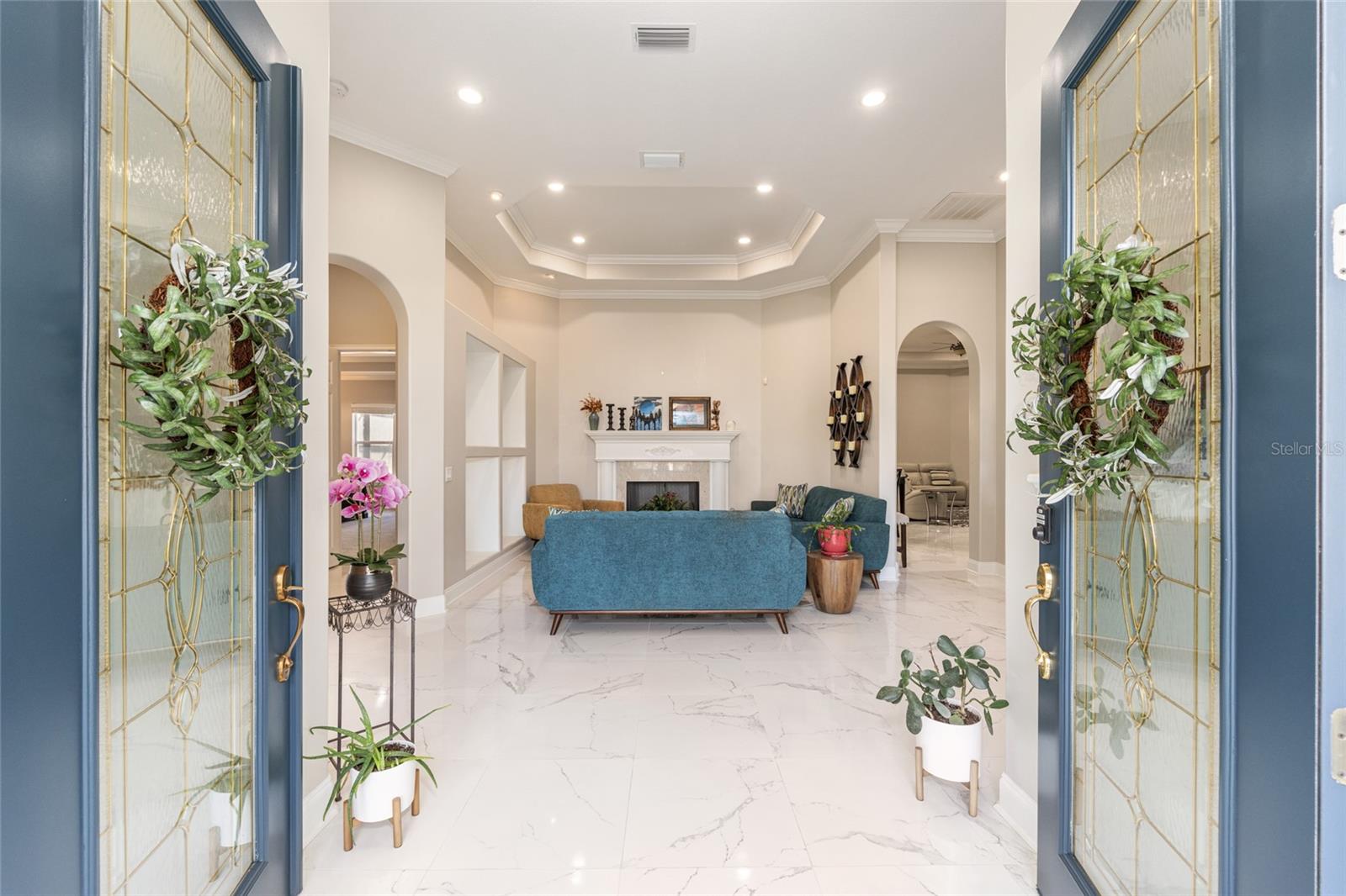 Located on a quiet cul-de-sac in the desirable Cedars of Bellechase, this impressive 4,090 sq ft home offers 4 bedrooms, 3 bathrooms, an office, bonus room, and 3-car garage on a spacious lot, blending elegant design with everyday functionality. Double entry doors open to a welcoming foyer with a formal sitting area featuring a tray ceiling, gas fireplace, crown molding, and tile flooring, while the formal dining room also showcases tray ceilings and crown detail. The chef's kitchen is the heart of the home with granite countertops, stainless built-in oven and microwave, cooktop, a large center island, and an oversized walk-in pantry with shelving, flowing seamlessly into the living area with soaring ceilings, tray detail, fan, and built-in speakers. Two secondary bedrooms are thoughtfully connected by a Jack-and-Jill bathroom, offering convenience and privacy, while the additional guest bedroom is well positioned near a full bath. Pocket sliders lead to an enclosed Florida room and a stunning outdoor retreat complete with a heated gas pool and spa, expansive paver patio, screened enclosure, pergola, open yard, and fresh landscaping. The primary suite is a true escape with double tray ceilings, crown molding, private access to the Florida room, room-darkening shades, and custom his-and-her walk-in closets, complemented by a spa-like bath with double granite vanities, soaker tub, and a multi-head walk-in shower. Additional highlights include a front office with French doors, a spacious bonus room with built-in speakers, an 85-inch TV, and pool table included, updated HVAC systems (2020), a new roof (2023), a well-appointed laundry and mudroom, whole-home security system, tankless and traditional water heaters, and an epoxy-floored 3-car garage with abundant storage- this home delivers space, privacy, and upscale living in a sought-after setting.