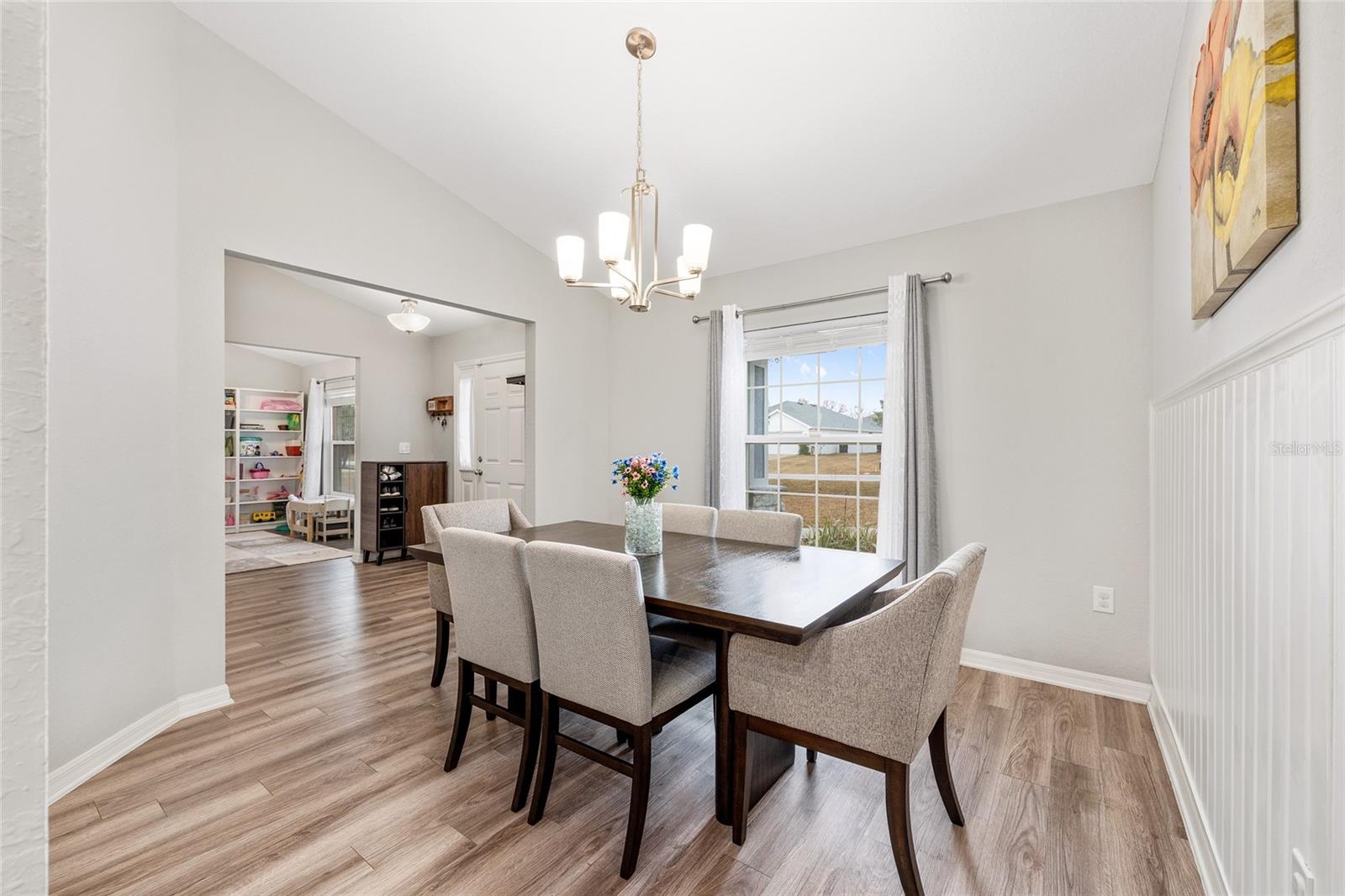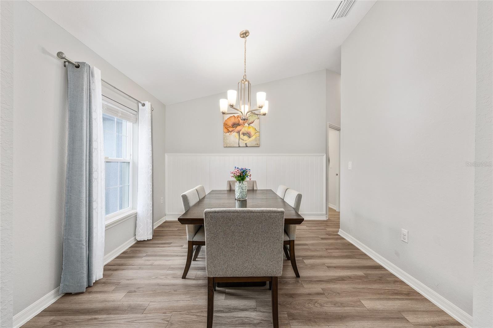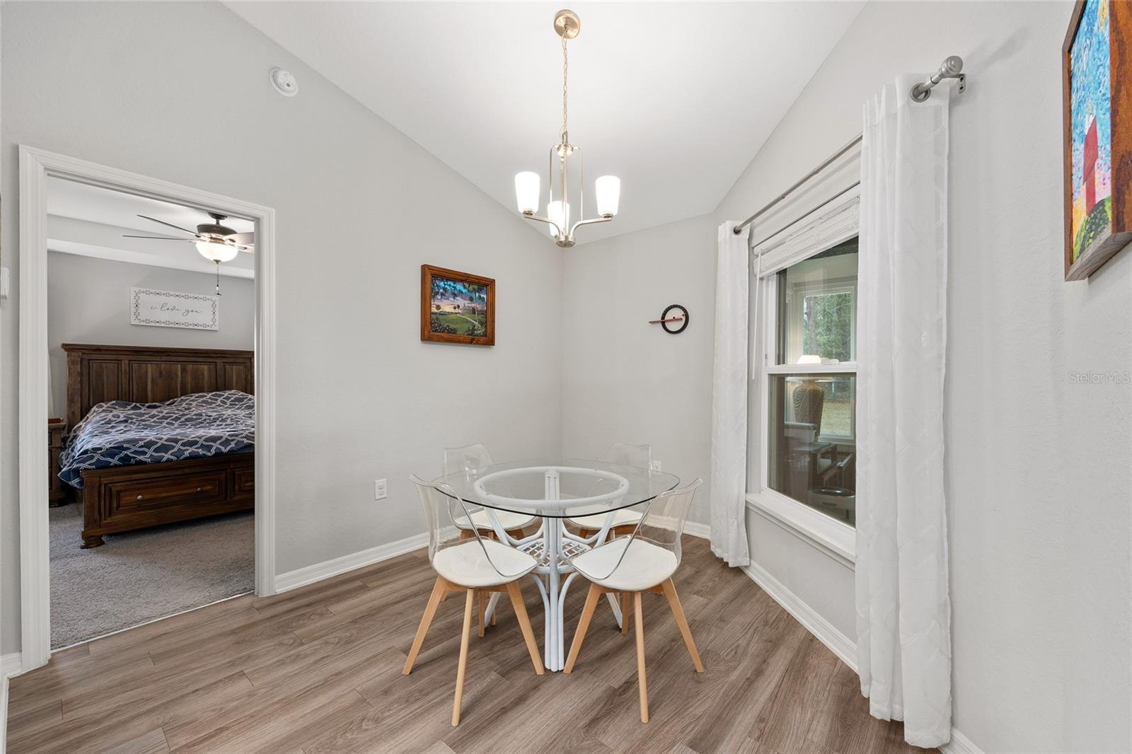 Set on over half an acre in the Whispering Pine neighborhood of Kingsland Country Estates, this 3-bedroom, 2-bath home blends comfort, style, and functionality. A covered front porch with stone beam accents welcomes you in, while gutters and irrigation make everyday living easy. Step inside to soaring ceilings and light-filled living spaces with durable LVP flooring throughout the main areas. The den and formal dining area are perfect for entertaining, and the living room's vaulted ceiling and fan enhances the open, airy feel. Sliding glass doors lead to a bright sunroom equipped with a mini-split AC, creating a versatile year round space perfect for relaxing, hosting guests, or enjoying the outdoors in comfort. The kitchen features stainless steel appliances, a walk-in pantry, warm toned cabinetry, and an eat-in area with bar seating. The laundry room includes upper cabinets and a Samsung washer and dryer. The split bedroom layout provides privacy, with the master suite featuring a tray ceiling, ceiling fan, and walk-in closet, while the en suite bath offers double sinks with a dedicated vanity area, a soaker tub, and a walk-in shower. The second bathroom includes a single-sink vanity and a tiled tub/shower, with an additional door providing convenient access from the sunroom. Both additional bedrooms are spacious, bright, carpeted, and each includes a ceiling fan and closet. Step outside to a fenced backyard backed by woods for added privacy and enjoy the convenience of a 2-car garage with side yard access. With its open layout, thoughtful updates, impressive sunroom with mini-split AC, and peaceful setting on over half an acre, this private, move in ready home truly checks all the boxes! Call for your private showing today!