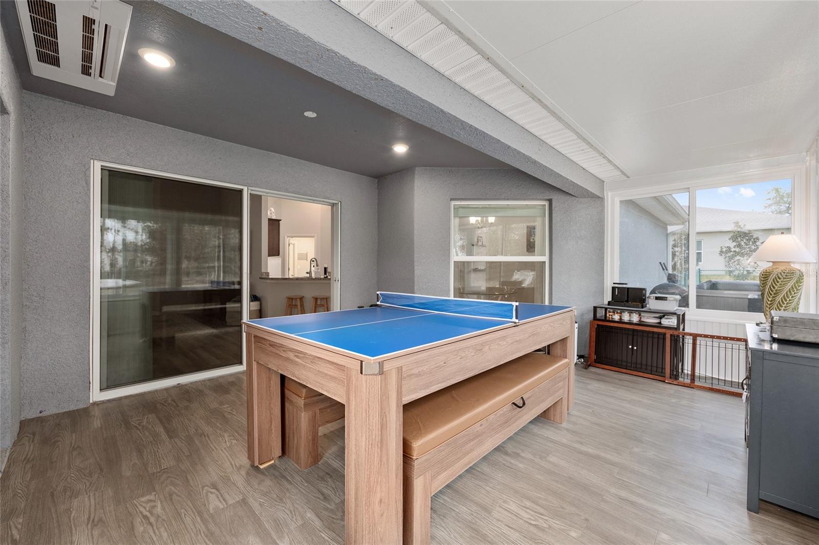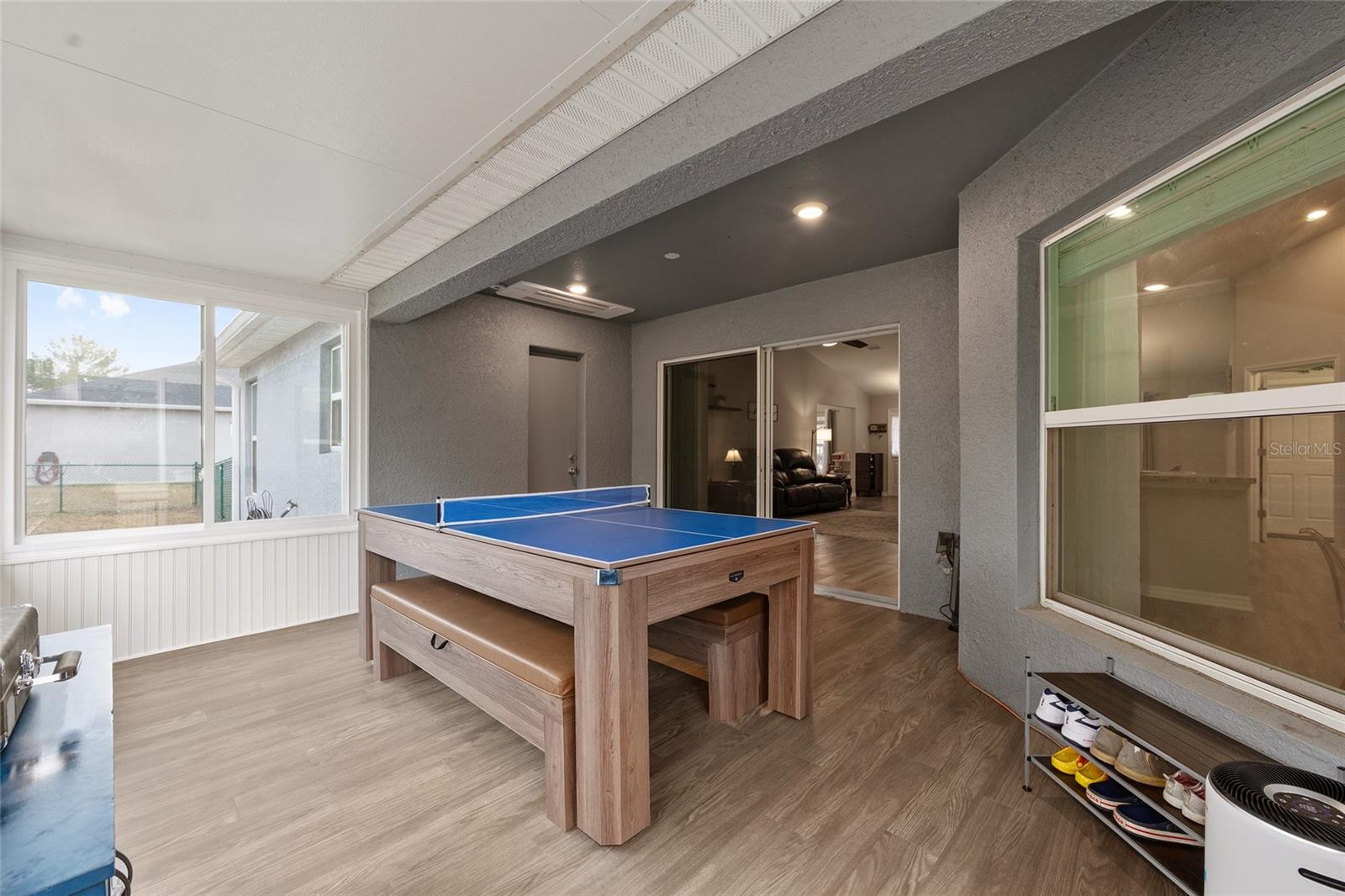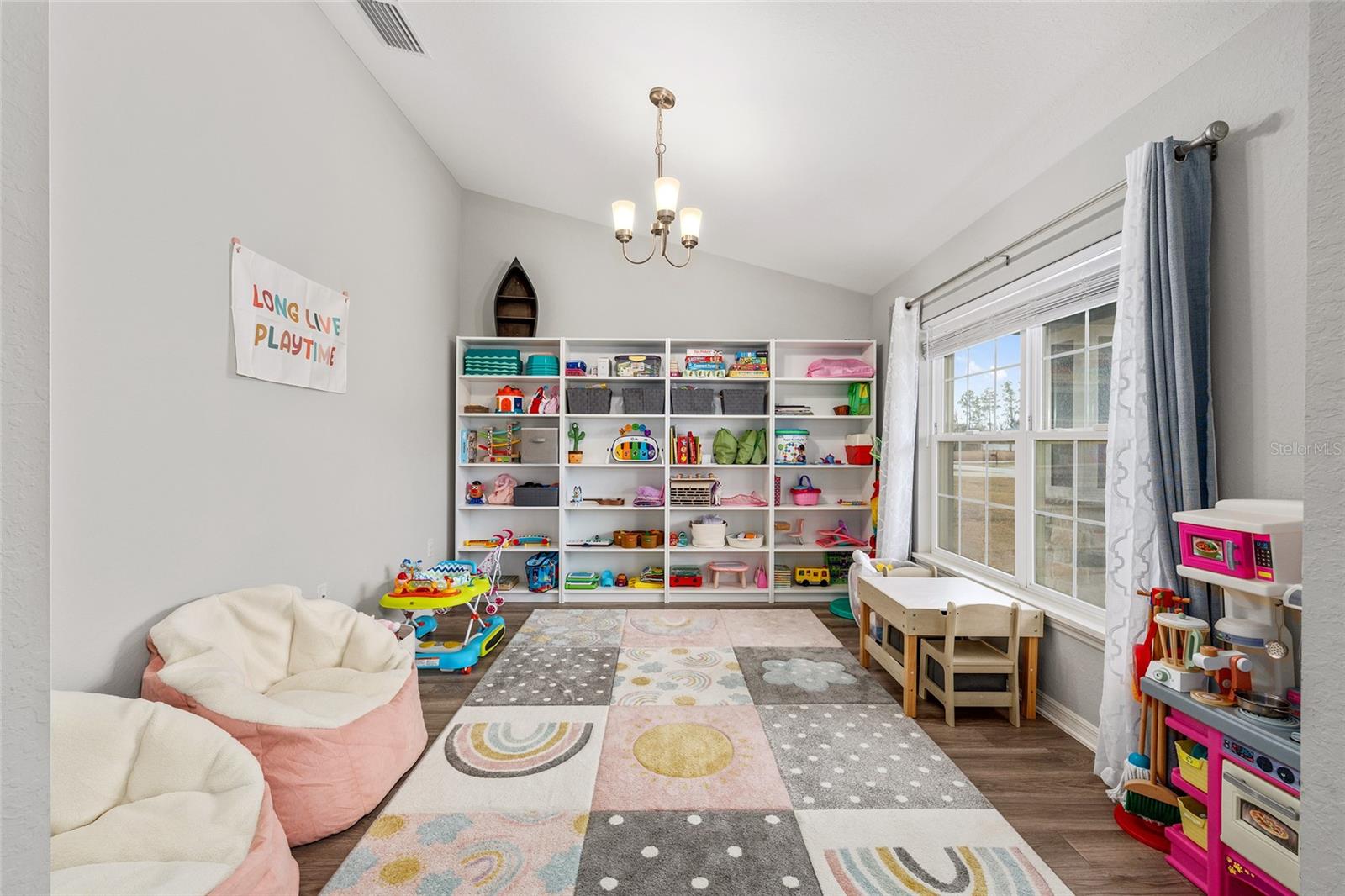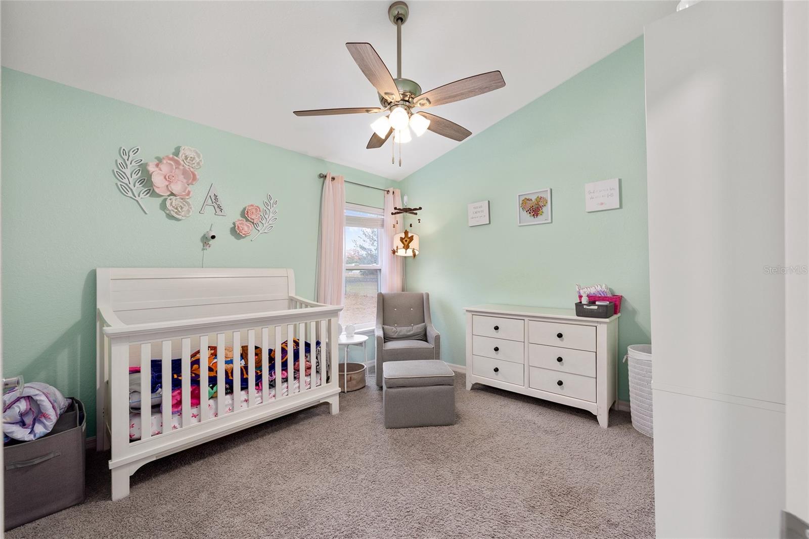 Set on over half an acre in the Whispering Pine neighborhood of Kingsland Country Estates, this 3-bedroom, 2-bath home blends comfort, style, and functionality. A covered front porch with stone beam accents welcomes you in, while gutters and irrigation make everyday living easy. Step inside to soaring ceilings and light-filled living spaces with durable LVP flooring throughout the main areas. The den and formal dining area are perfect for entertaining, and the living room's vaulted ceiling and fan enhances the open, airy feel. Sliding glass doors lead to a bright sunroom equipped with a mini-split AC, creating a versatile year round space perfect for relaxing, hosting guests, or enjoying the outdoors in comfort. The kitchen features stainless steel appliances, a walk-in pantry, warm toned cabinetry, and an eat-in area with bar seating. The laundry room includes upper cabinets and a Samsung washer and dryer. The split bedroom layout provides privacy, with the master suite featuring a tray ceiling, ceiling fan, and walk-in closet, while the en suite bath offers double sinks with a dedicated vanity area, a soaker tub, and a walk-in shower. The second bathroom includes a single-sink vanity and a tiled tub/shower, with an additional door providing convenient access from the sunroom. Both additional bedrooms are spacious, bright, carpeted, and each includes a ceiling fan and closet. Step outside to a fenced backyard backed by woods for added privacy and enjoy the convenience of a 2-car garage with side yard access. With its open layout, thoughtful updates, impressive sunroom with mini-split AC, and peaceful setting on over half an acre, this private, move in ready home truly checks all the boxes! Call for your private showing today!